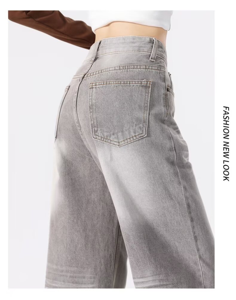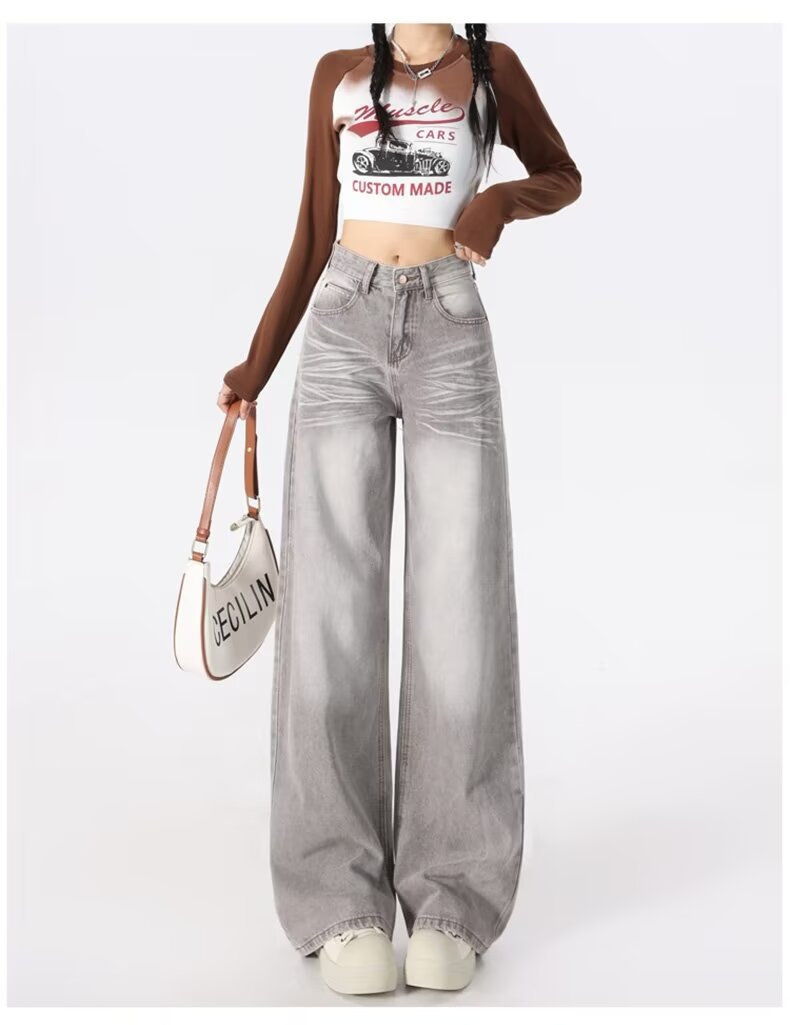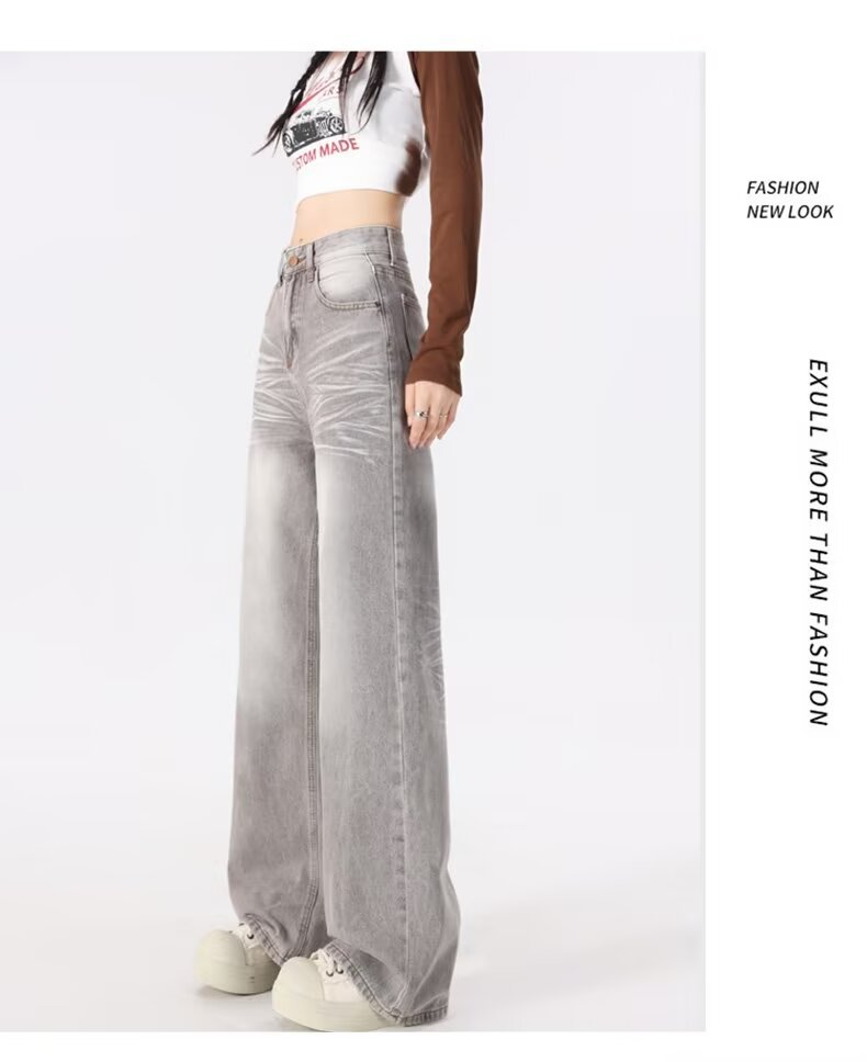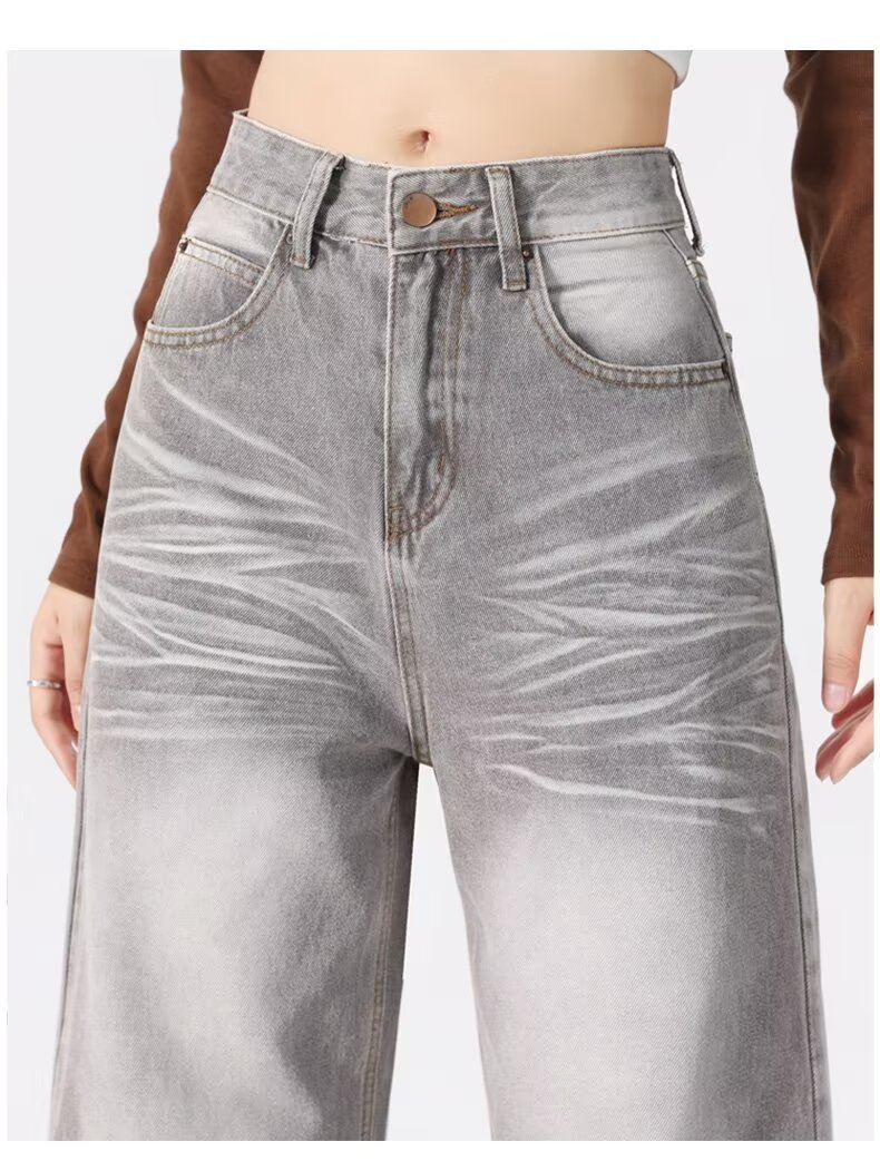 그레이 아메리칸 스타일 레트로 와이드 레그 청바지 여성의 2024 년 가을 새로운 골판지 느슨한 스트레이트 바지