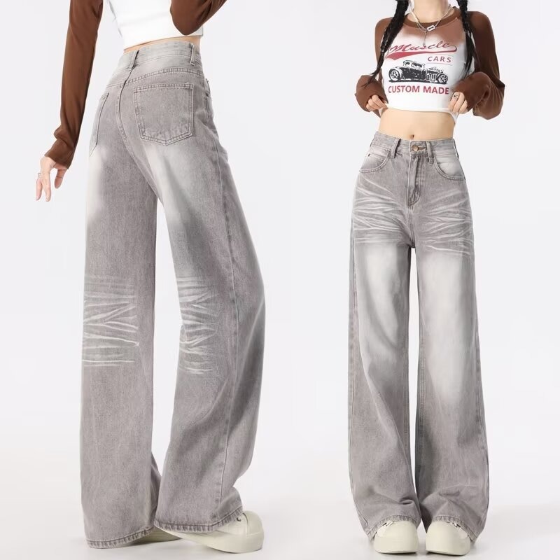 그레이 아메리칸 스타일 레트로 와이드 레그 청바지 여성의 2024 년 가을 새로운 골판지 느슨한 스트레이트 바지스토어 가기