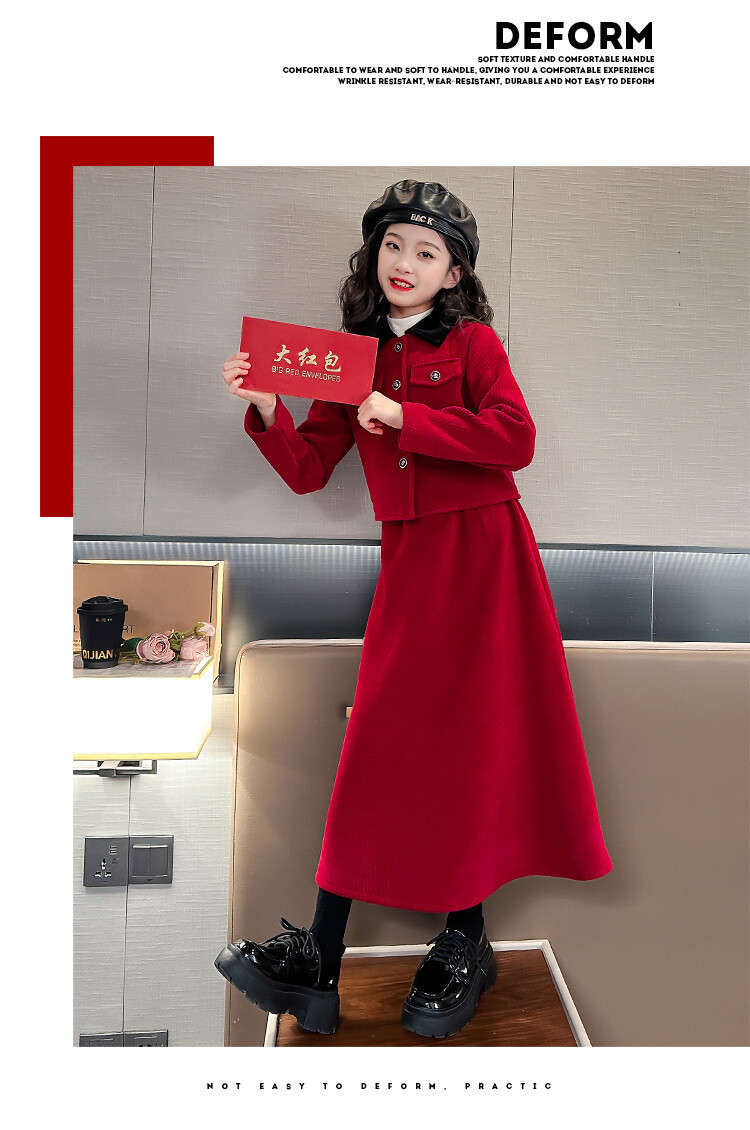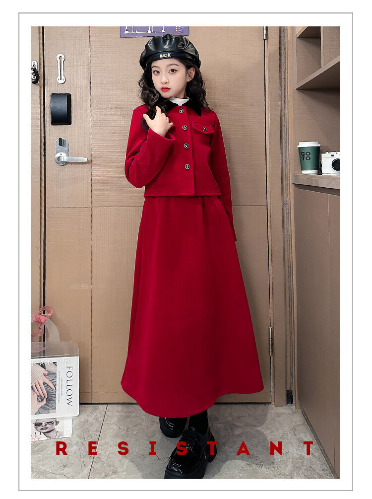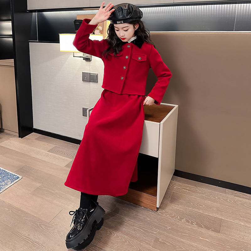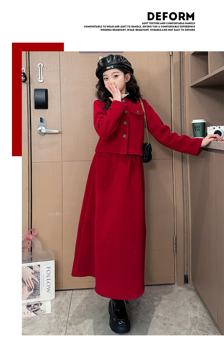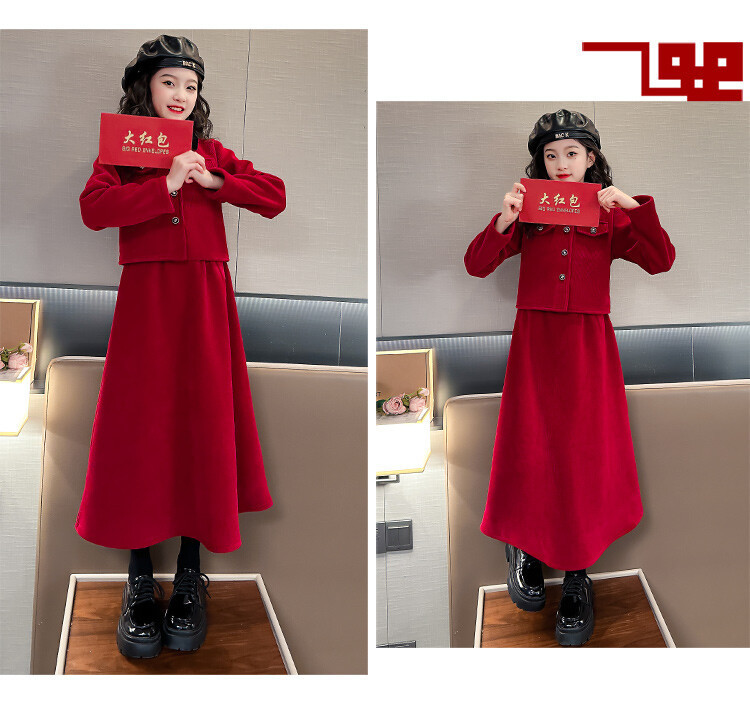 여자 세트 치마 두꺼운 빨간 서양식 신년 옷 가을과 겨울 새로운 어린이 작은 향기로운 스타일 스커트 투피스 세트스토어 가기