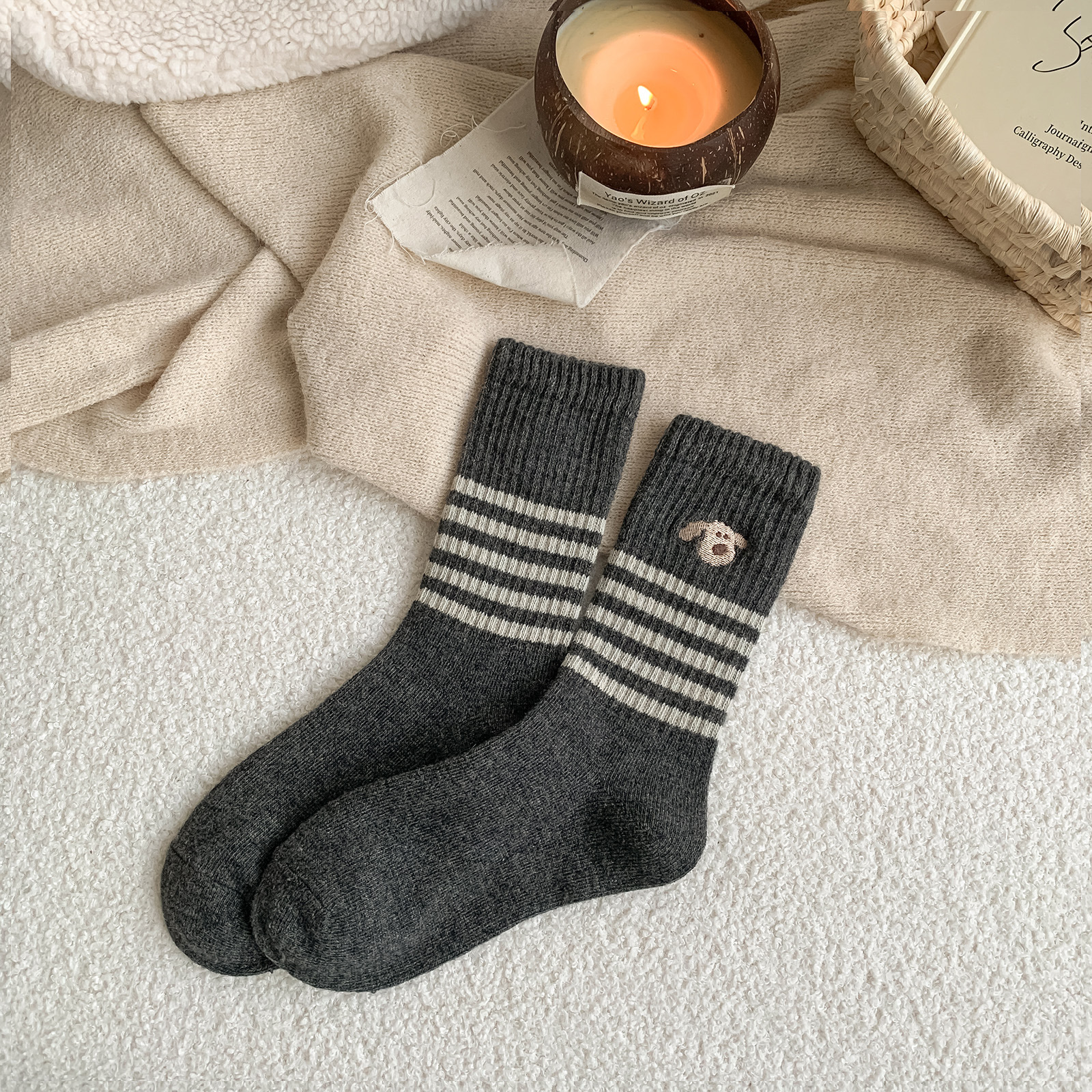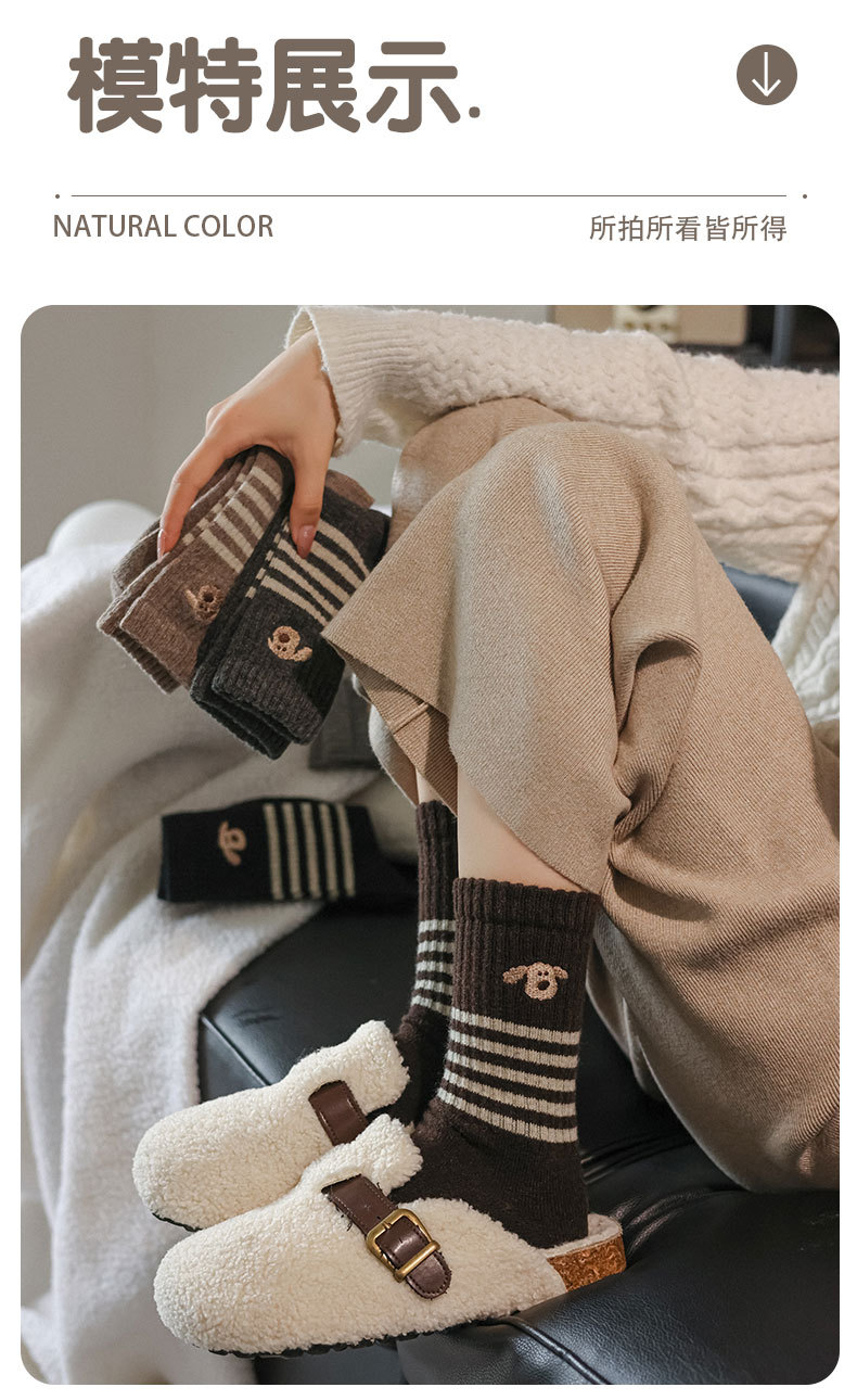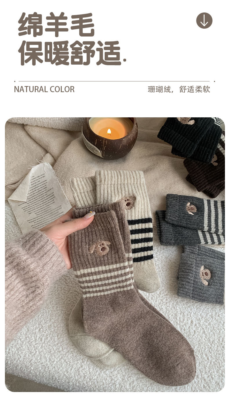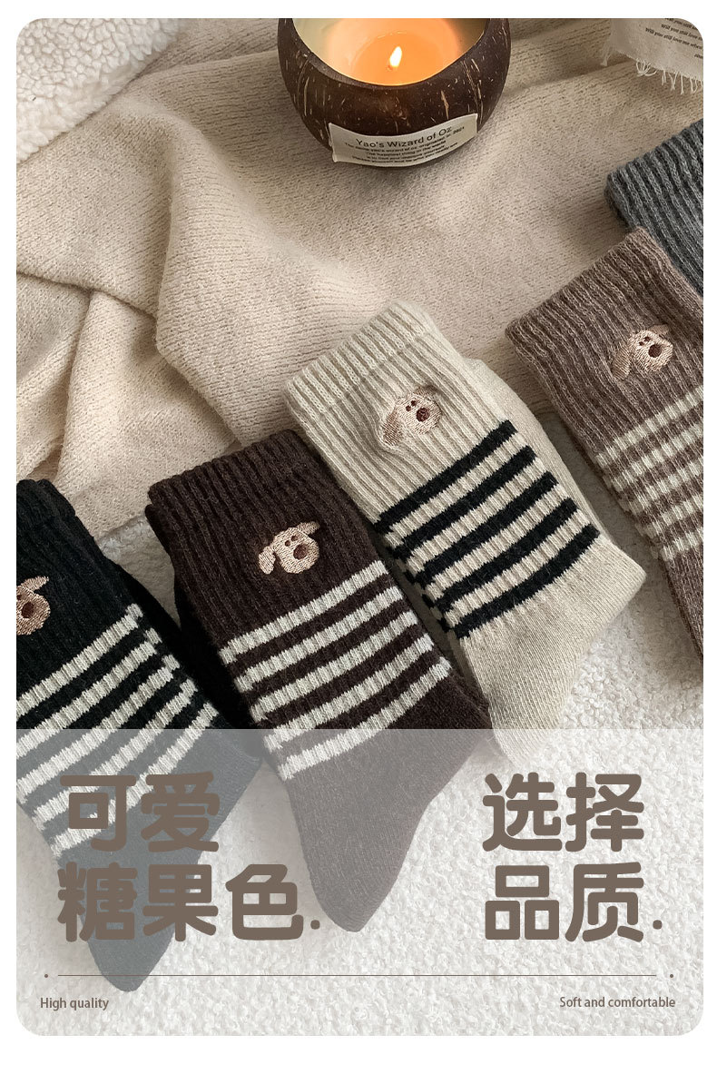 가을과 겨울의 어린이를위한 양모 양말 두꺼운 따뜻한 양말 일본 귀여운 개 자수 줄무늬 캐시미어 양말