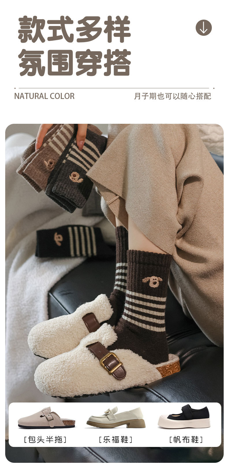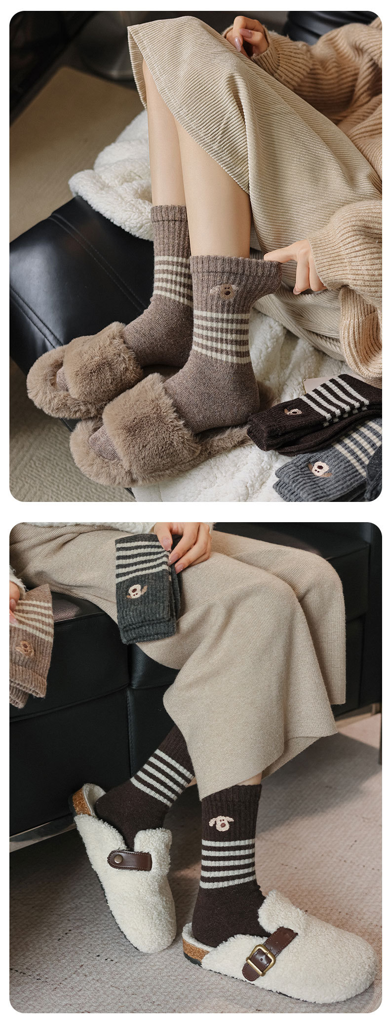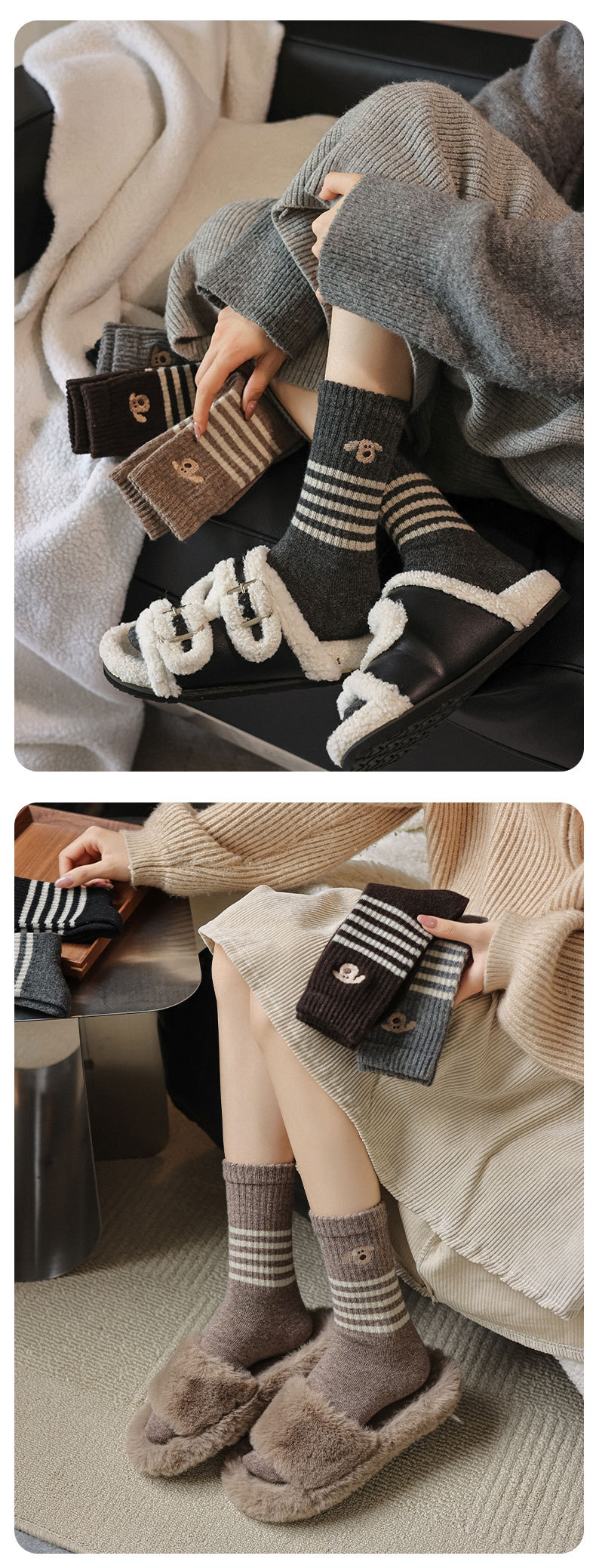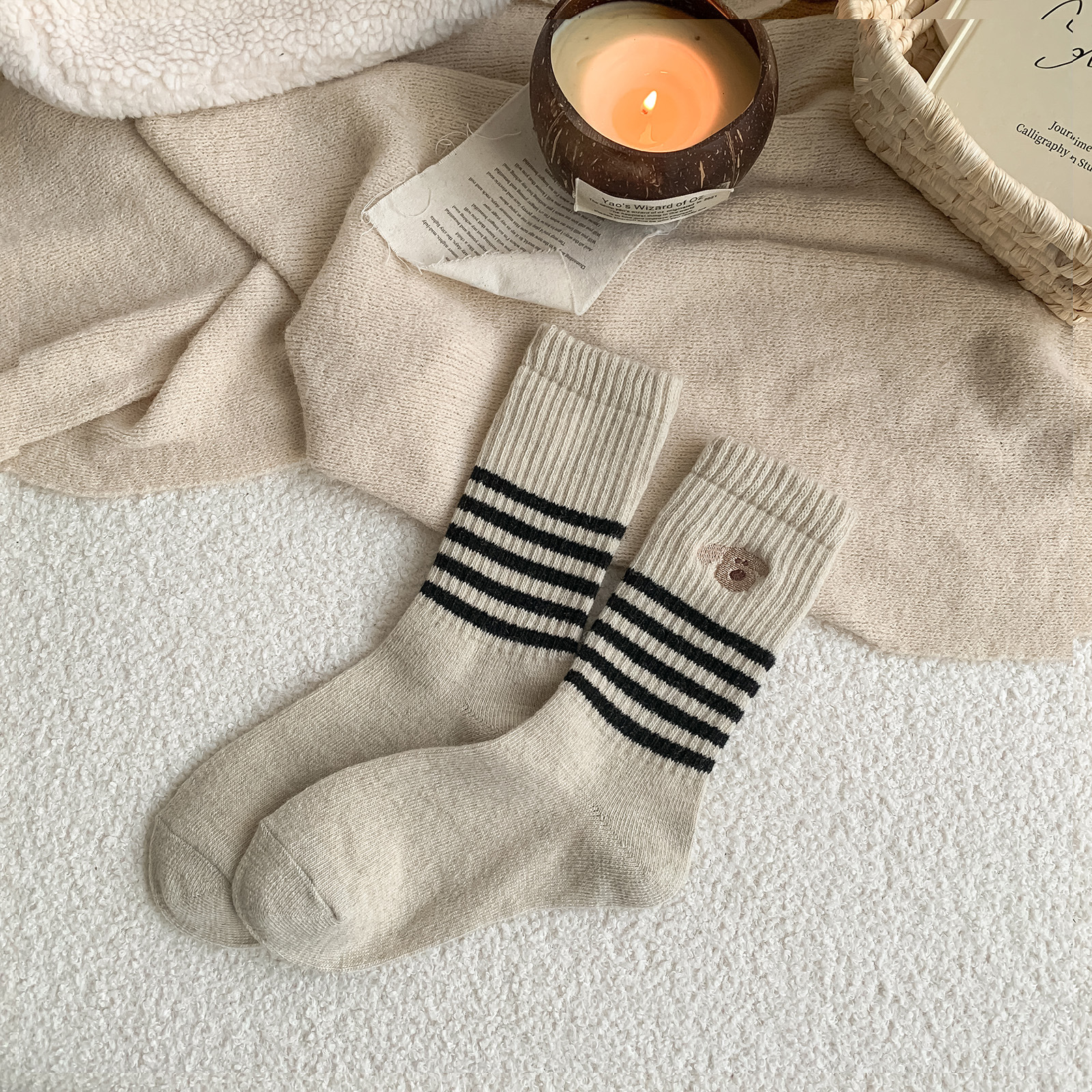 가을과 겨울의 어린이를위한 양모 양말 두꺼운 따뜻한 양말 일본 귀여운 개 자수 줄무늬 캐시미어 양말