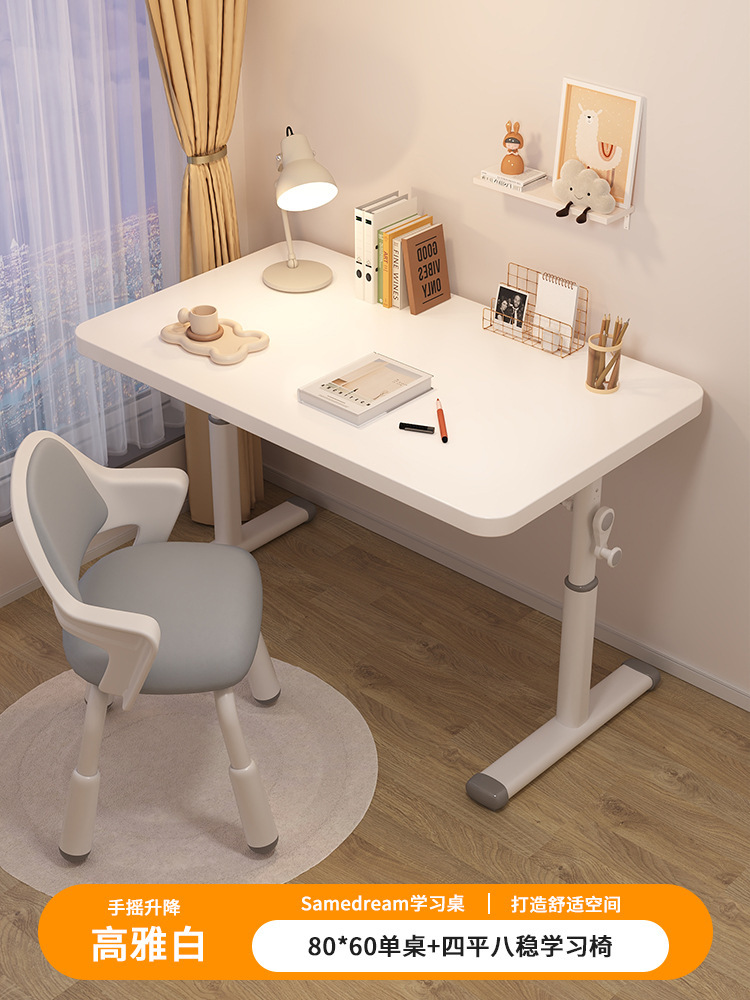 • [우아한 흰색 테이블과 의자 세트] 80*60 수동식 리프트 테이블 + 리프팅 학습 의자