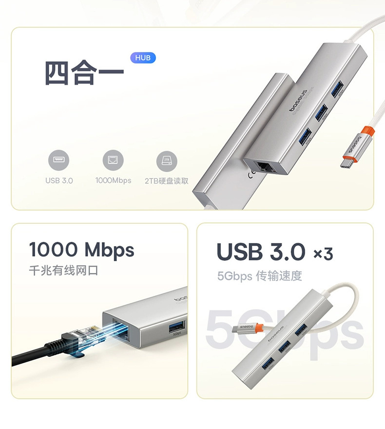 • Baseus 슈퍼 시리즈 4-in-1 HUB 스페이스 그레이(Type-C to USB3.0*3+RJ45*1+Type)