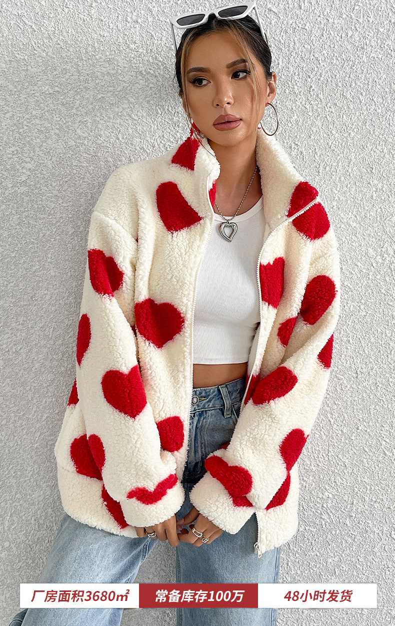 플래시 벨벳 2024 국경 여성 의류 유럽과 미국의 가을과 겨울 새로운 플러시 사랑 인쇄 느슨한 긴 소매 지퍼 카디건 코트