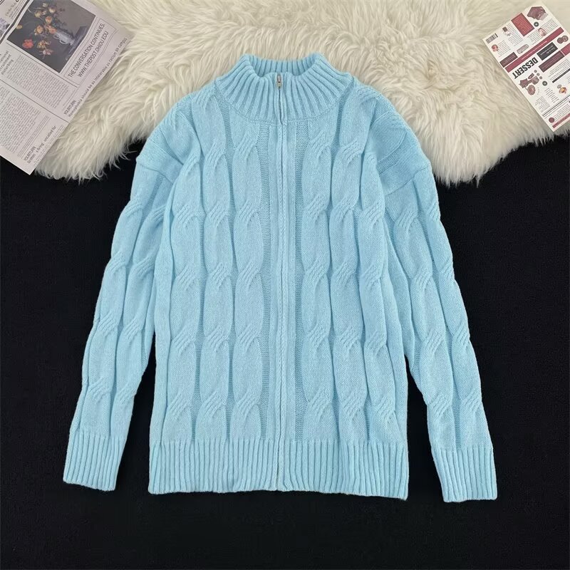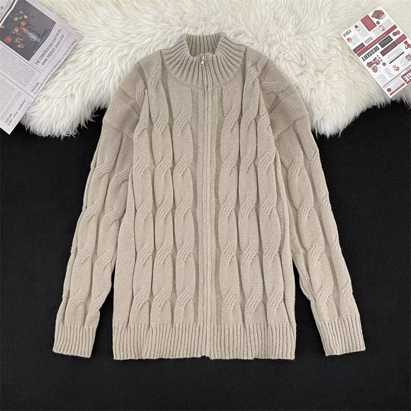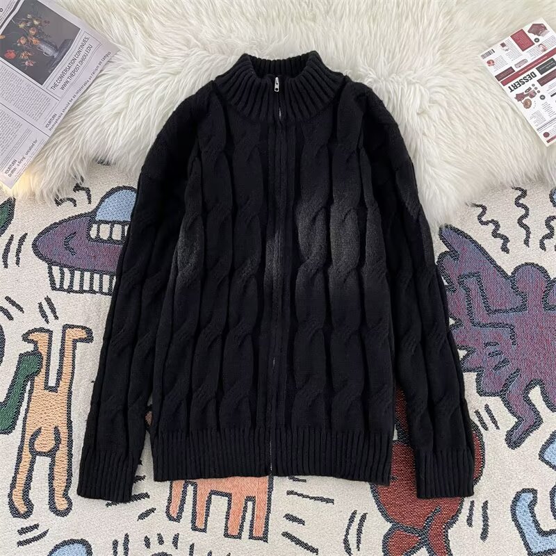 아메리칸 스타일 레트로 블루 트위스트 지퍼 카디건 스웨터 남성 겨울 패션 브랜드 루즈 캐주얼 게으른 니트웨어 재킷스토어 가기