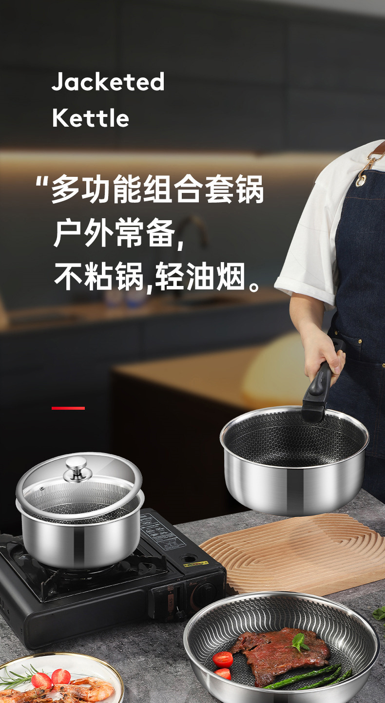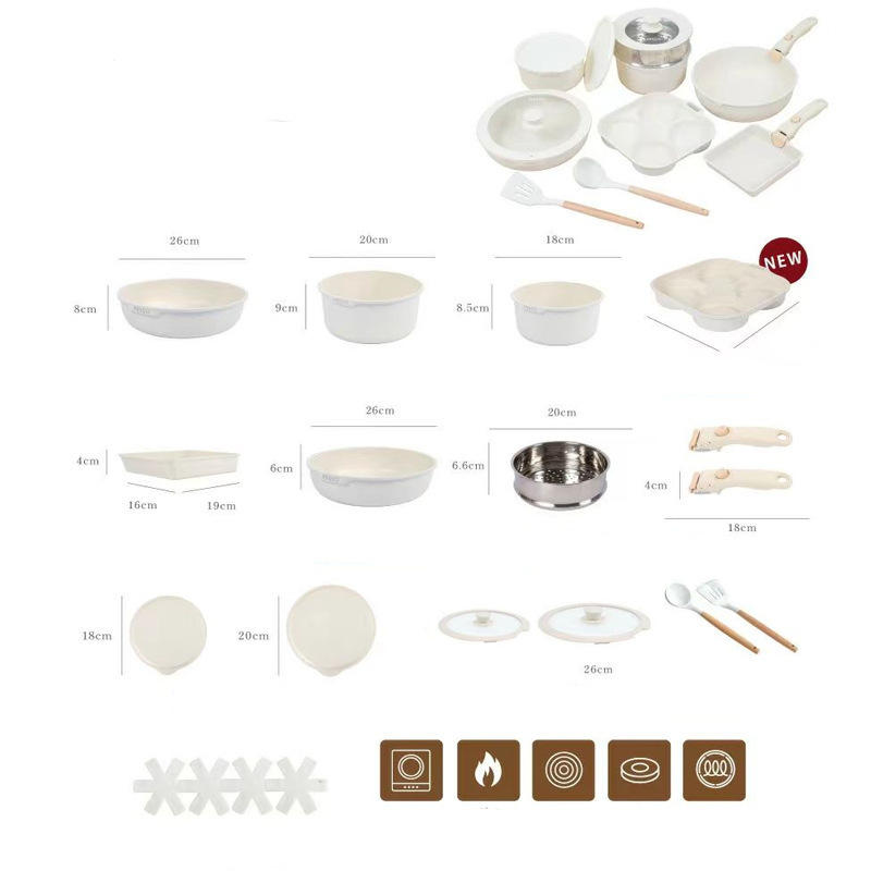 19件套(锅*5+玉子烧+四孔煎蛋锅+硅胶玻璃盖*2+冰箱盖*2+毛毡垫*4可拆卸手柄*2+1蒸笼)