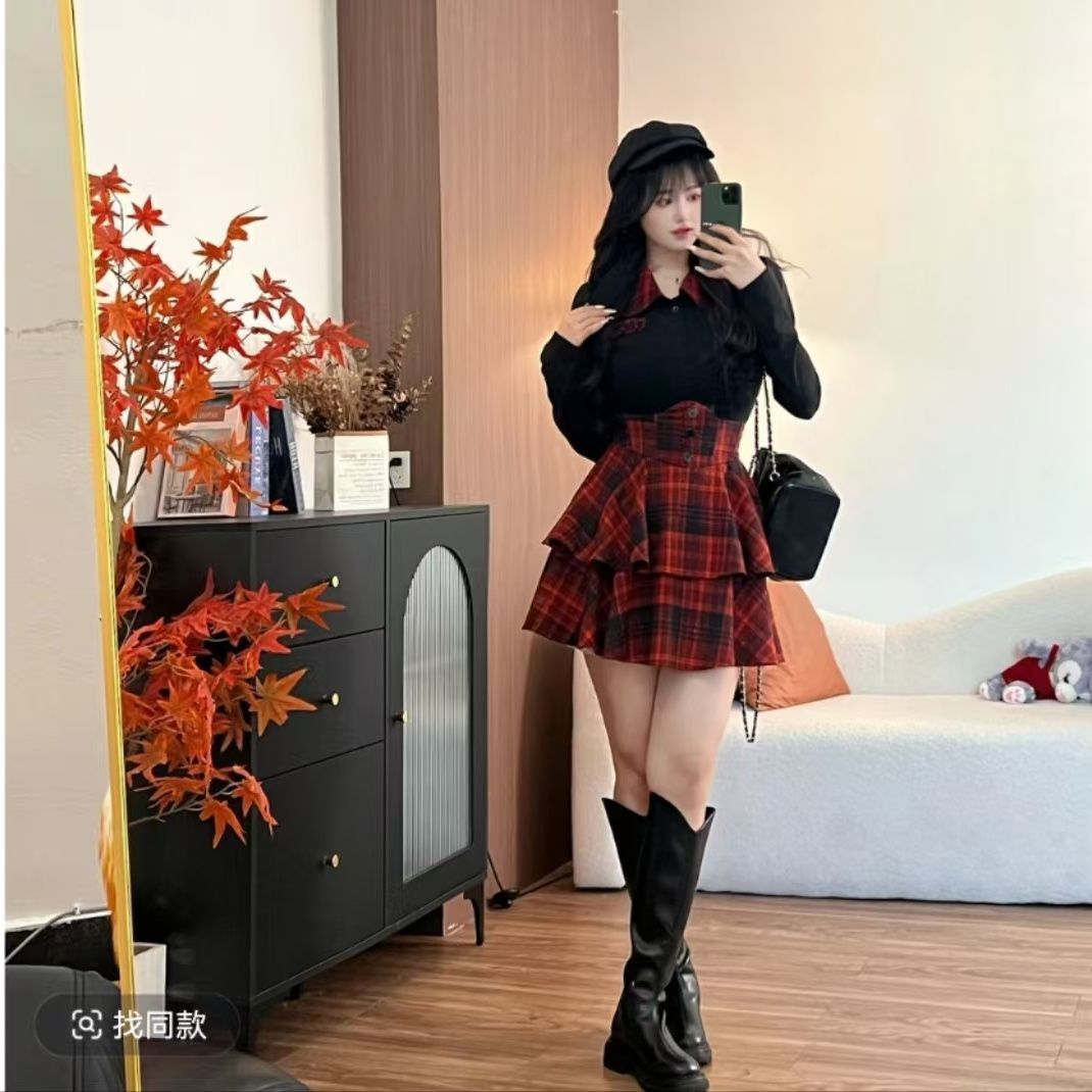 • 블랙 탑 + 레드 체크 스커트 [투피스 세트]