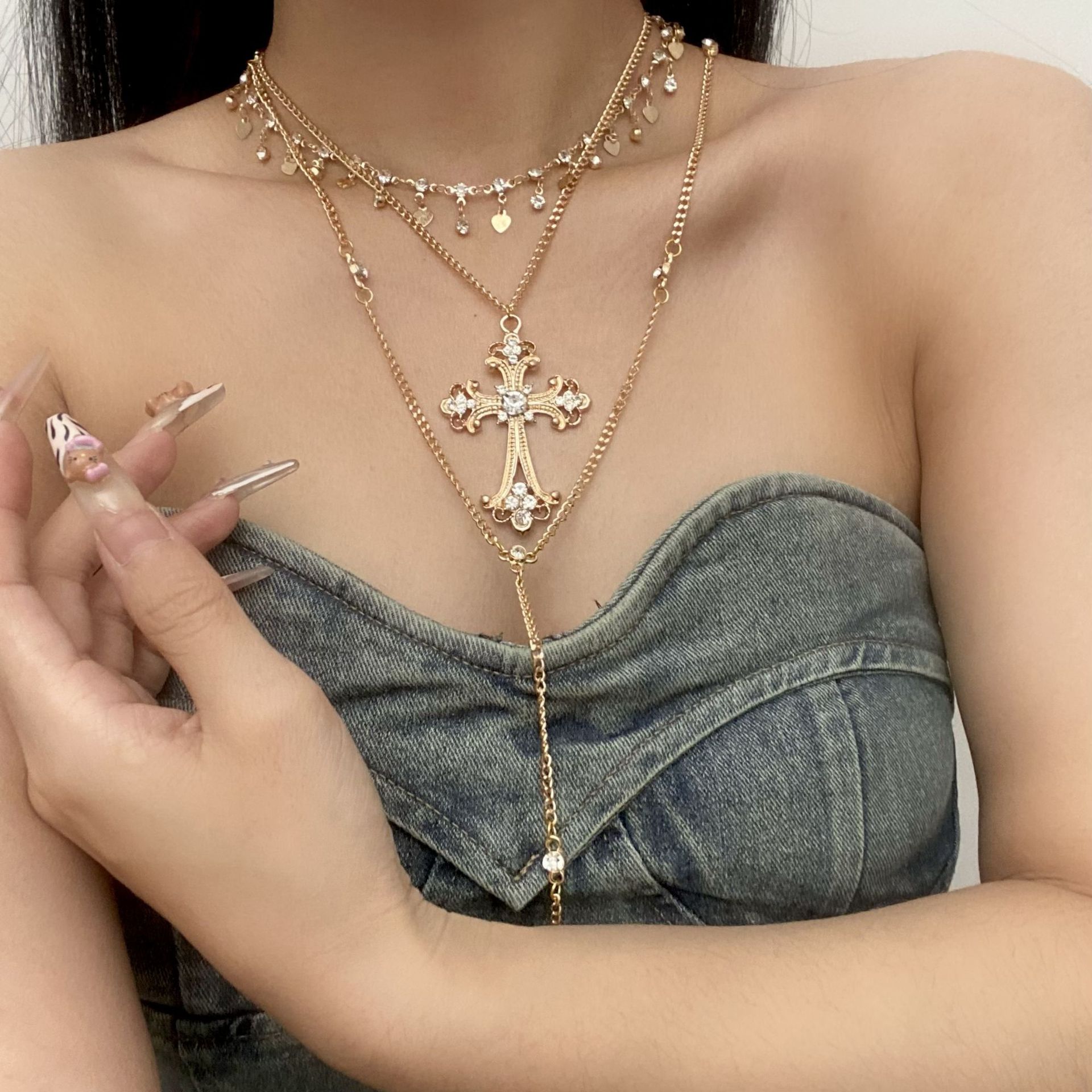 가벼운 럭셔리 틈새 레트로 바로크 스타일 더블 레이어 쌓인 크로스 목걸이 여성의 가을과 겨울 올 매치 하이 엔드 센스 모직 체인스토어 가기