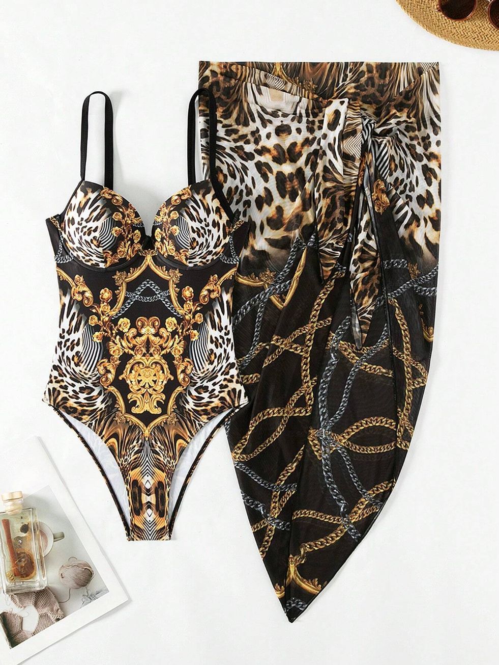 크로스 숄더 스트랩 스틸 지원은 슬림 스플릿 비키니 세트 스커트 복고풍 인쇄 유럽과 미국에 국경 간 수출을 모았습니다.