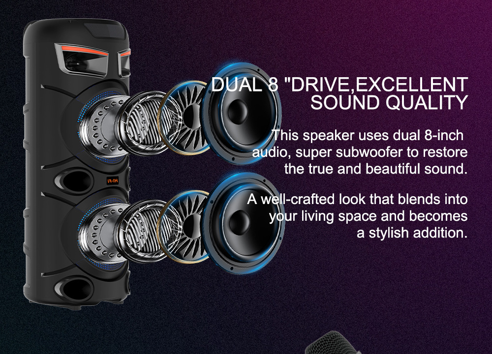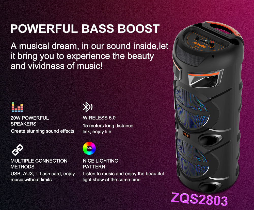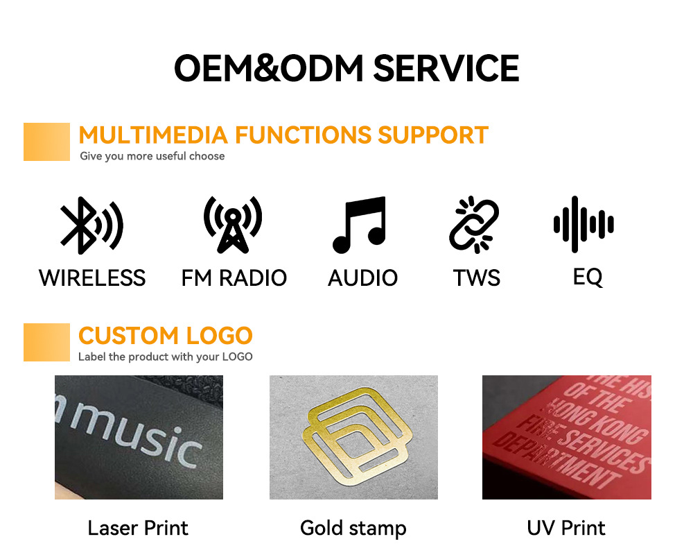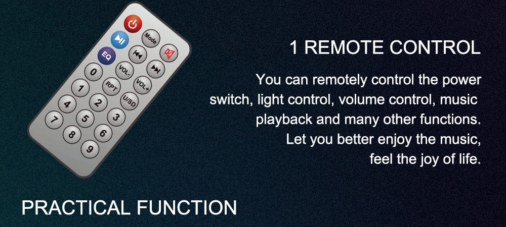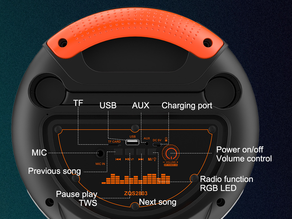 带BT/FM/USB/TF卡/MIC/AUX/TWS、DC-5V充电(Type-c)无显示屏、USB带5V升压、带无线麦功能,带遥控器功能.