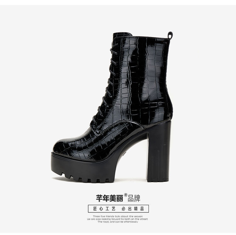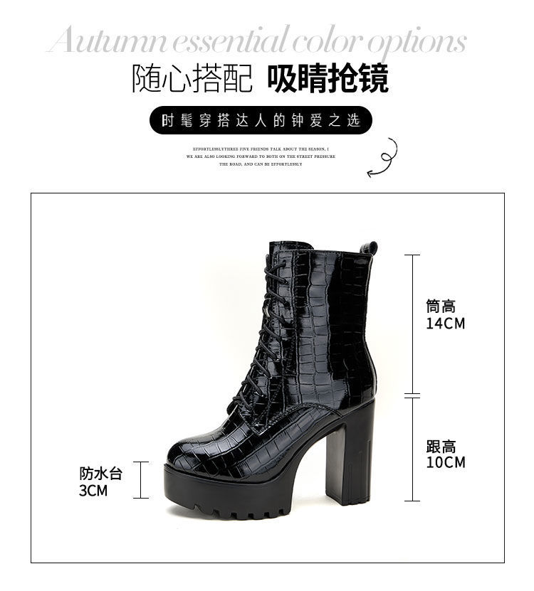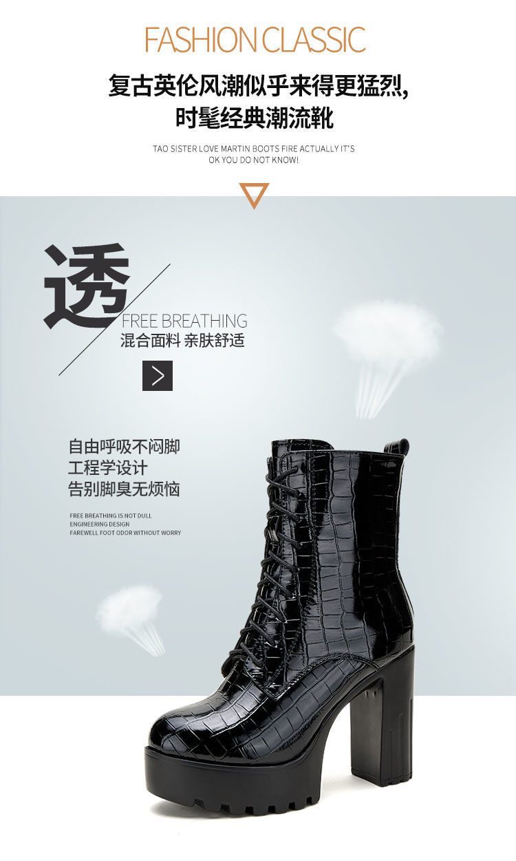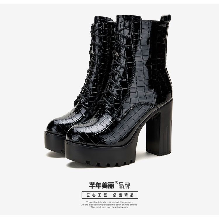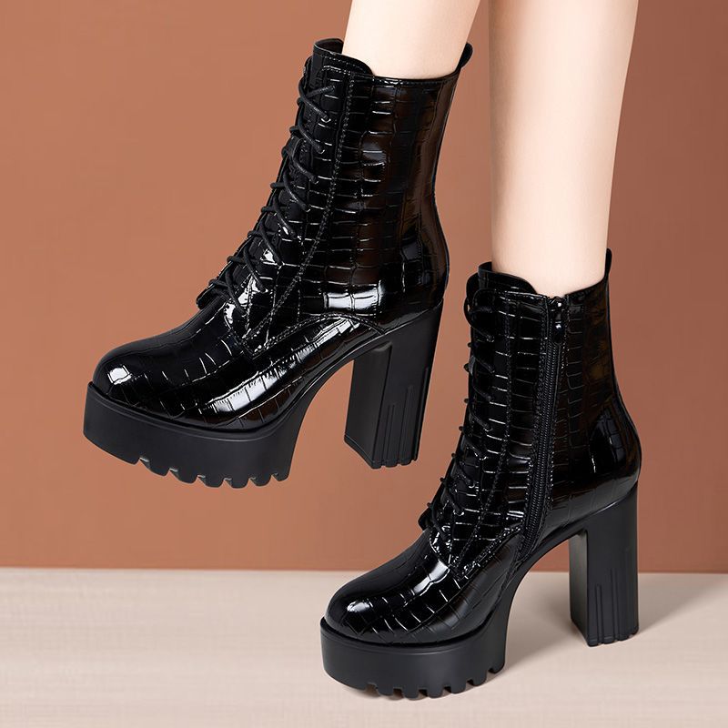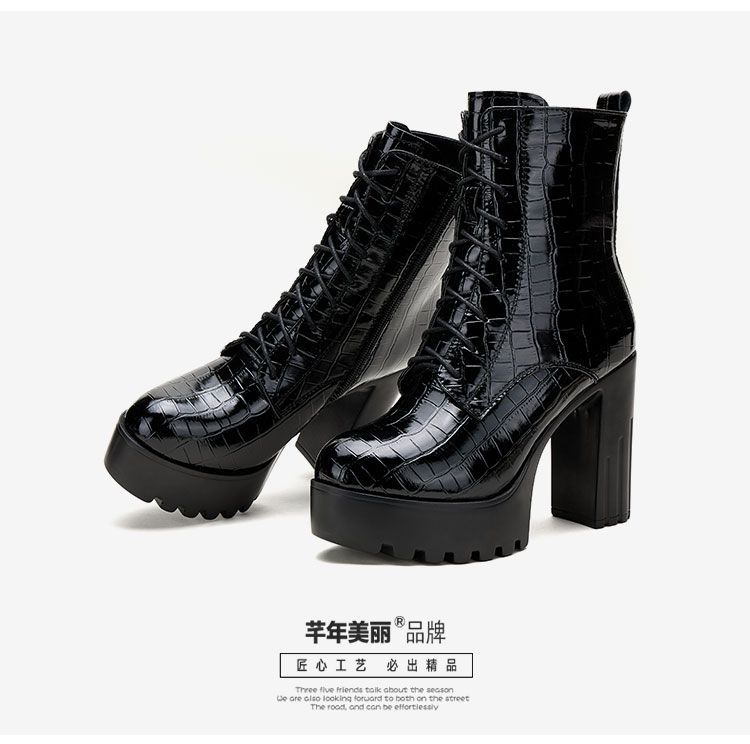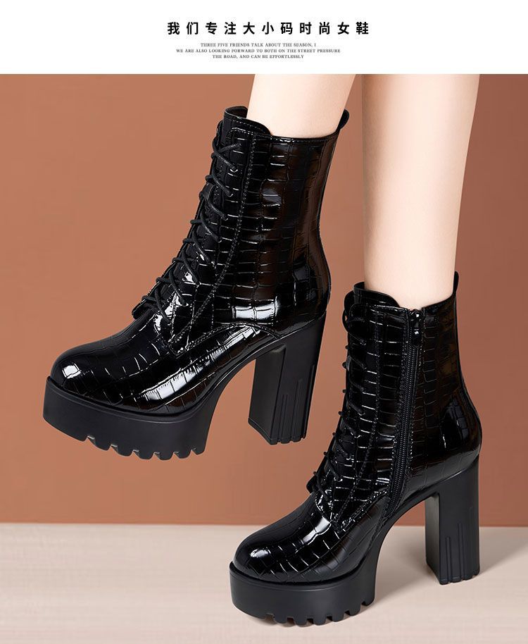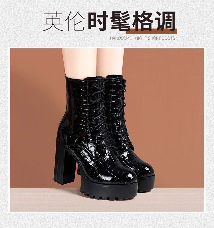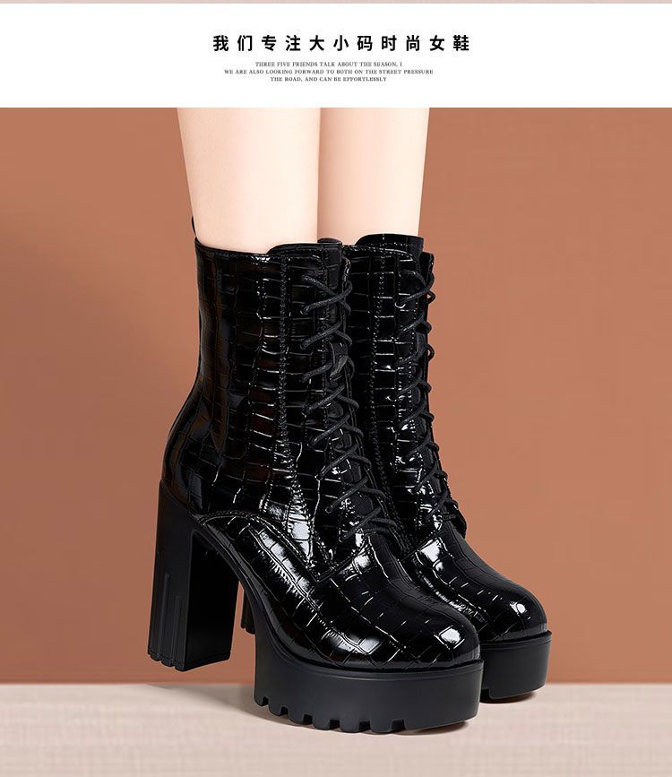 10cm 라운드 발가락 하이힐 마틴 부츠 여성 2024 가을 및 겨울 새로운 레이스 업 부츠 플러스 사이즈 하이힐 특허 가죽 쇼트 부츠스토어 가기