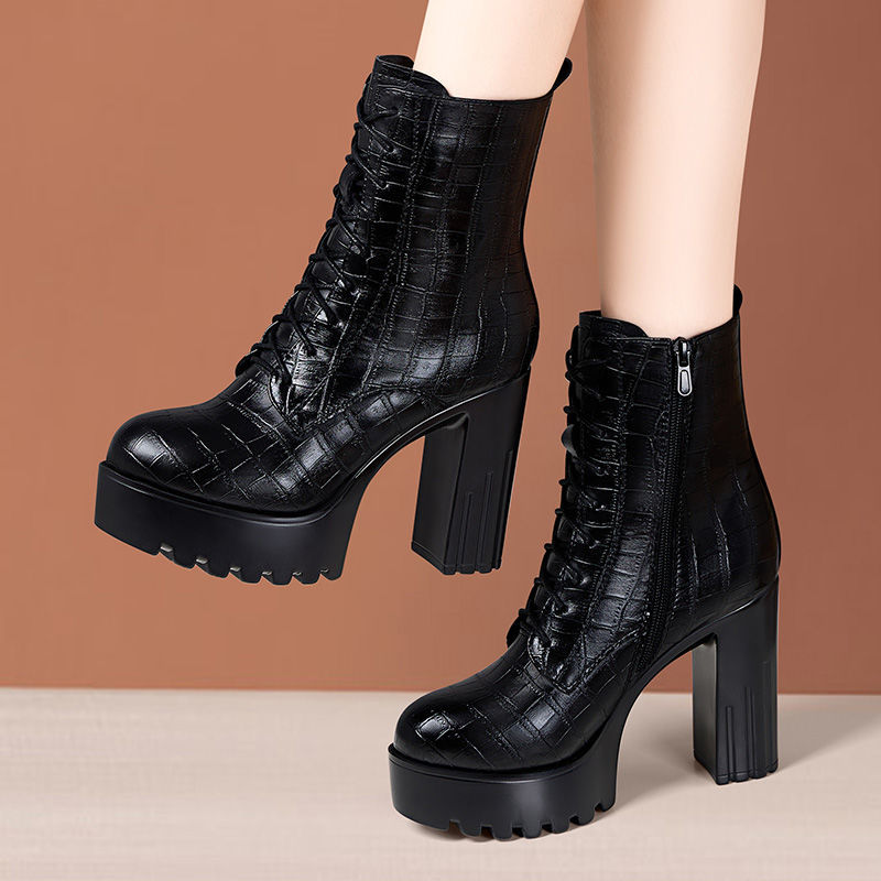 10cm 라운드 발가락 하이힐 마틴 부츠 여성 2024 가을 및 겨울 새로운 레이스 업 부츠 플러스 사이즈 하이힐 특허 가죽 쇼트 부츠
