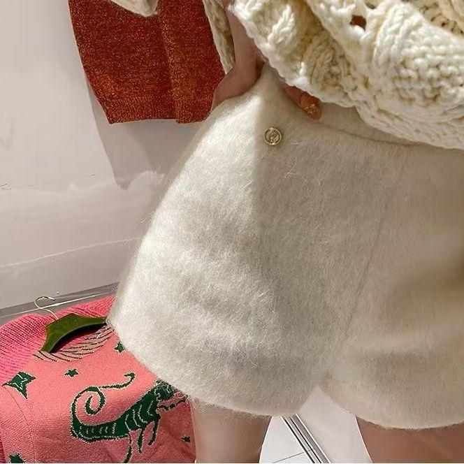 여성을위한 흰색 작은 향기로운 스타일 플러시 스트레이트 캐주얼 반바지 2025 가을, 겨울 새로운 스타일 하이 웨이스트 슬리밍 핫 소녀 와이드 레그 바지스토어 가기