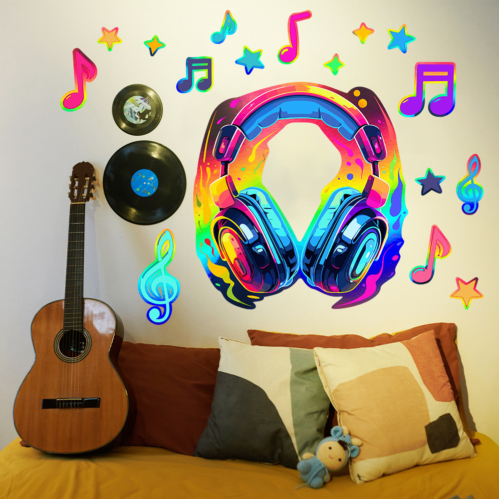 Yiyao LS2313 공장 직접 레이저 다채로운 멋진 음악 헤드셋 벽 스티커 발코니 룸 장식 스티커스토어 가기