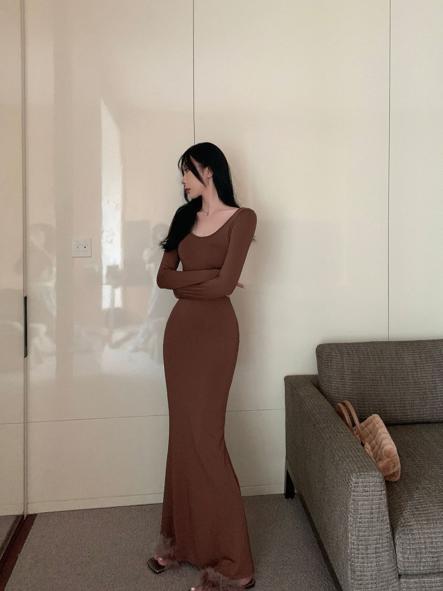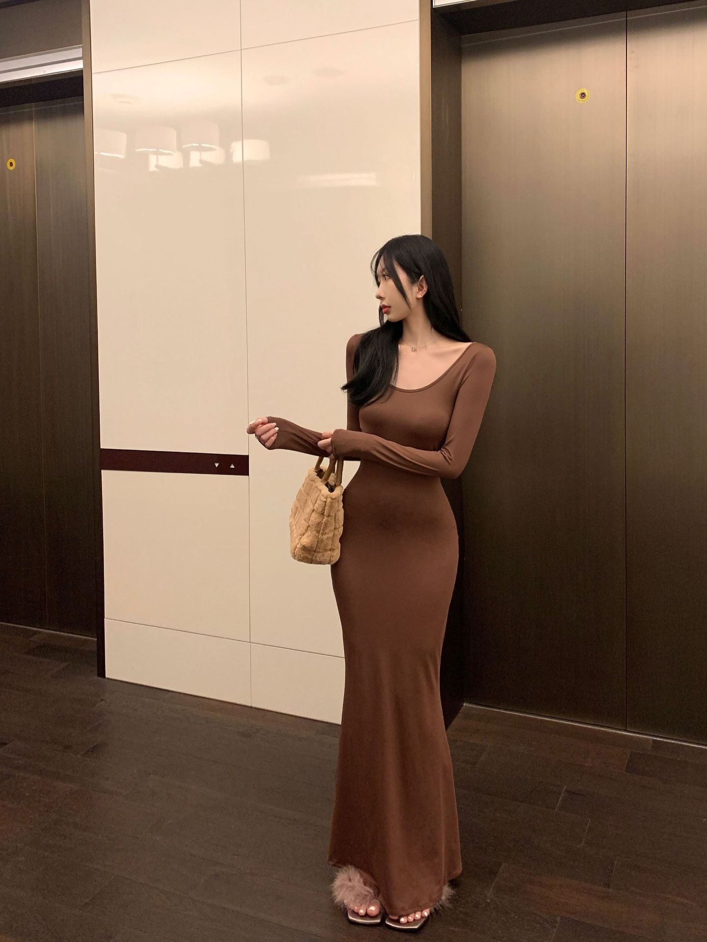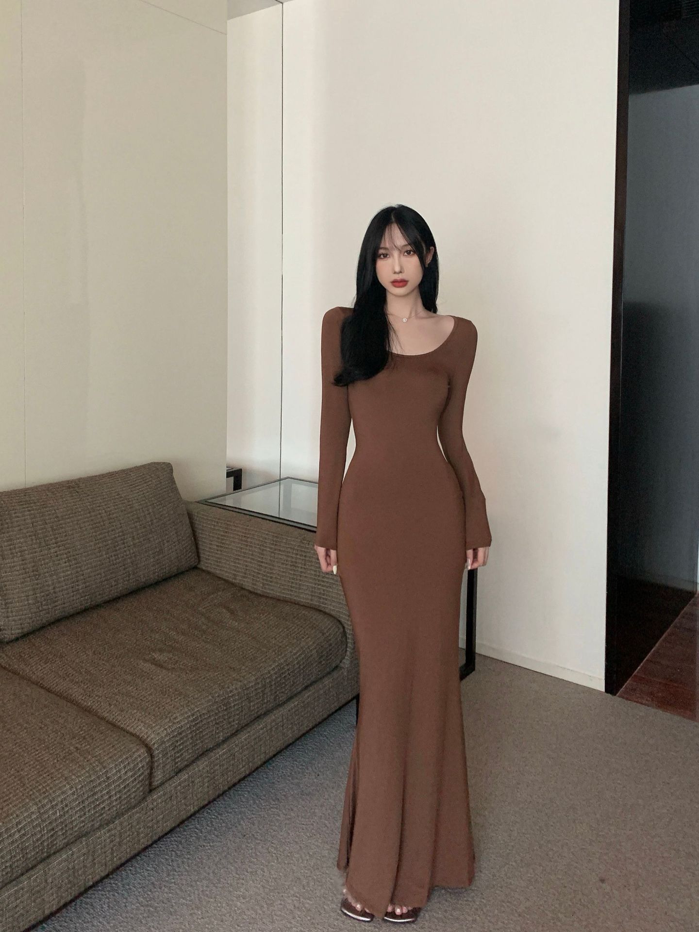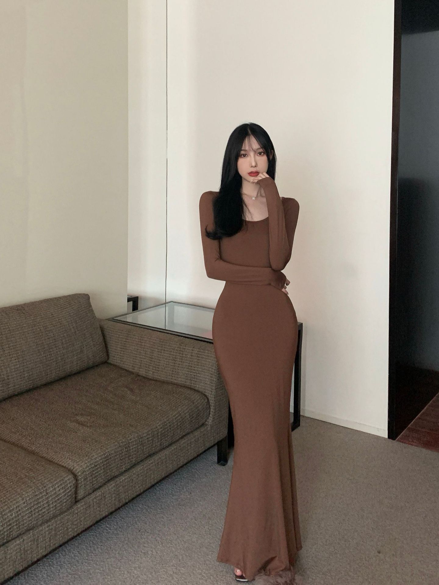 핫걸 섹시한 긴팔 드레스 여성 가을 2025 새로운 커피 컬러 바닥 긴 드레스 슬림 피쉬 테일 힙 스커트