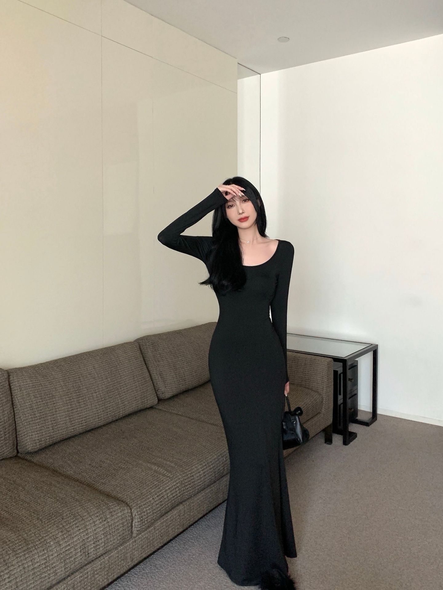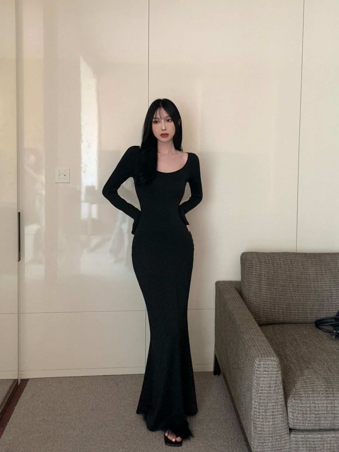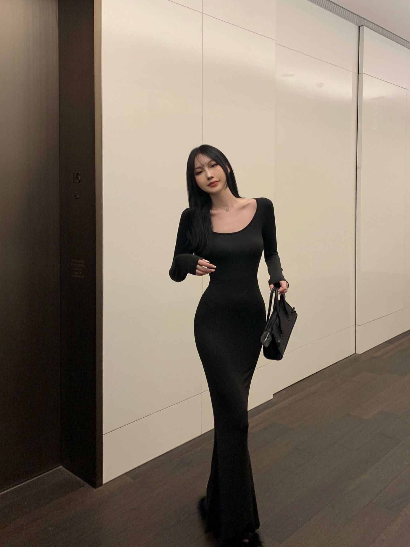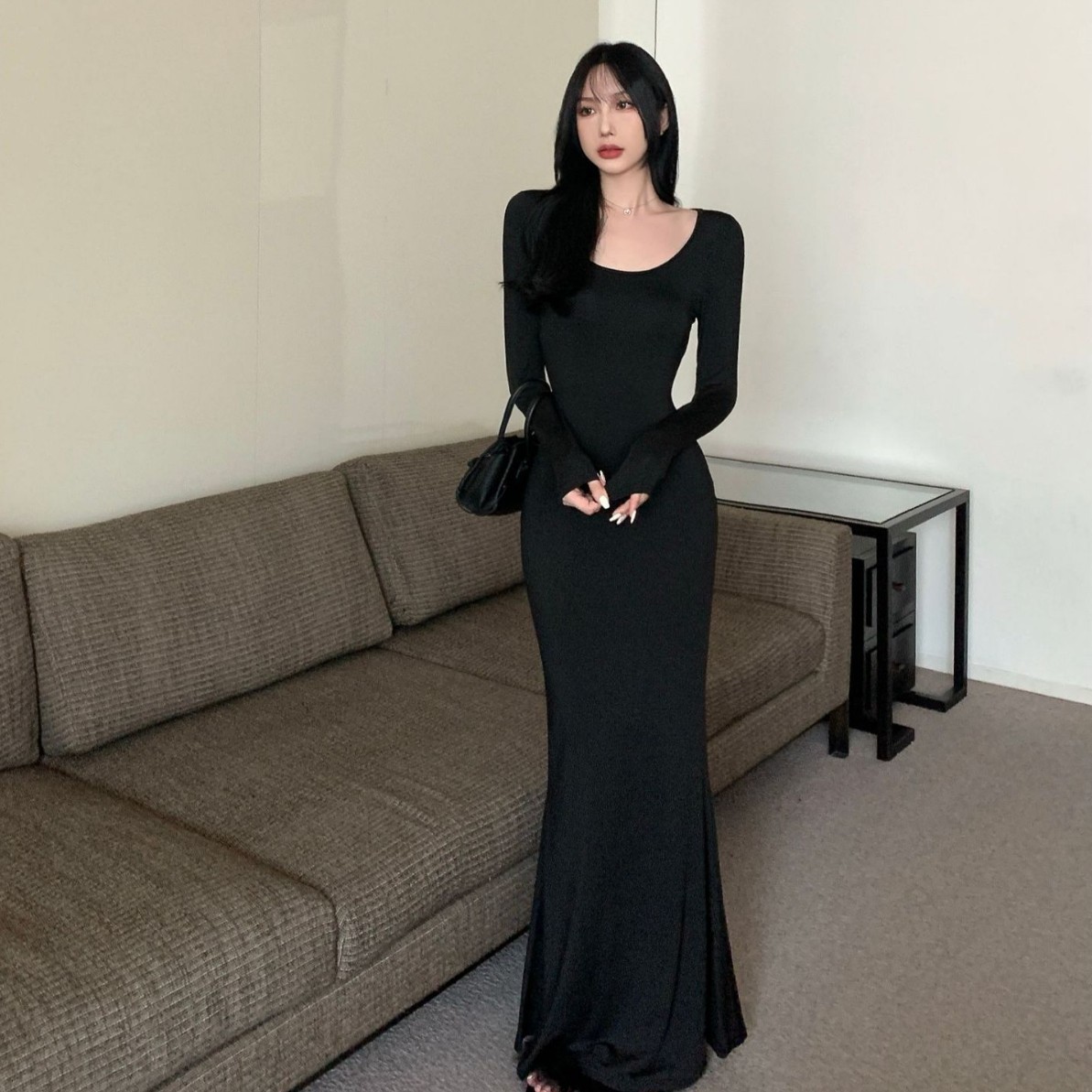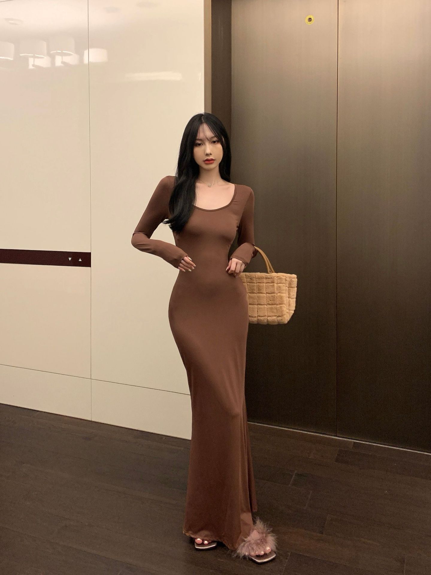 핫걸 섹시한 긴팔 드레스 여성 가을 2025 새로운 커피 컬러 바닥 긴 드레스 슬림 피쉬 테일 힙 스커트