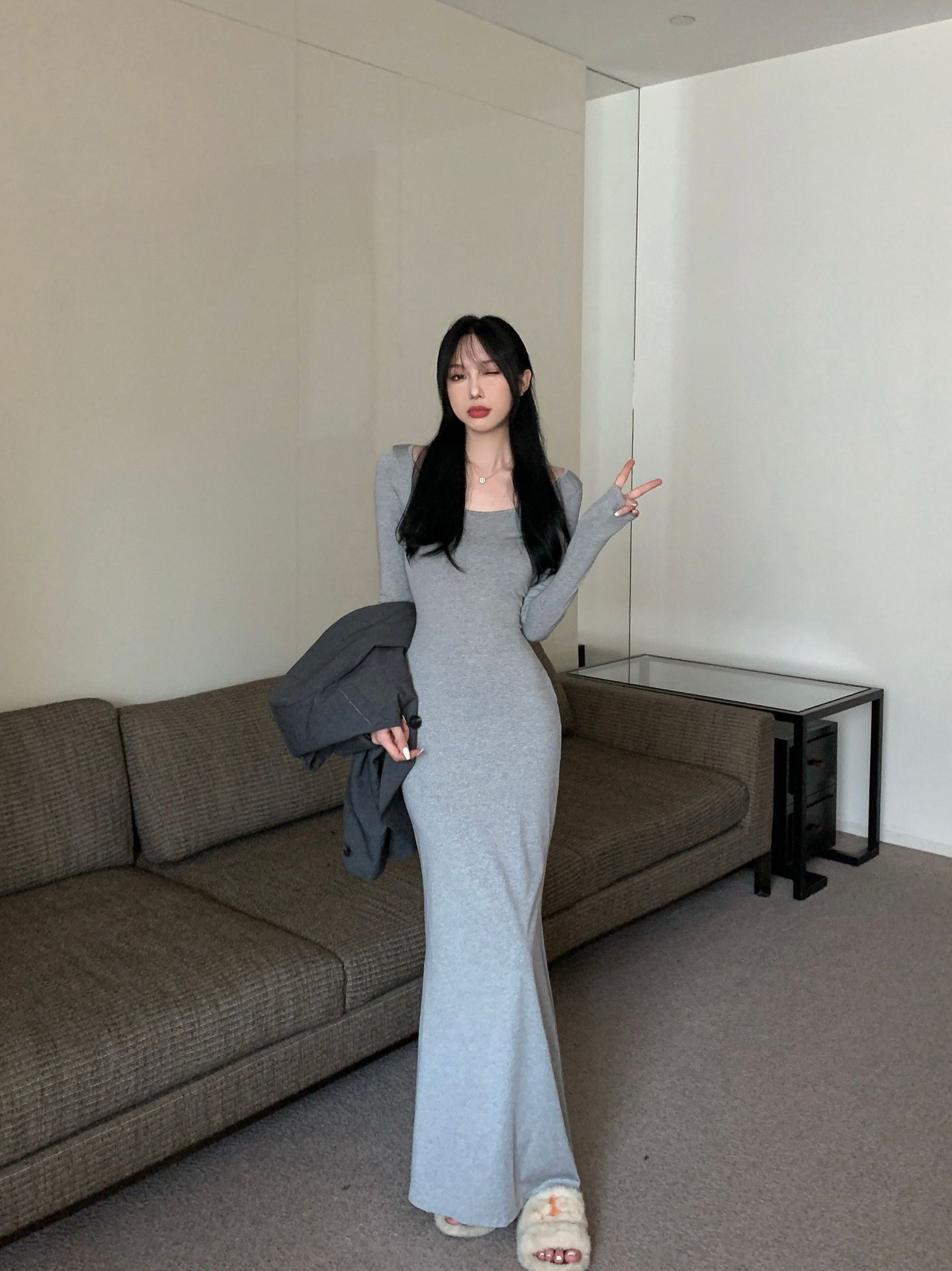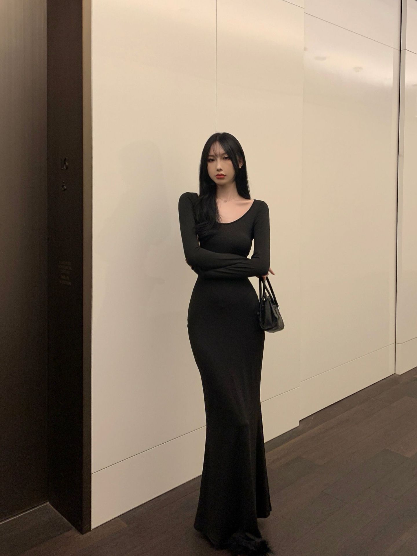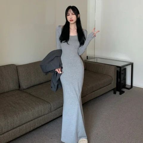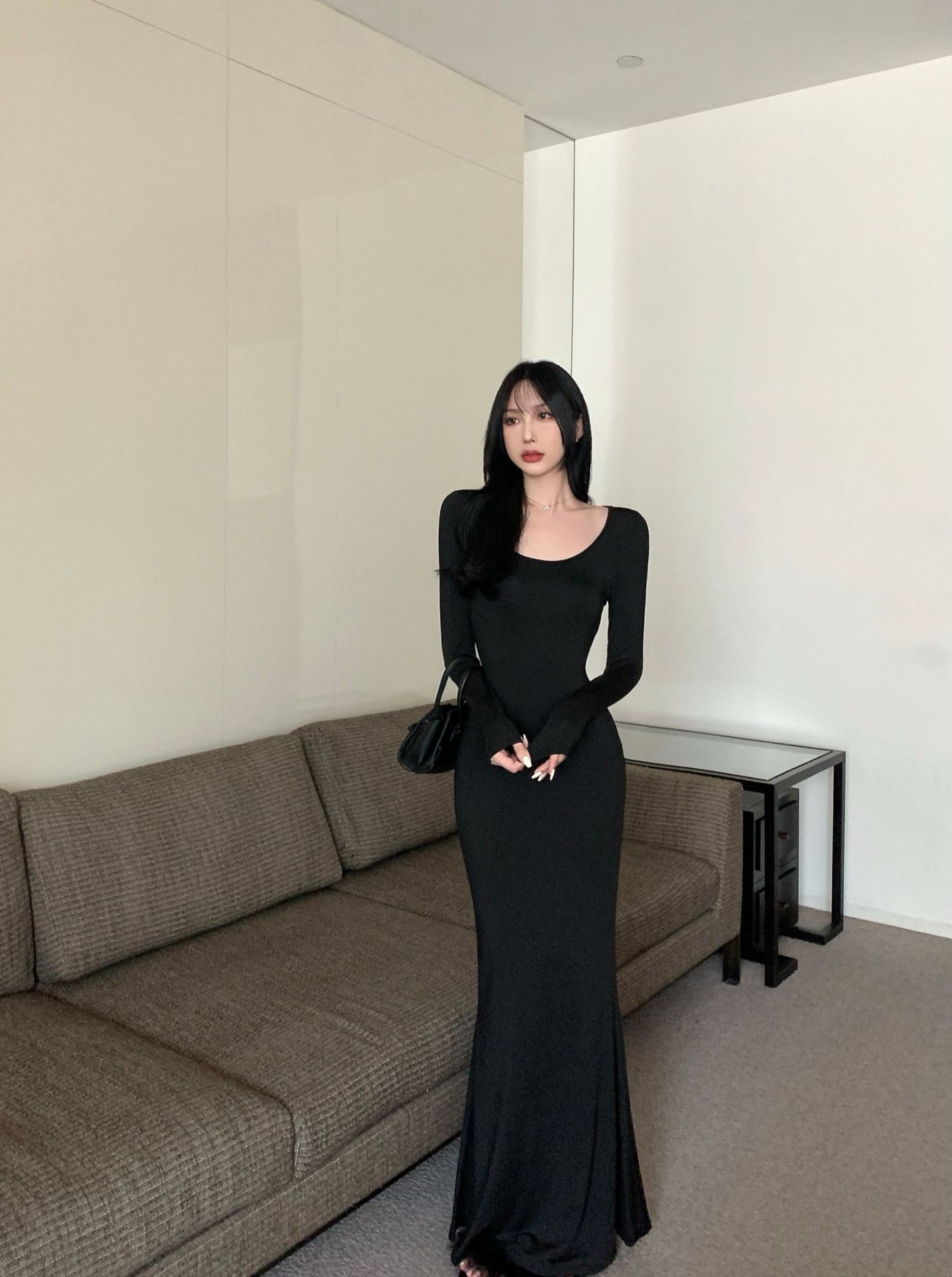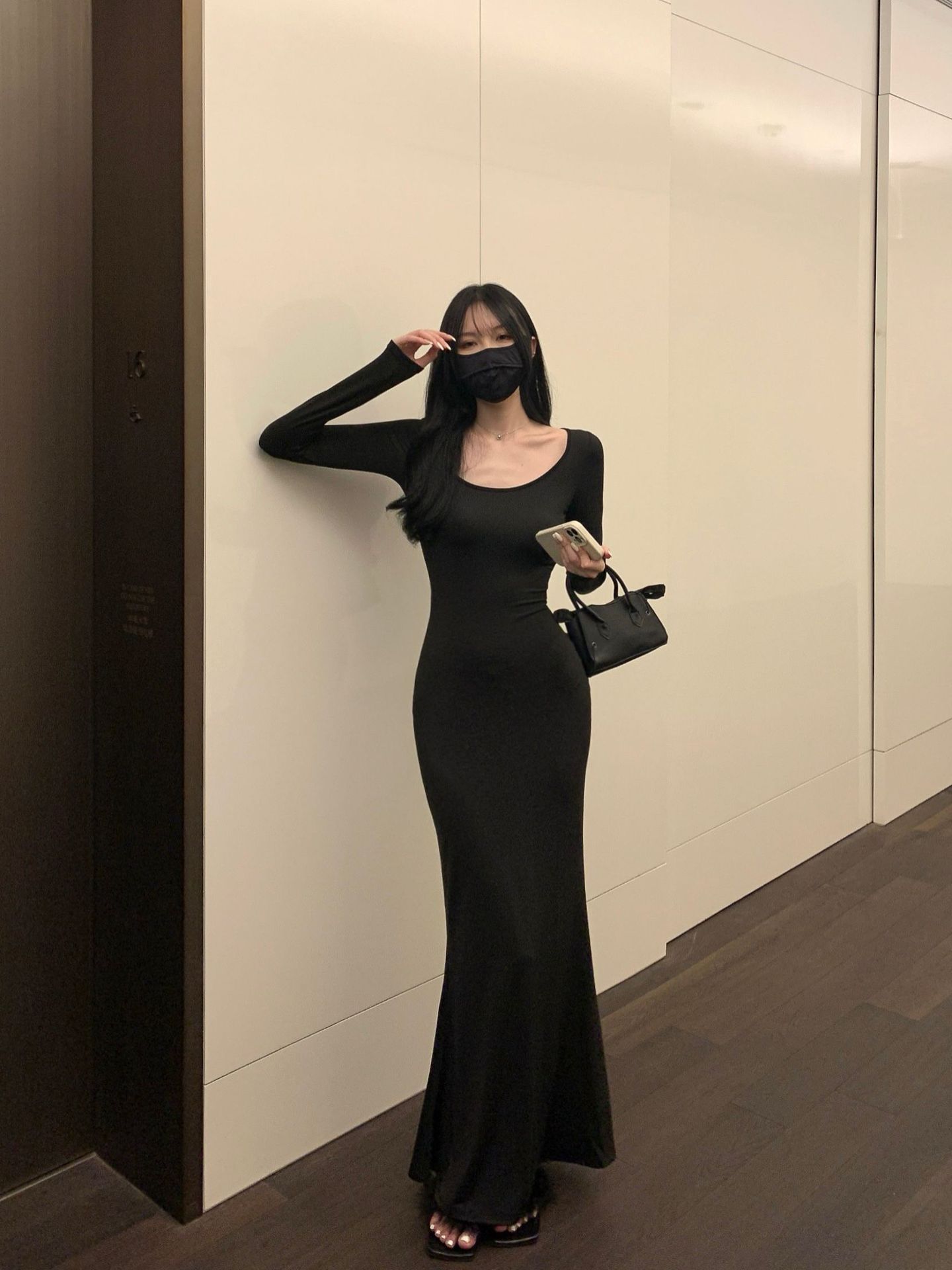 핫걸 섹시한 긴팔 드레스 여성 가을 2025 새로운 커피 컬러 바닥 긴 드레스 슬림 피쉬 테일 힙 스커트