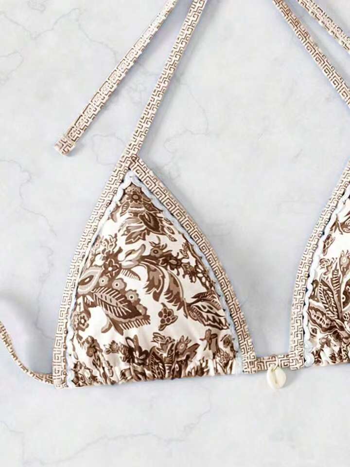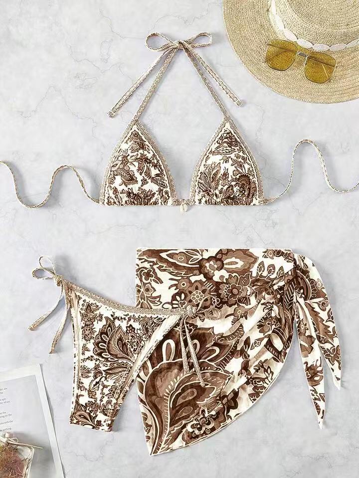 파란색과 흰색 도자기 새로운 대외 무역 3 점 분할 비키니 여성 수영복 섹시한 백리스 넥 레이스 업 수영복 비키스토어 가기