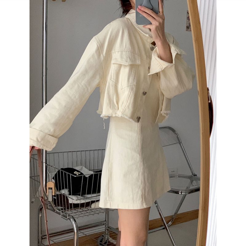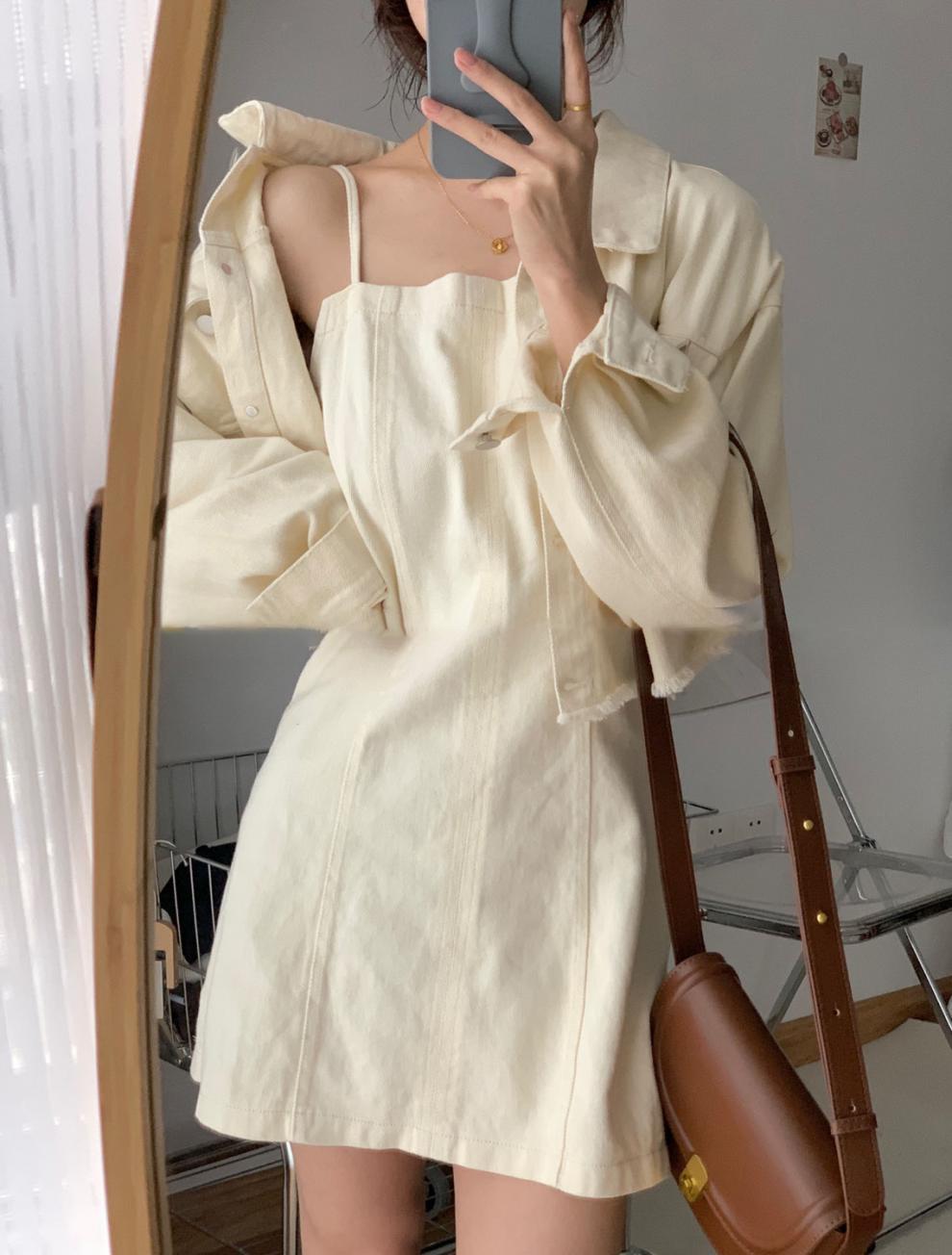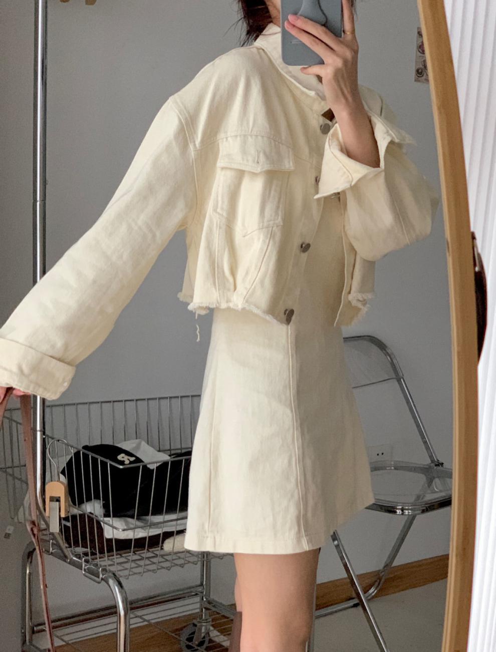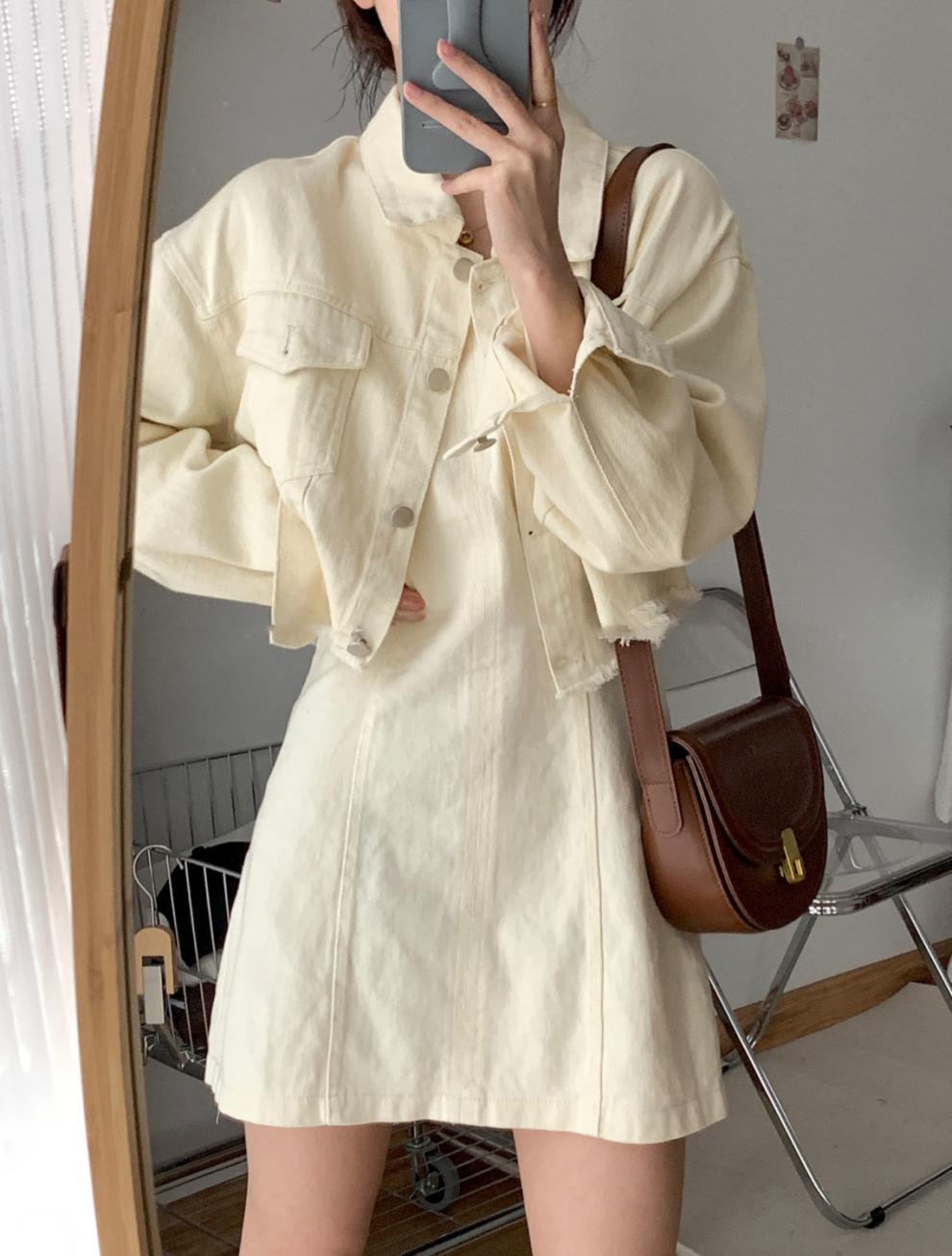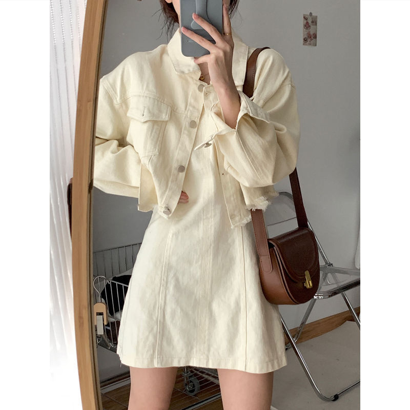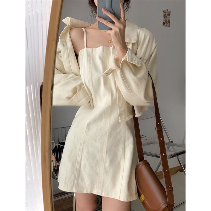한국식 아름다운 밀크 후푸 데님 세트 원피스 차 착용 작은 재킷 슬링 원피스 투피스 세트