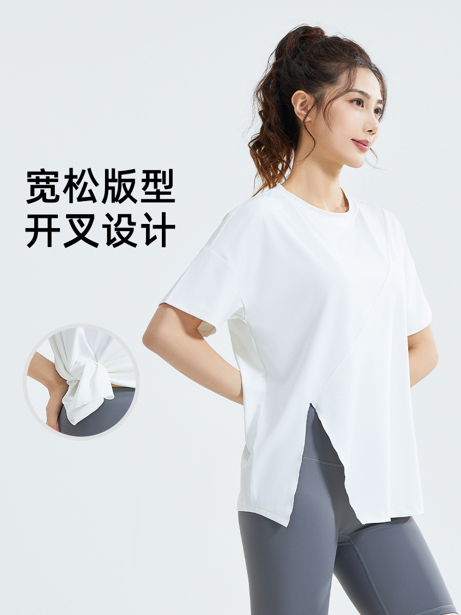 봄과 가을 새로운 느슨한 탄성 운동복 분할 요가 티셔츠 캐주얼 스포츠 밀크 실크 요가 짧은 소매스토어 가기