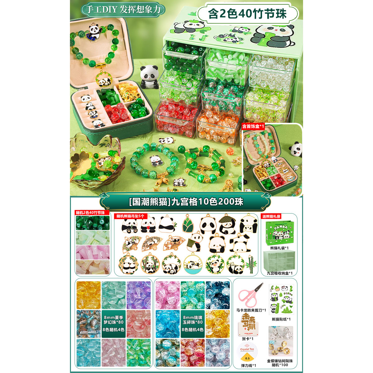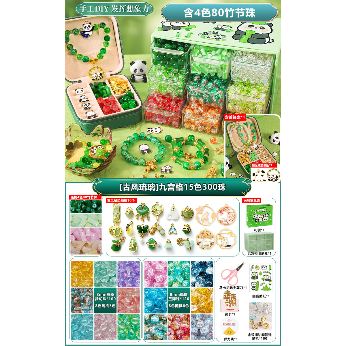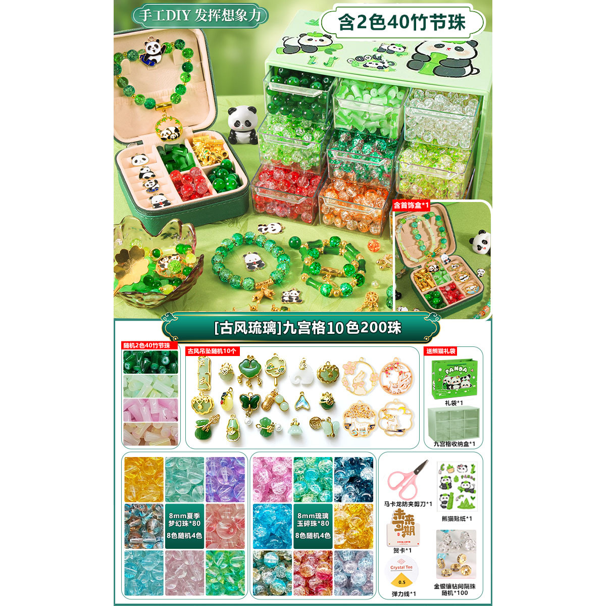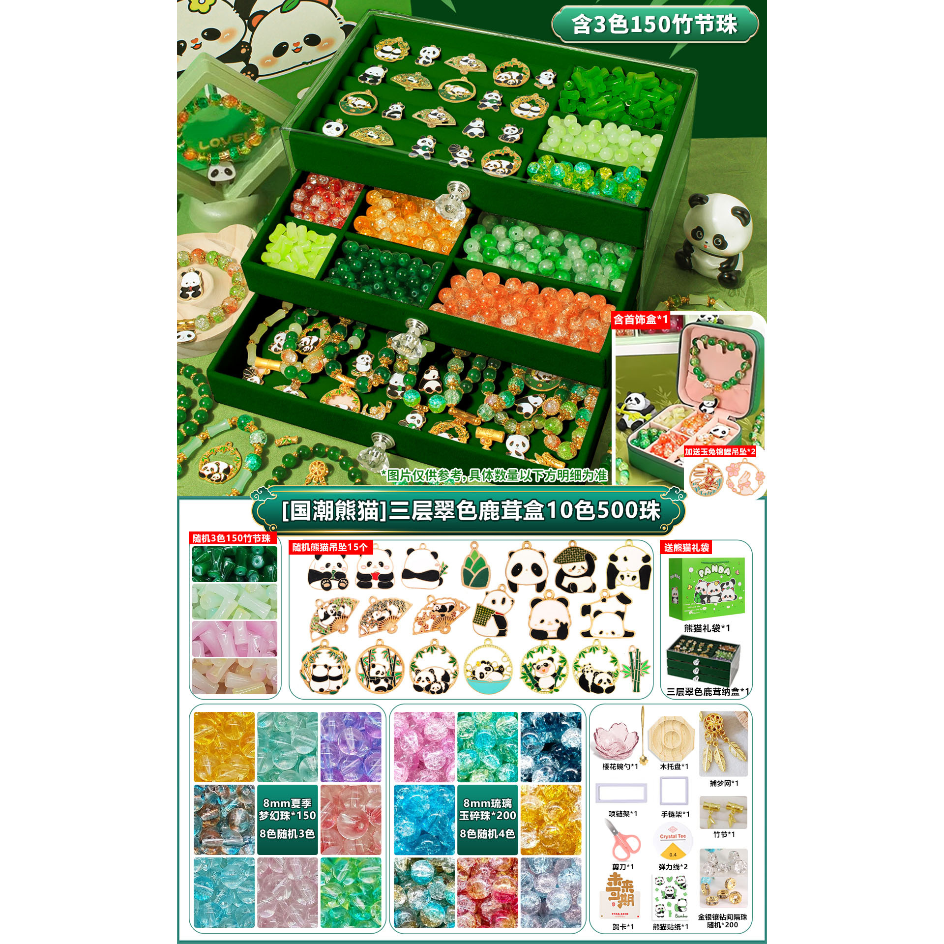 • Guochao Panda [3겹 에메랄드 그린 사슴 벨벳 상자 + 고급 보석 상자] 10가지 색상 500개(대나무 구슬 200개 포함) + 옥토끼 잉어 펜던트 + 선물 가방