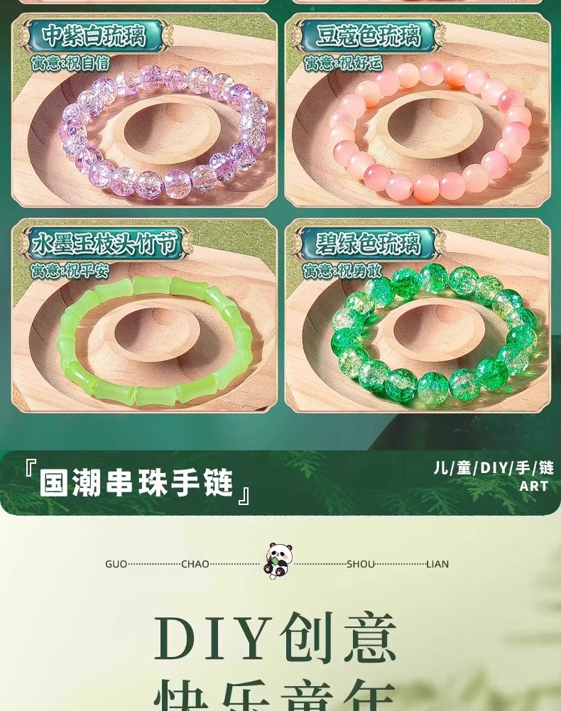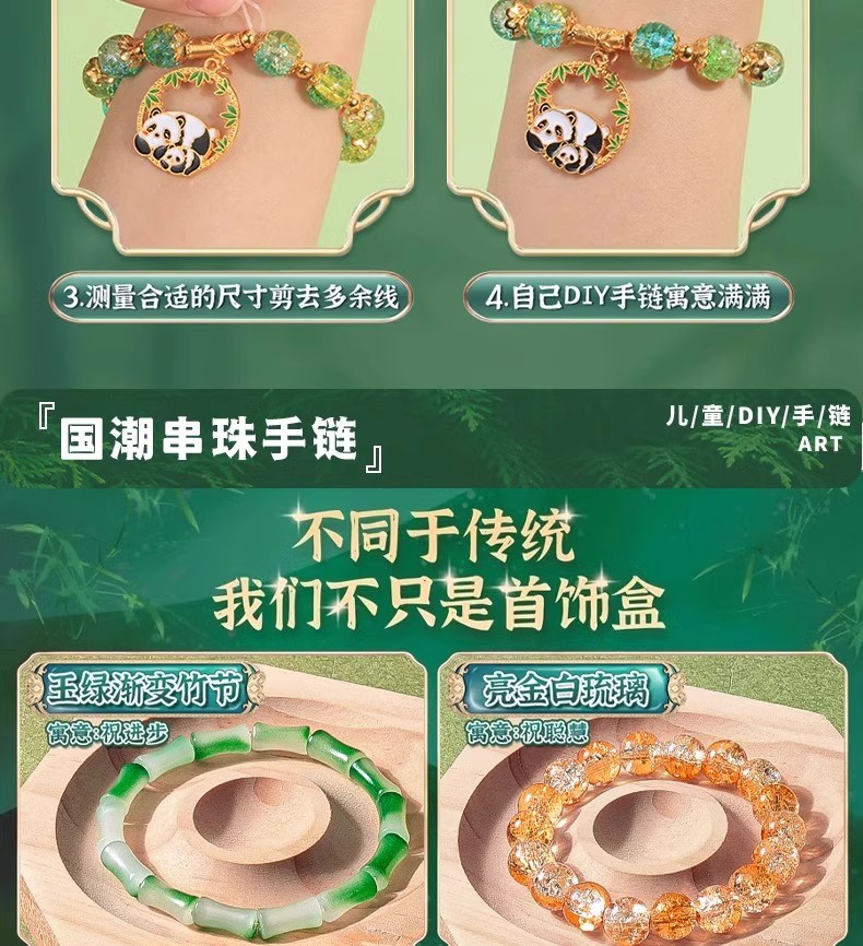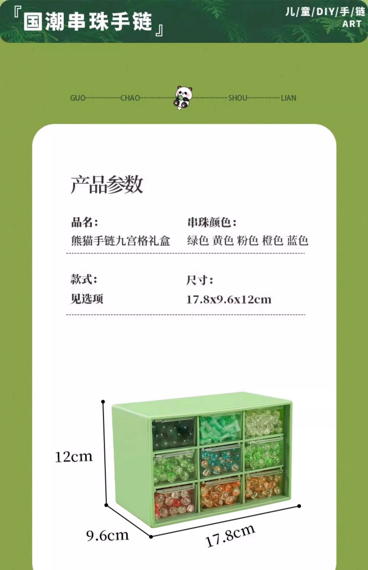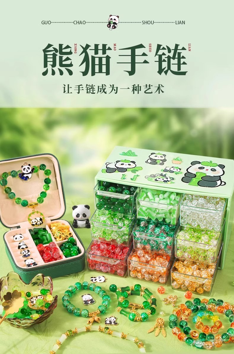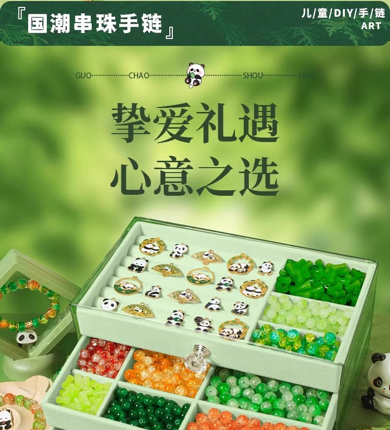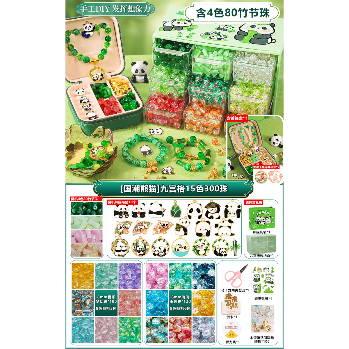 • Guochao Panda [3겹 에메랄드 그린 사슴 벨벳 상자 + 고급 보석 상자] 10가지 색상 500개(대나무 구슬 200개 포함) + 옥토끼 잉어 펜던트 + 선물 가방