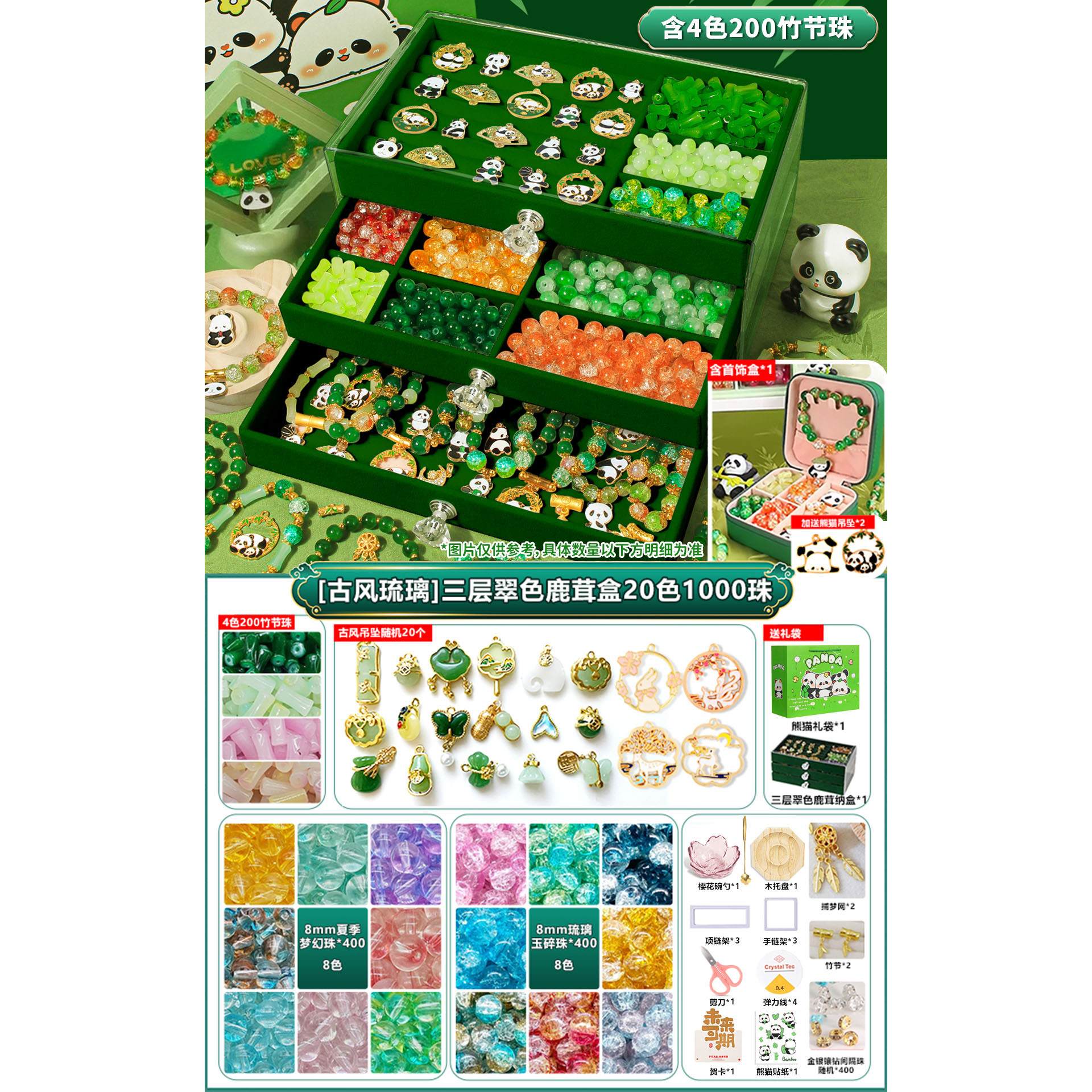 • Guochao Panda [3겹 에메랄드 그린 사슴 벨벳 상자 + 고급 보석 상자] 20가지 색상 1000개(대나무 구슬 200개 포함) + 옥토끼 잉어 펜던트 + 선물 가방