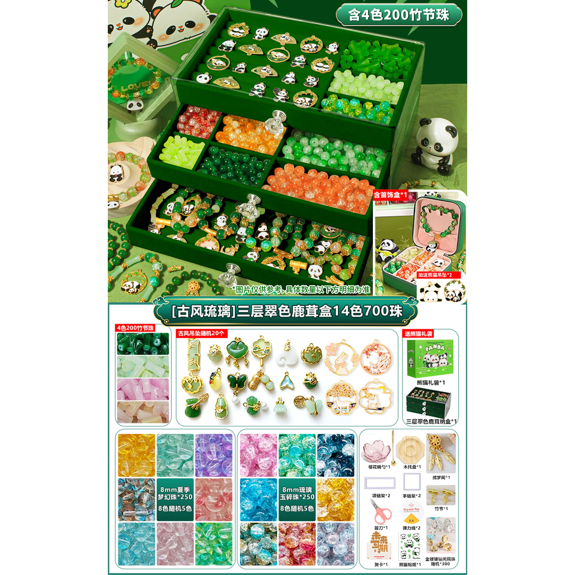 • 고대풍 유리 [3겹 에메랄드 그린 사슴 벨벳 상자 + 고급 보석 상자] 14색 700개(대나무 구슬 200개 포함) + 무료 팬더 펜던트 + 선물 가방