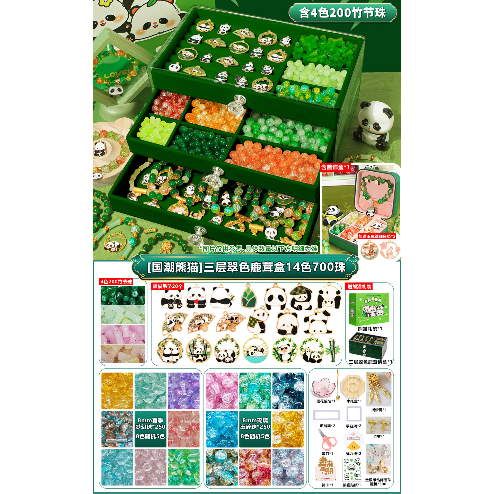 • Guochao Panda [3겹 에메랄드 그린 사슴 벨벳 상자 + 고급 보석 상자] 14가지 색상 700개(대나무 구슬 200개 포함) + 옥토끼 잉어 펜던트 + 선물 가방