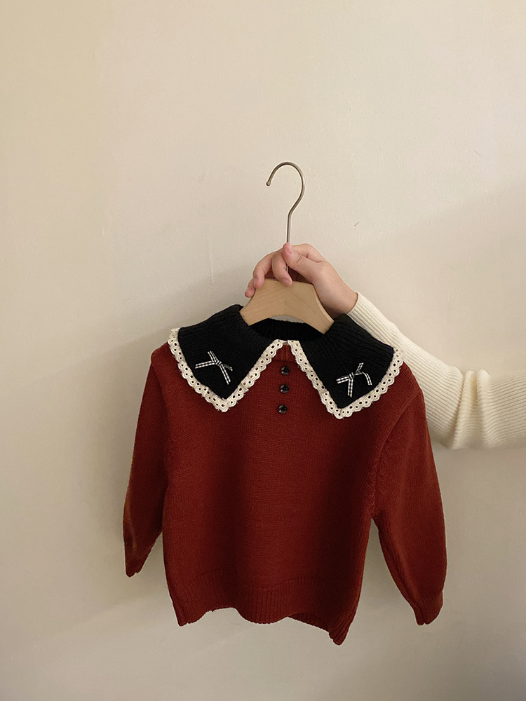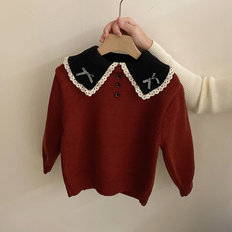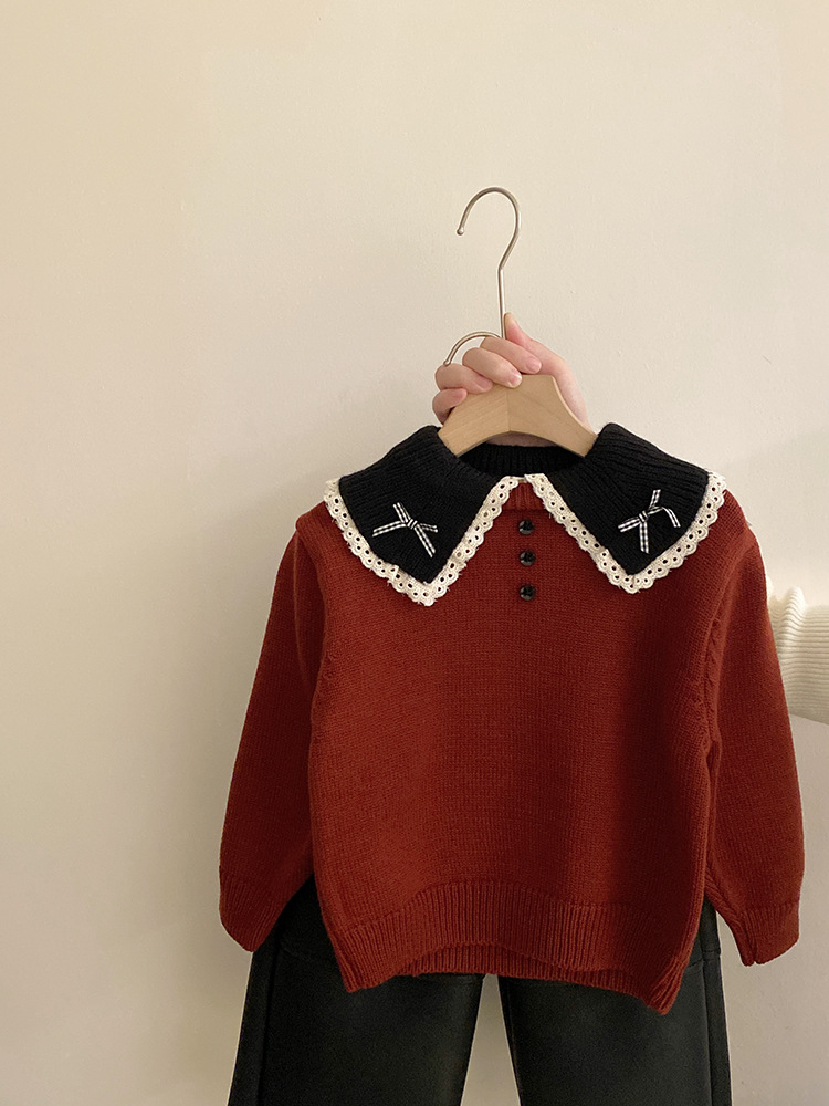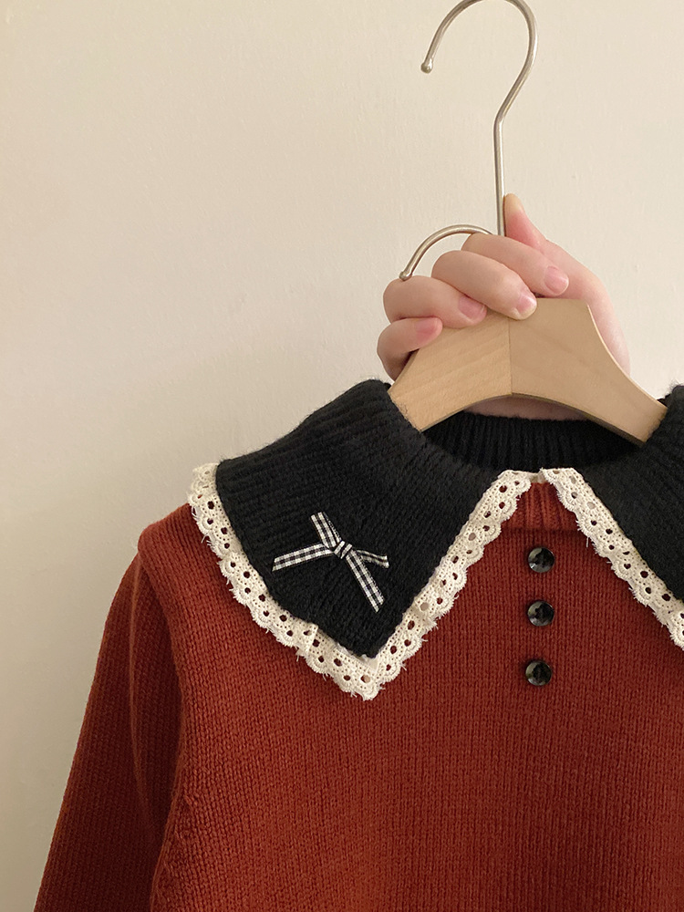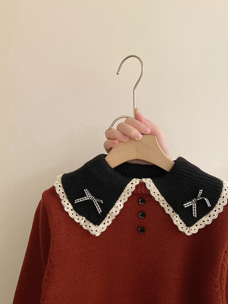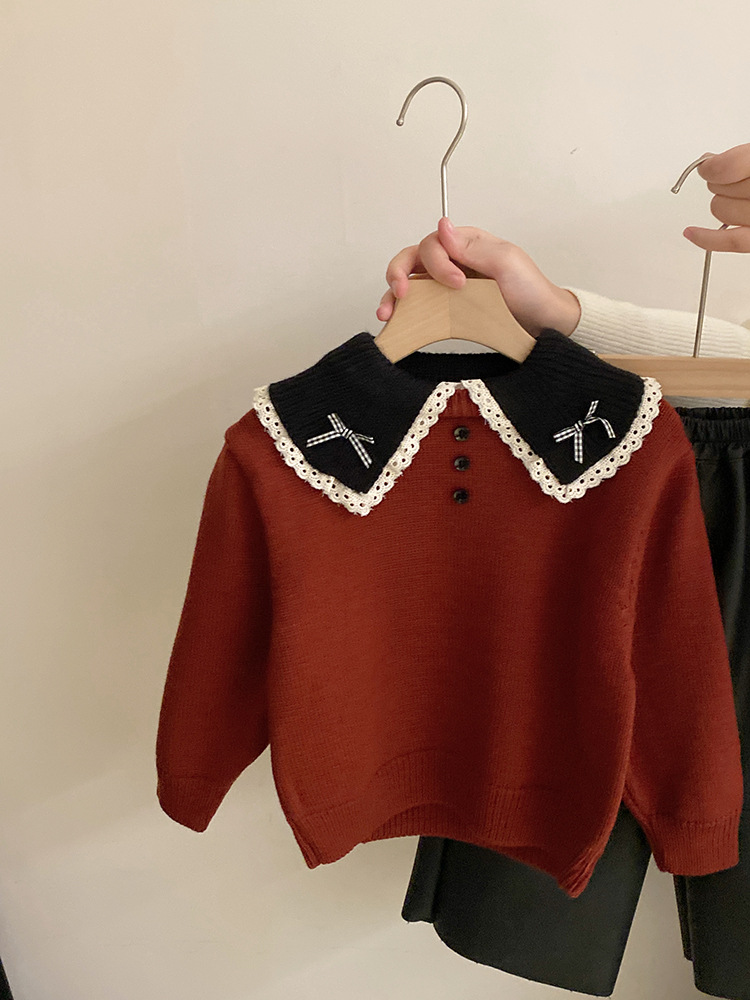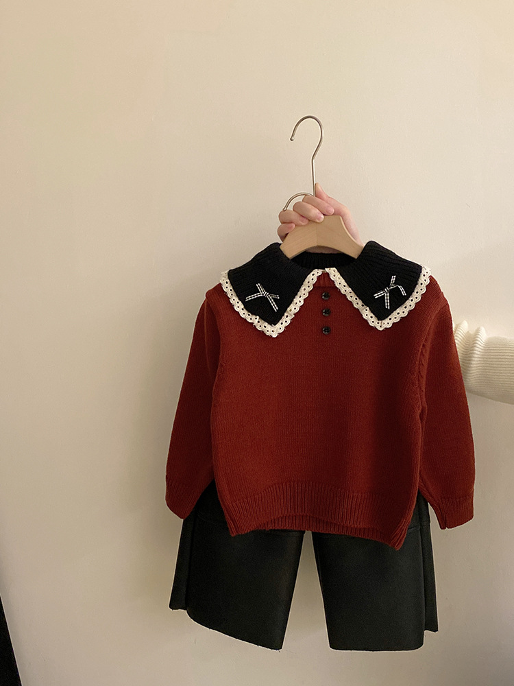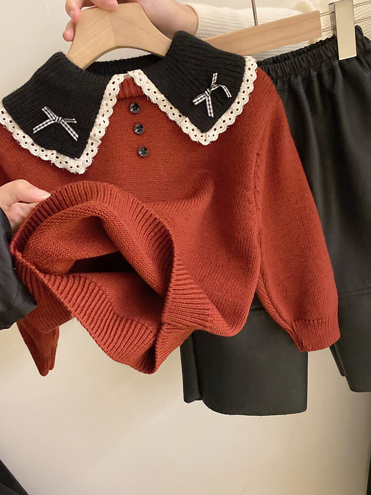 소녀 컬러 매칭 인형 칼라 활 니트 스웨터 2024 가을과 겨울 새로운 기모 따뜻한 가죽 바지 패션 세트