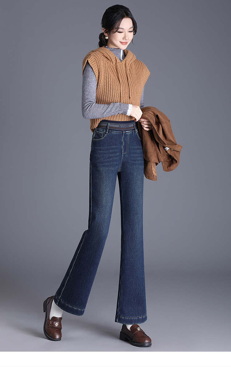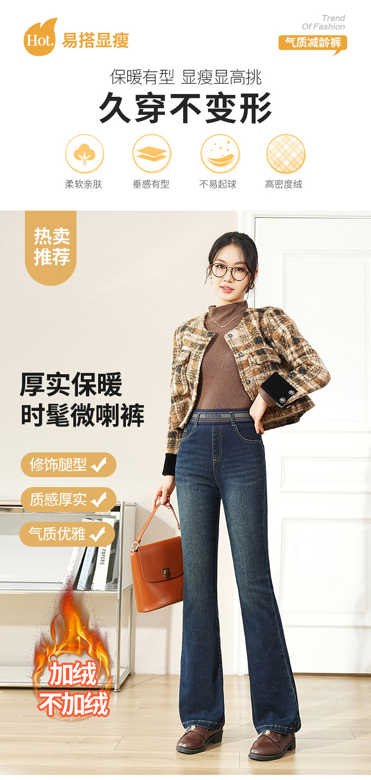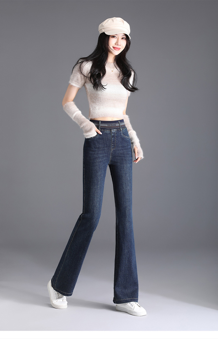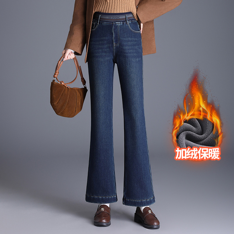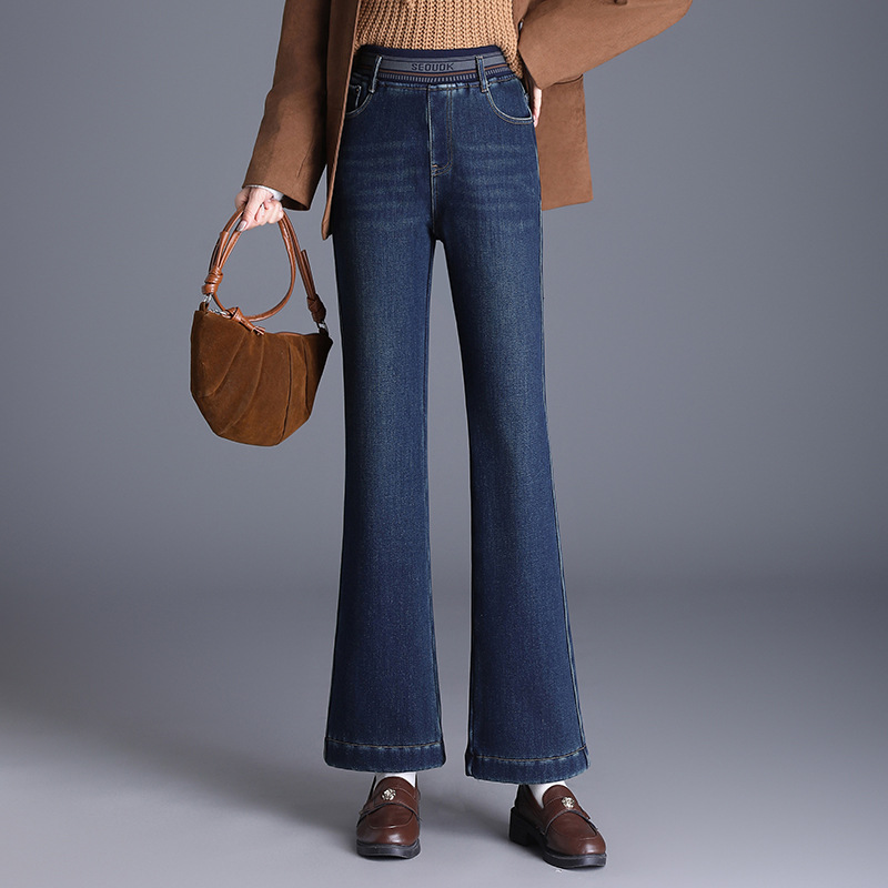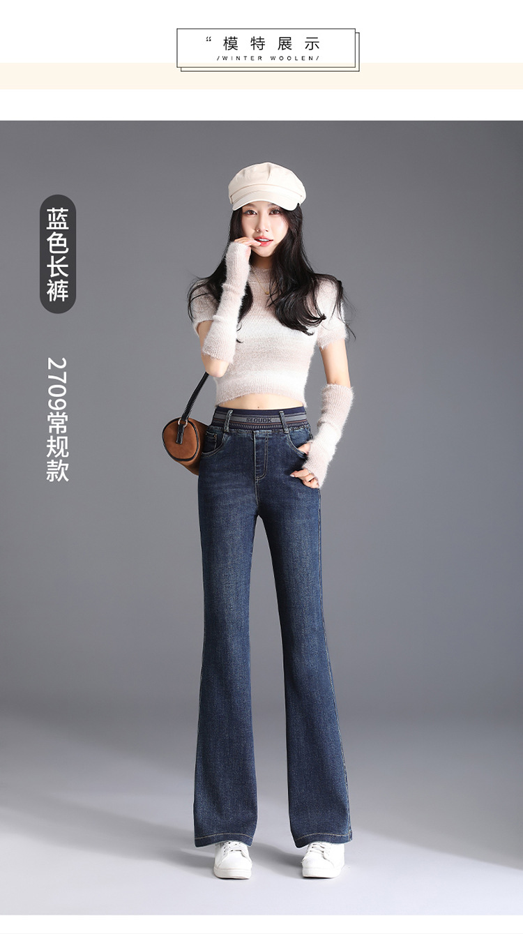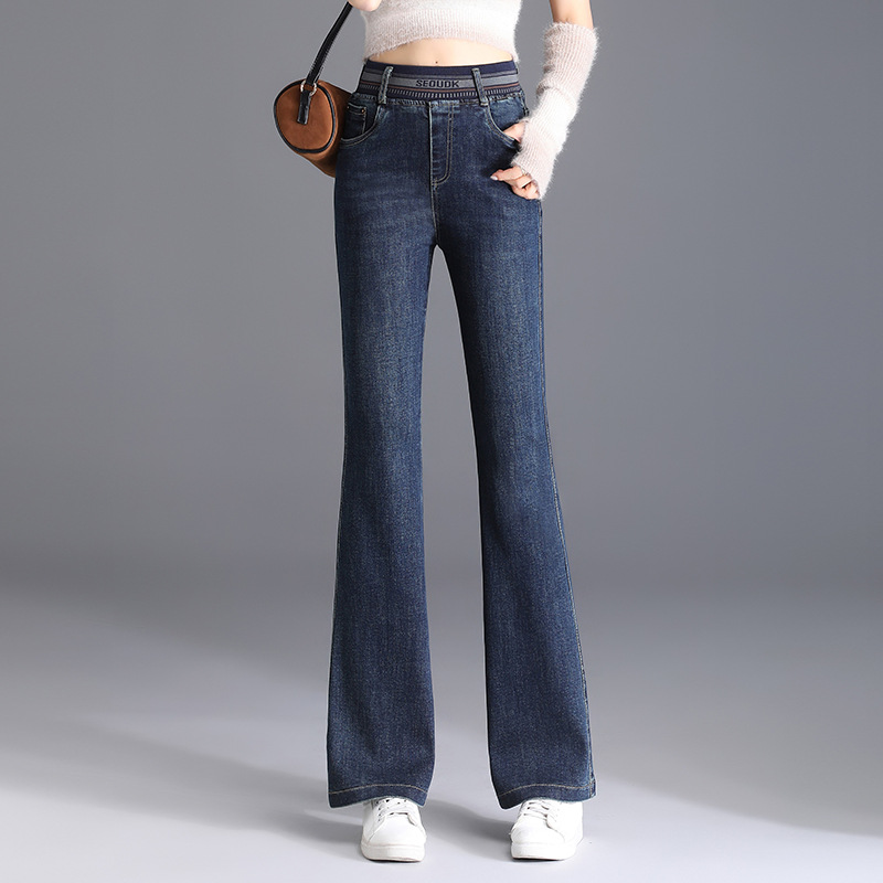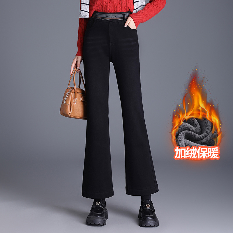 자른 스트레치 데님 바지 여성용 높은 허리 가을 겨울 기모 작은 슬림 핏 다리-긴 트럼펫 바지