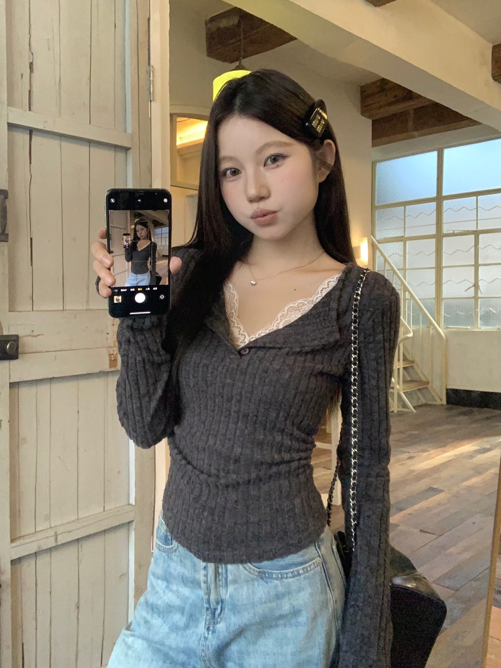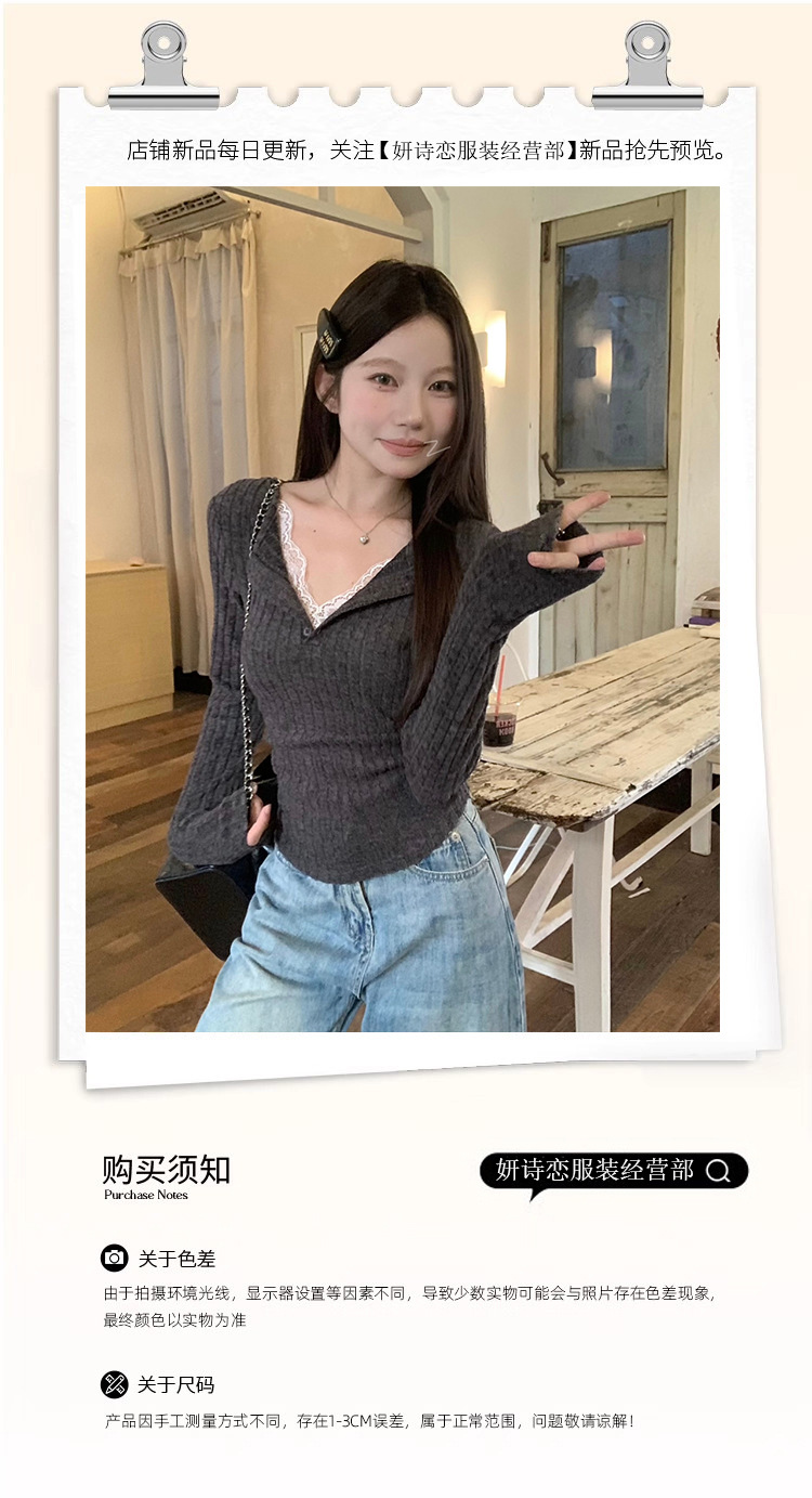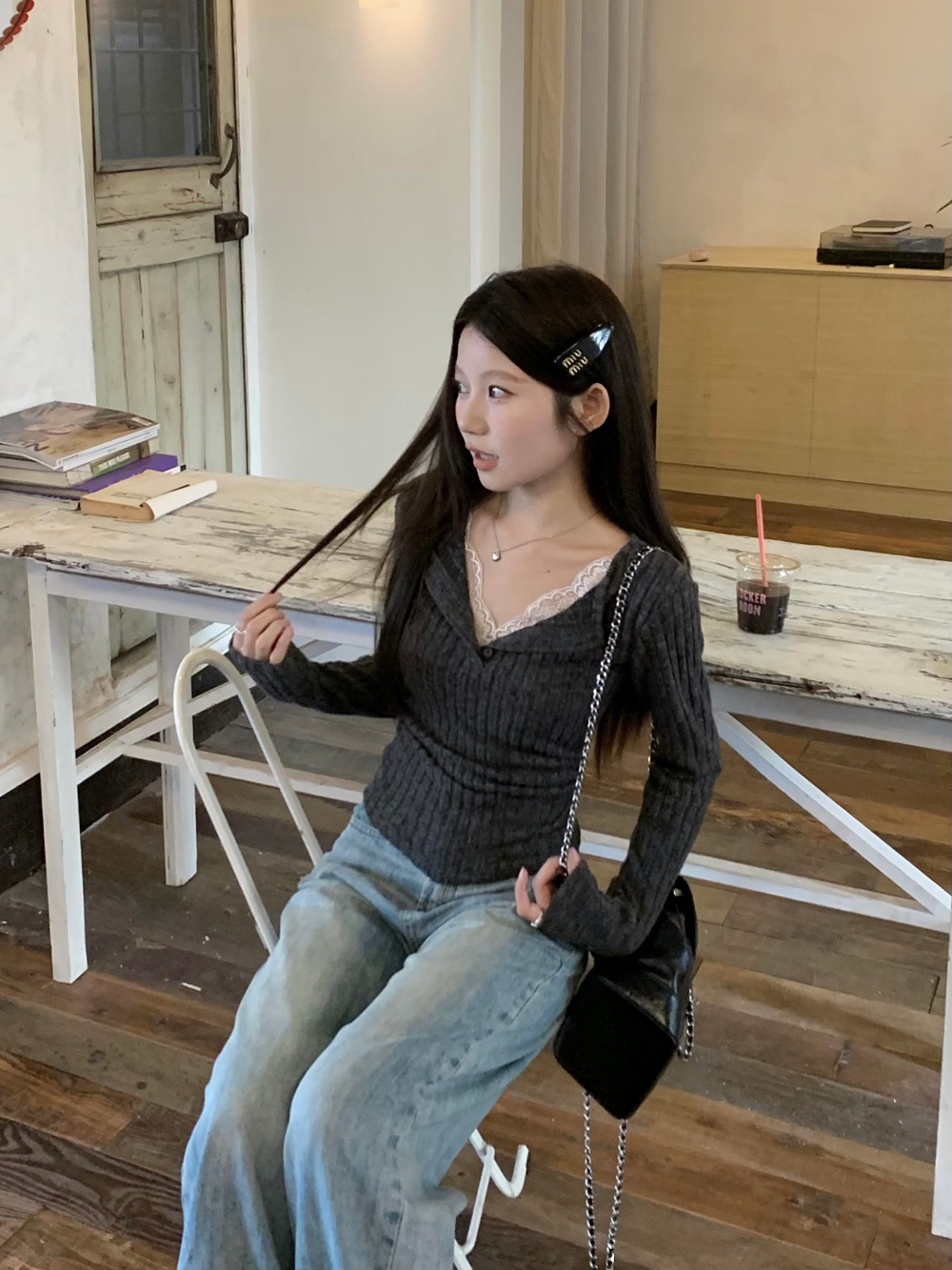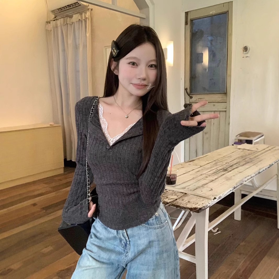 회색 가짜 투피스 레이스 V 넥 긴팔 티셔츠 여성의 봄과 가을 세련된 달콤한 스파이스 소녀 내베이스 셔츠 쇼트 탑스토어 가기