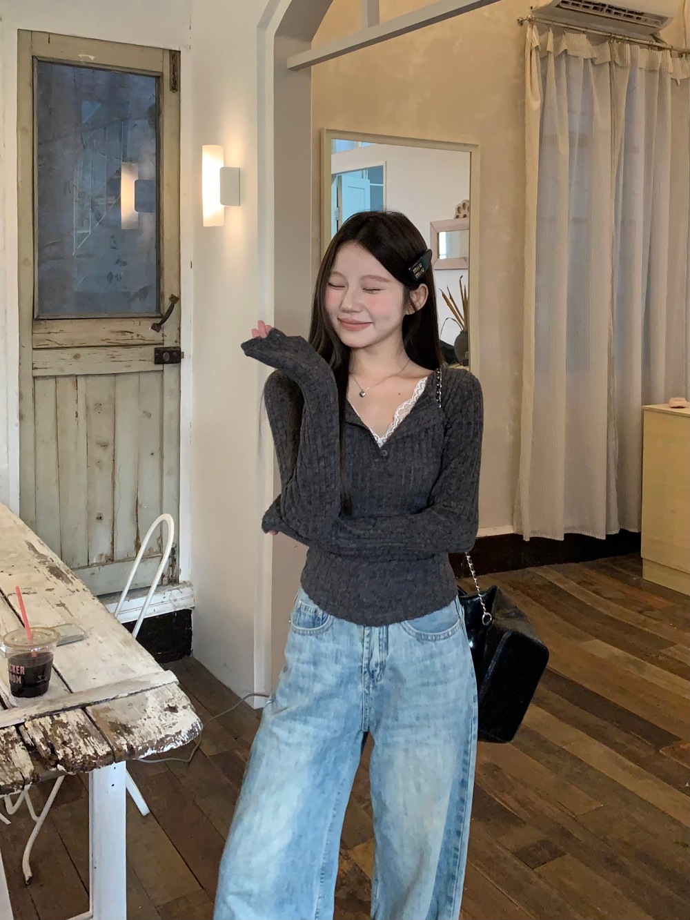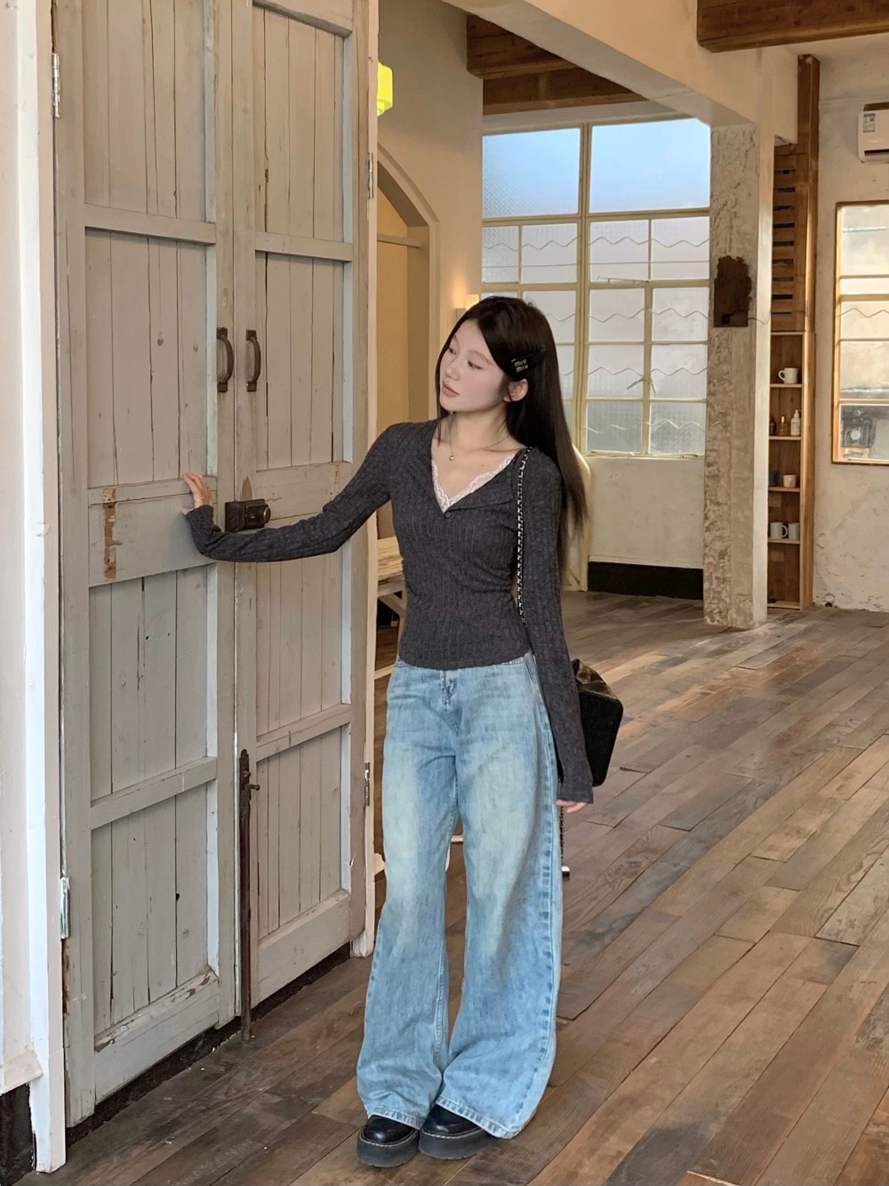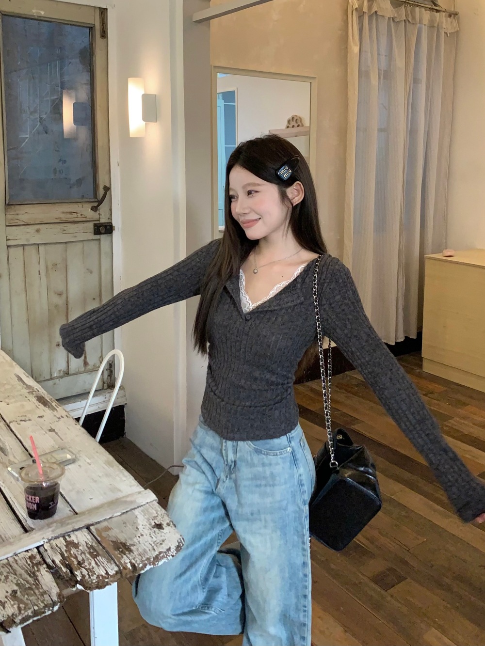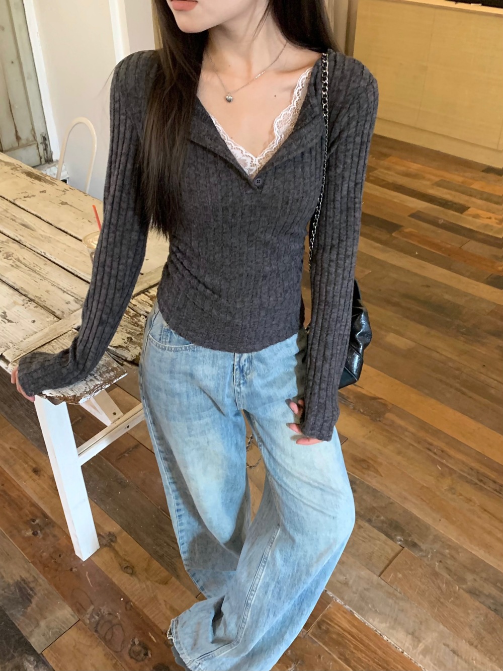 회색 가짜 투피스 레이스 V 넥 긴팔 티셔츠 여성의 봄과 가을 세련된 달콤한 스파이스 소녀 내베이스 셔츠 쇼트 탑스토어 가기