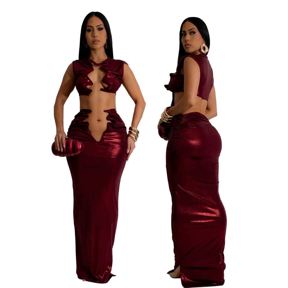 CY901598 유럽과 미국 아마존 국경 간 섹시한 여성 패션 단색 세트 민소매 짧은 톱 롱 스커트