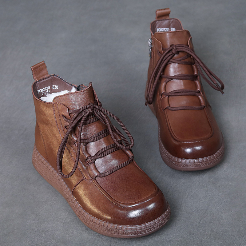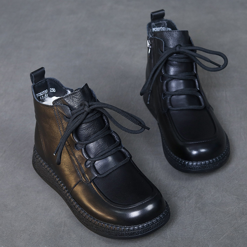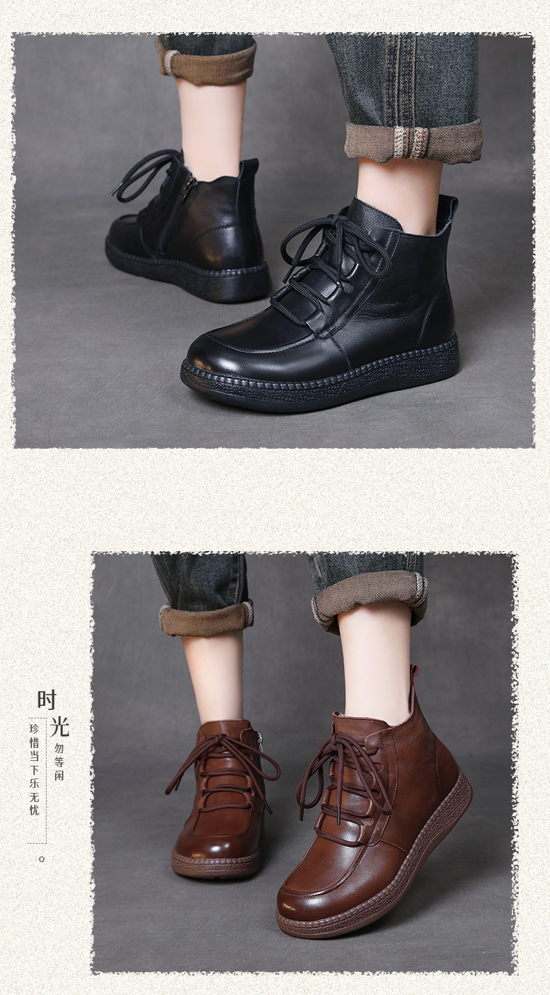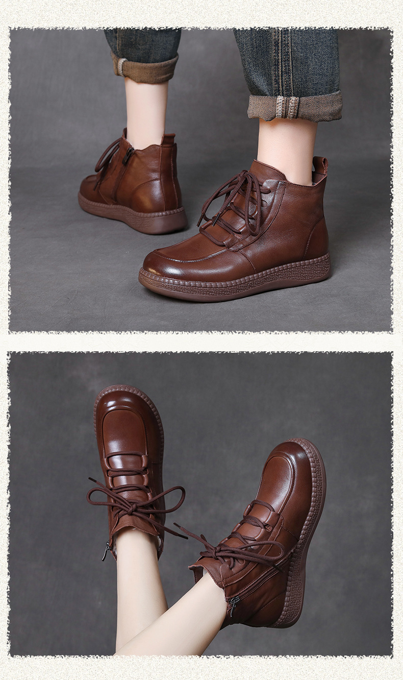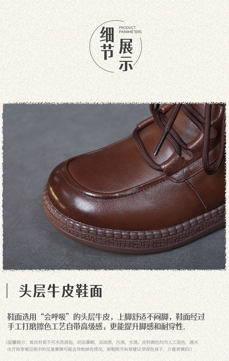 탑 레이어 소 가죽 빈티지 울 짧은 부츠 여성의 2024 겨울 새로운 라운드 헤드 프론트 레이스 업 마틴 부츠 기모 코튼 부츠스토어 가기