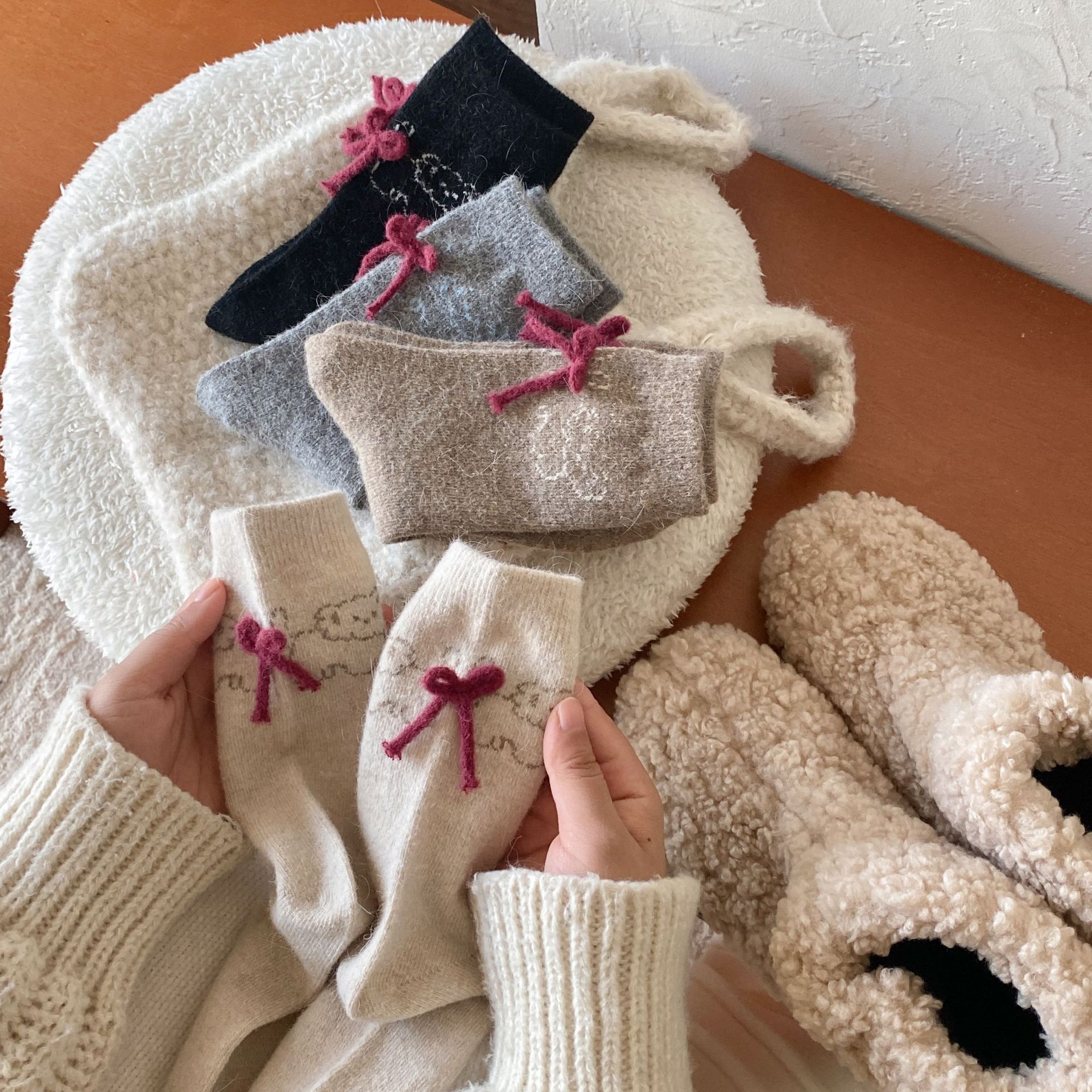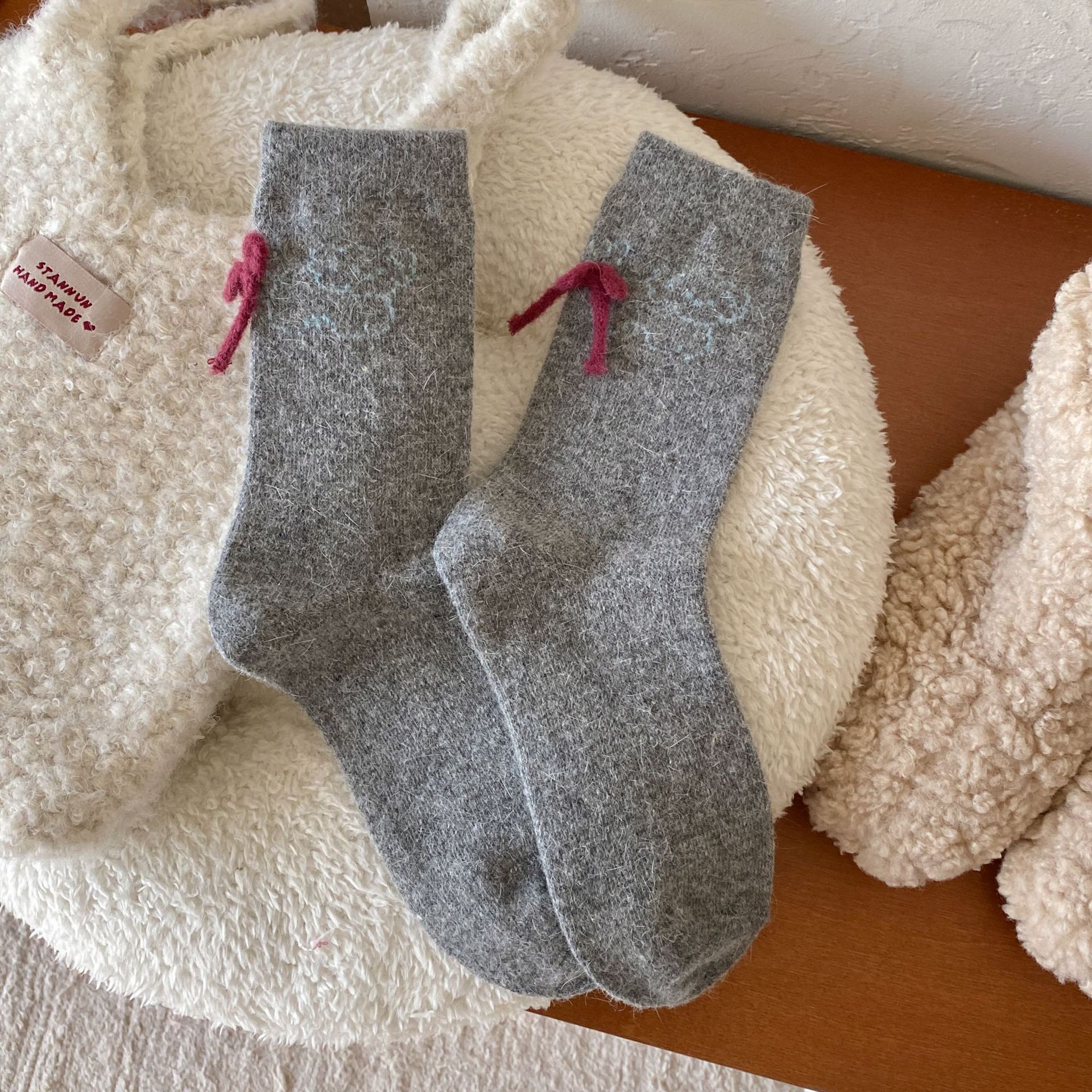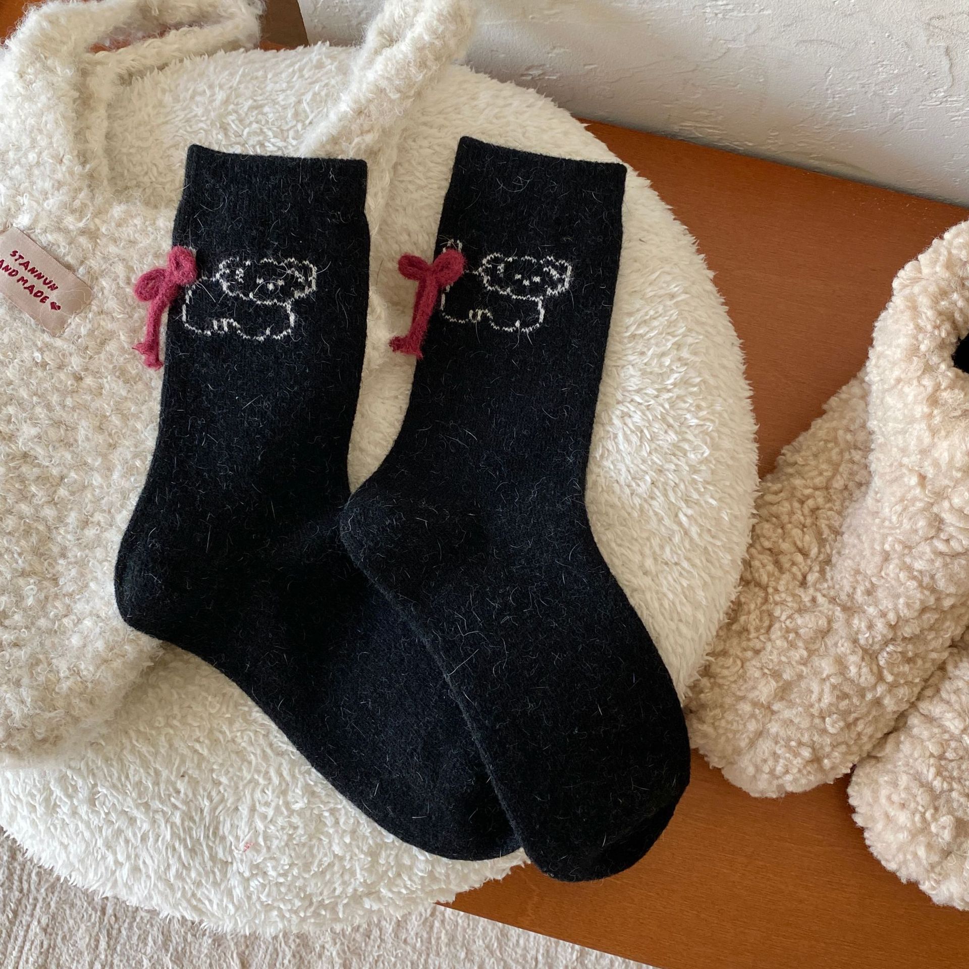 양모 강아지+리본 겨울 양말 여성용 매우 귀엽고 따뜻한 한국 스타일 인스 스타일 중간 길이 양말 여성용 양말