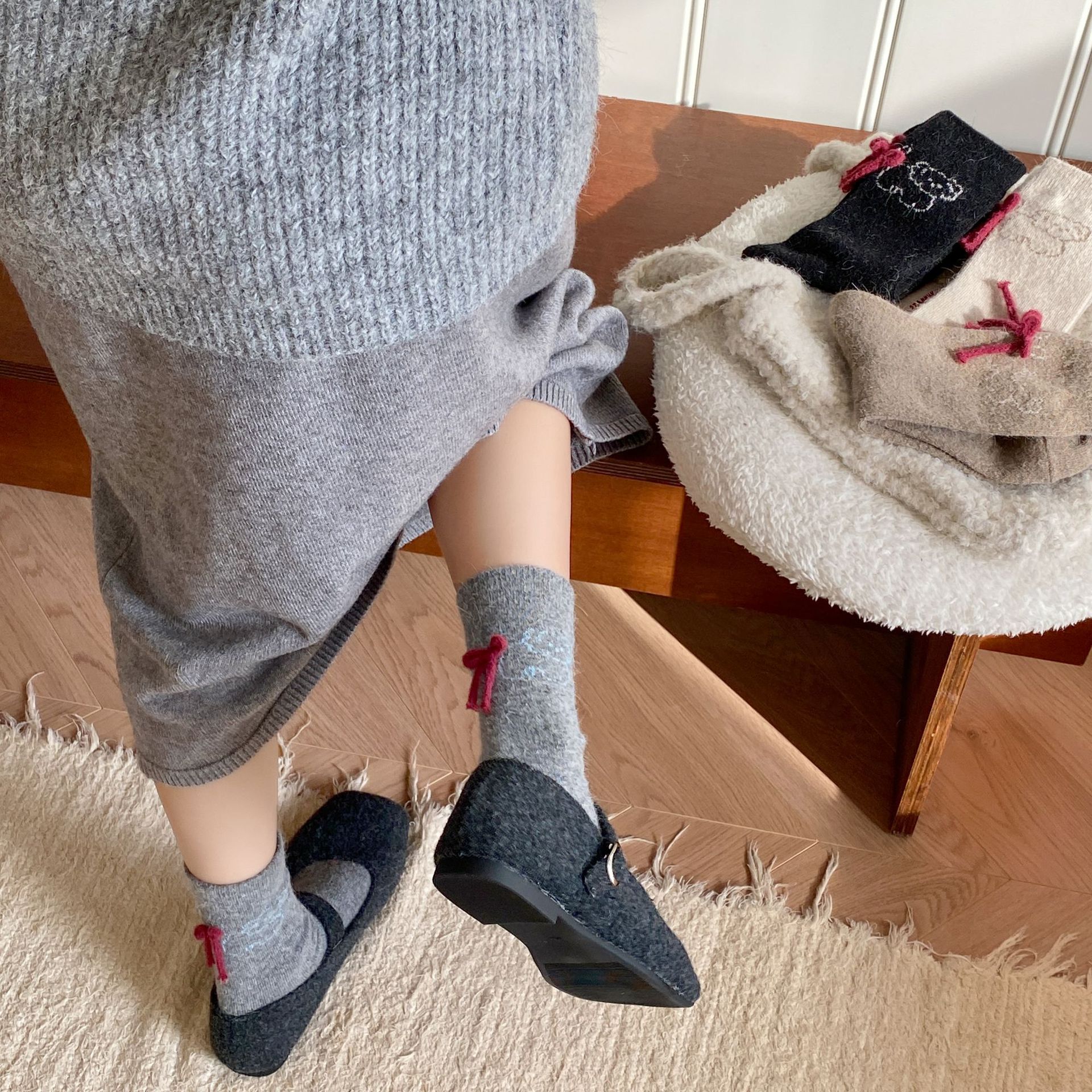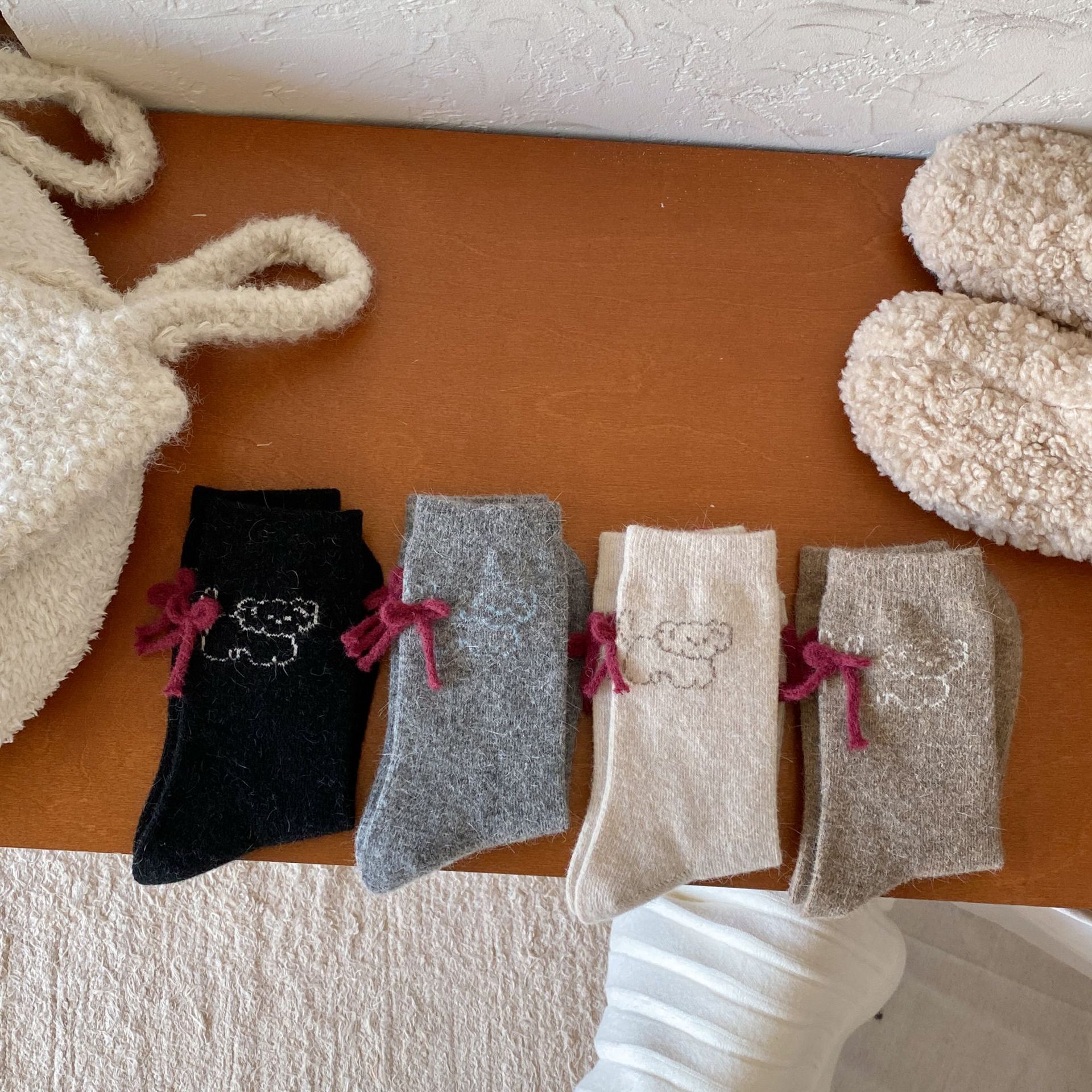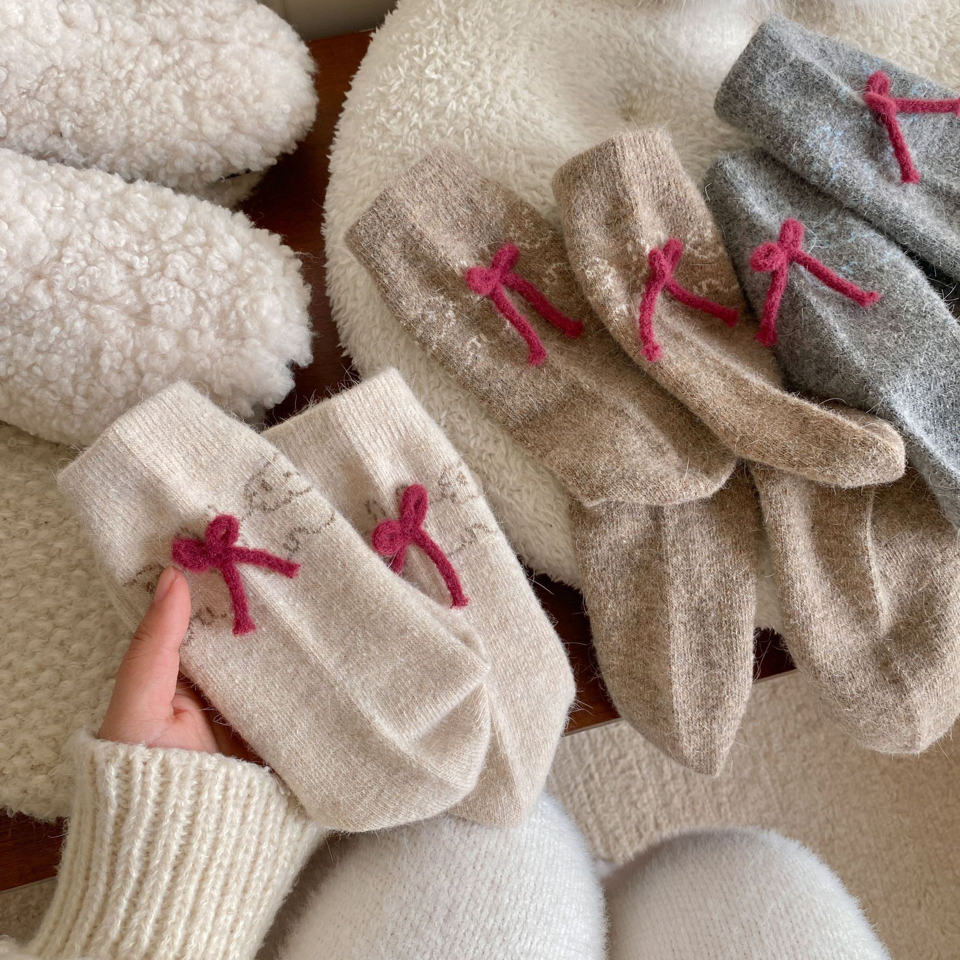 양모 강아지+리본 겨울 양말 여성용 매우 귀엽고 따뜻한 한국 스타일 인스 스타일 중간 길이 양말 여성용 양말