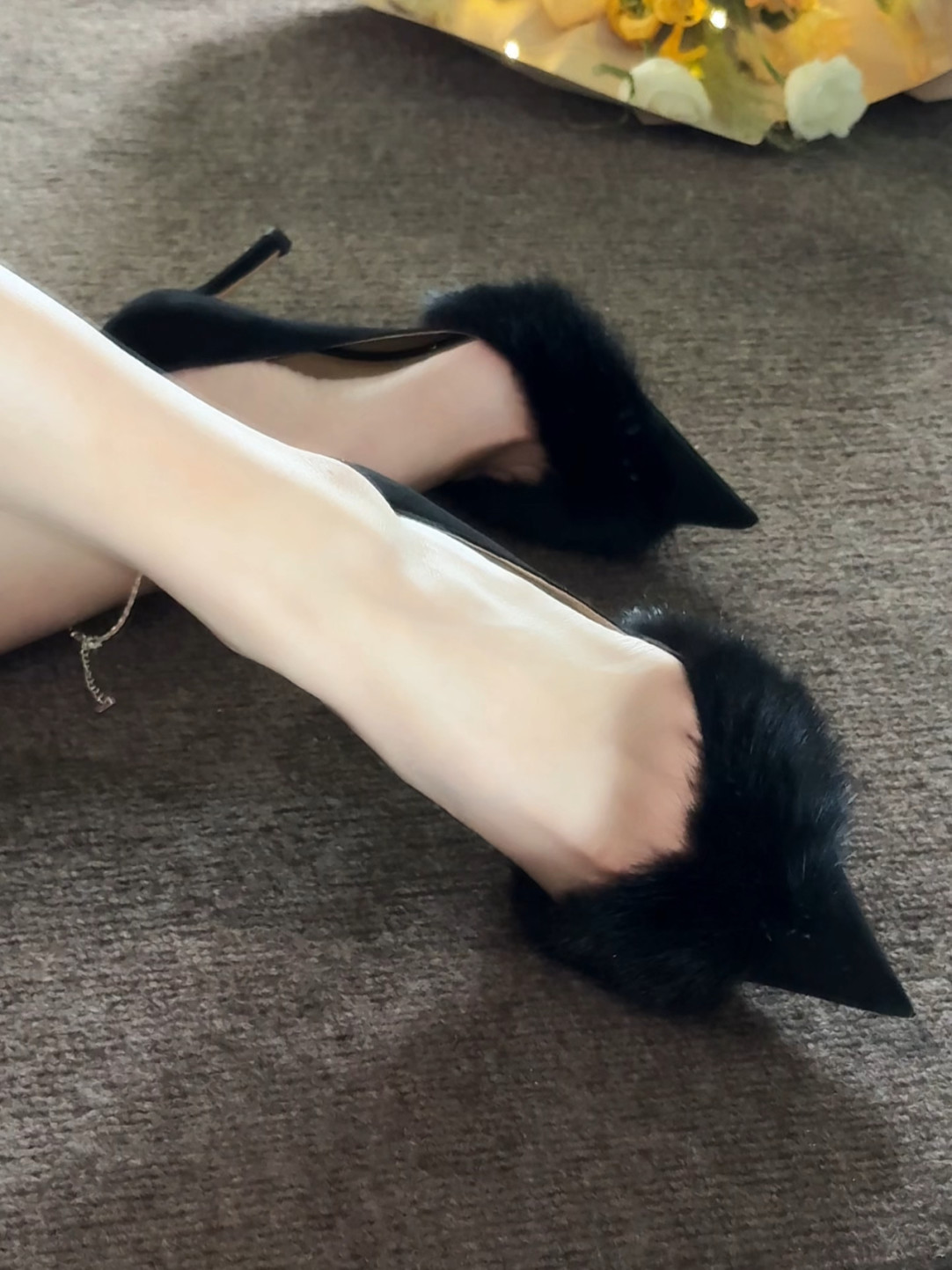 2026 가을 겨울 신상 블랙 퍼 뾰족코 하이힐 여성스러운 기질의 프렌치 스타일 얕은 굽 얇은 굽 구두스토어 가기