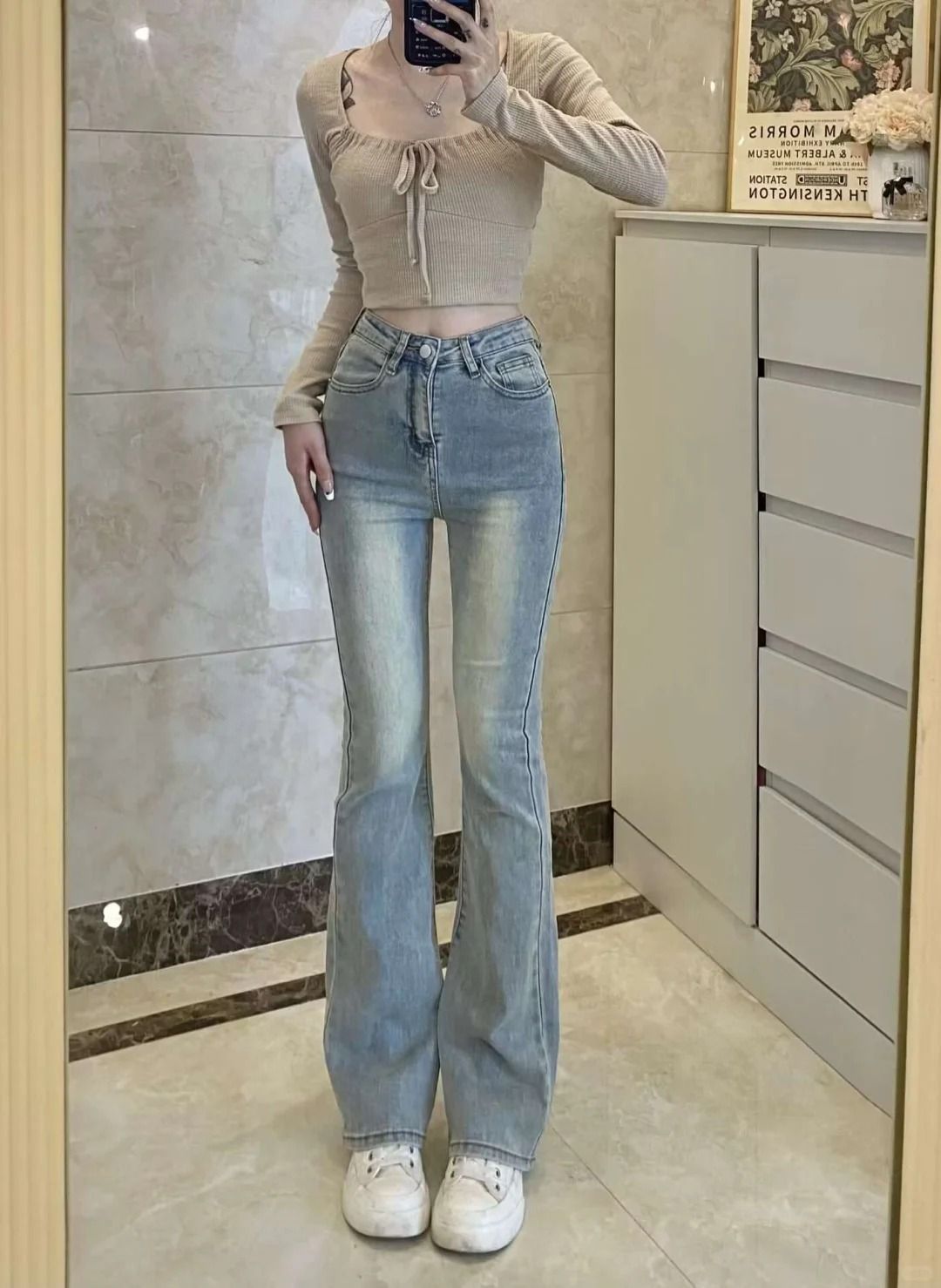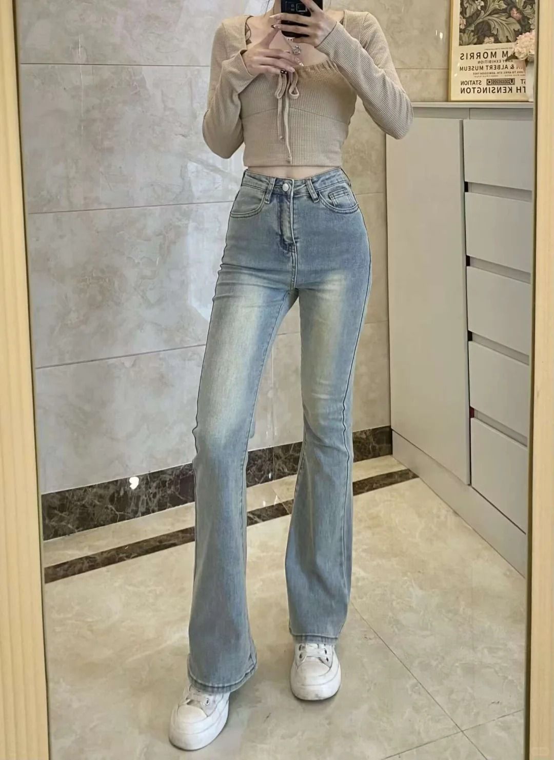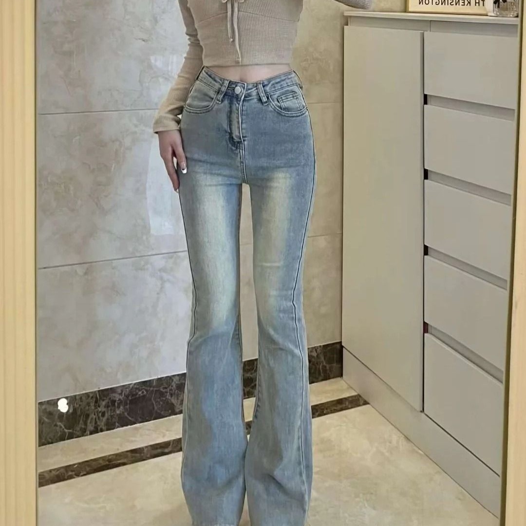 아메리칸 스타일 마이크로 플레어 청바지 여성 여름 새로운 복고풍 높은 허리 탄성 슬림 키가 큰 스파이스 걸스 말굽 바지스토어 가기