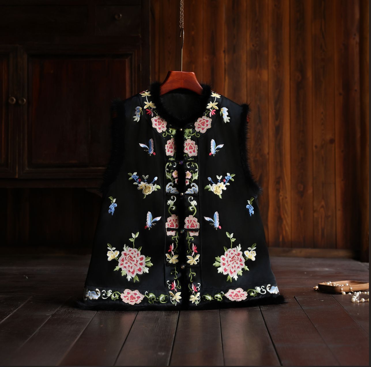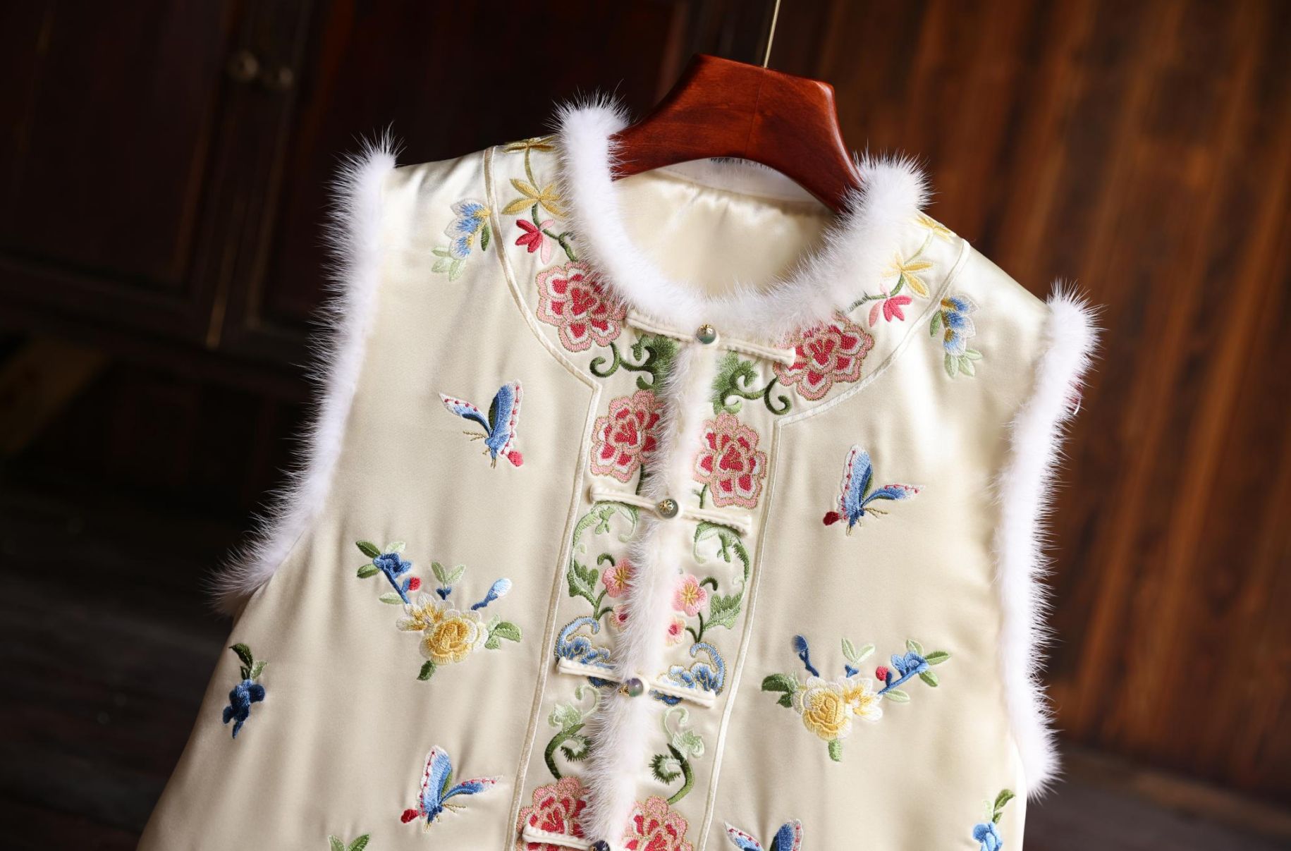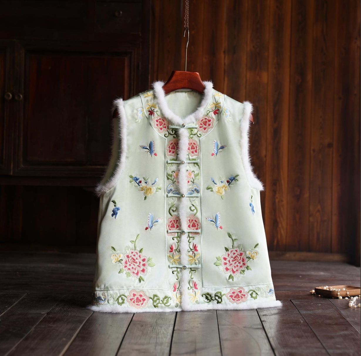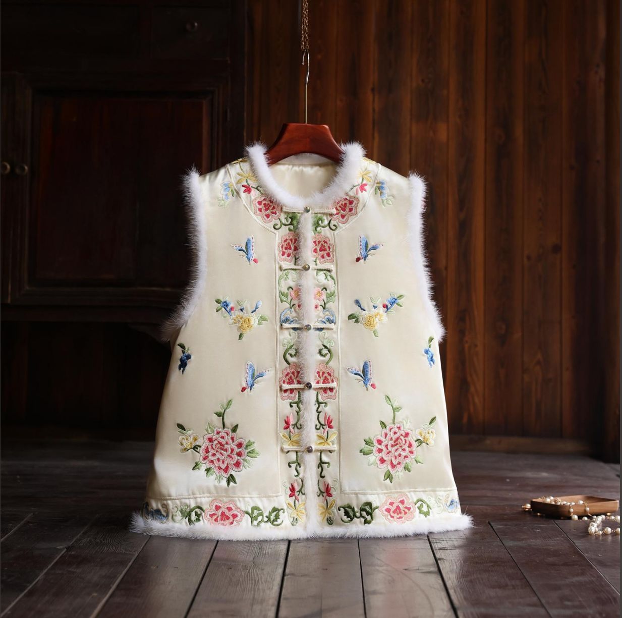 겨울 새로운 Guofeng 버클 바느질 밍크 아세트산 새로운 중국 스타일 빈티지 중공업 자수 조끼 어깨 가운 여성