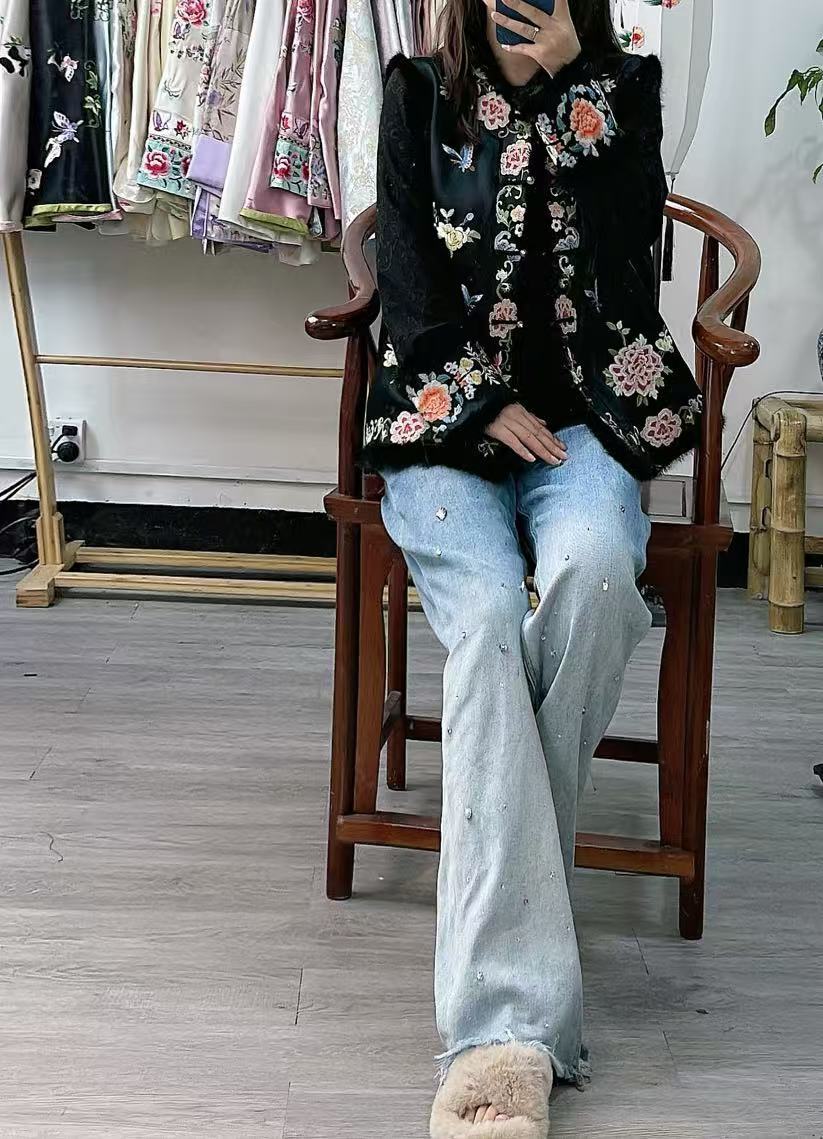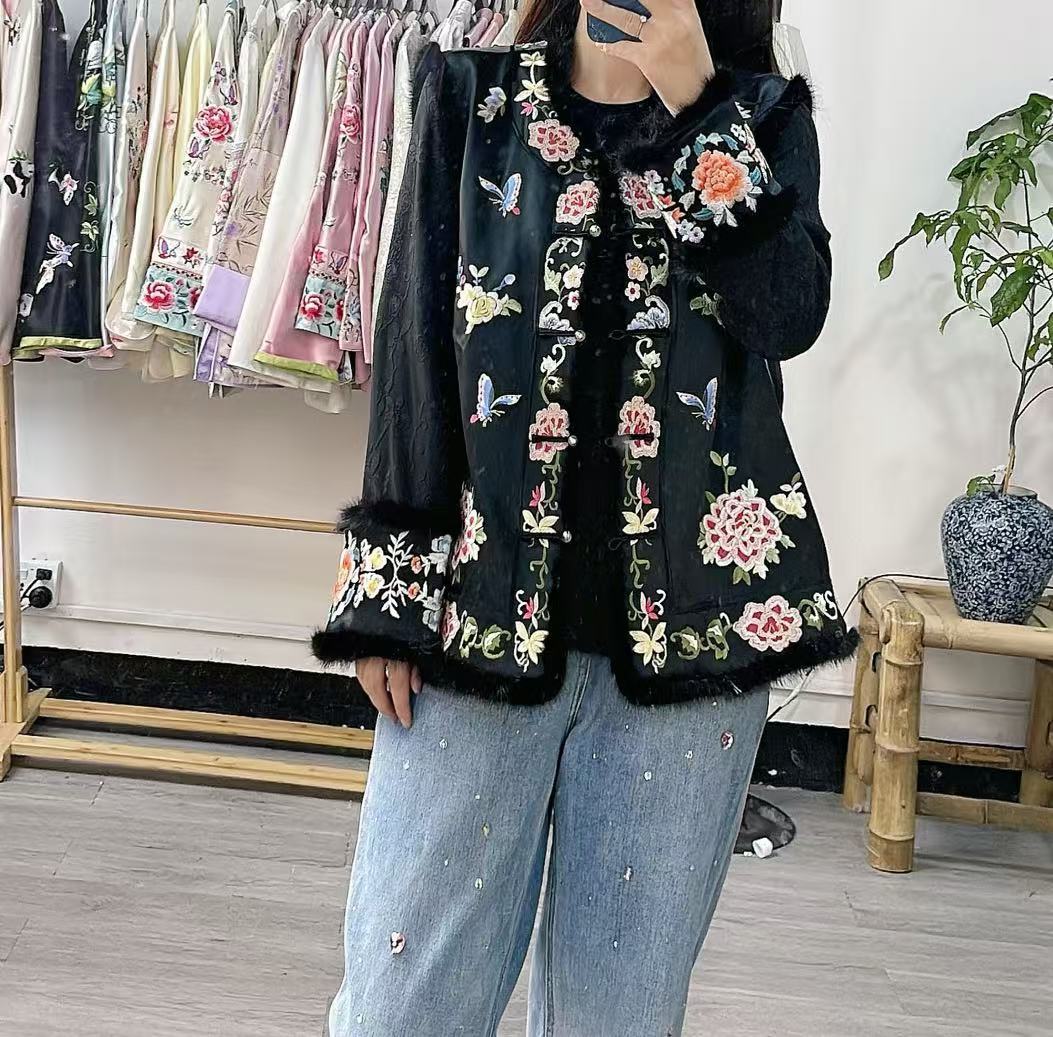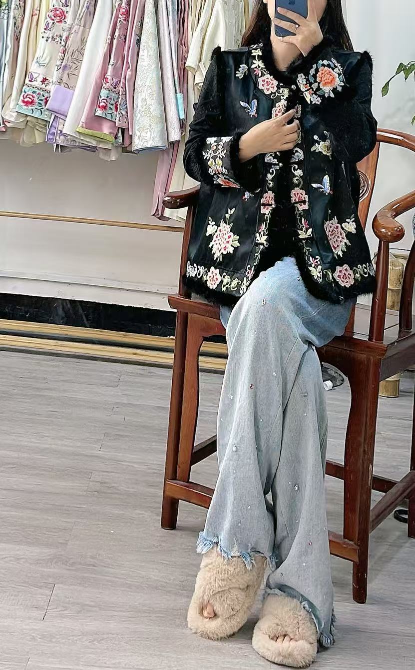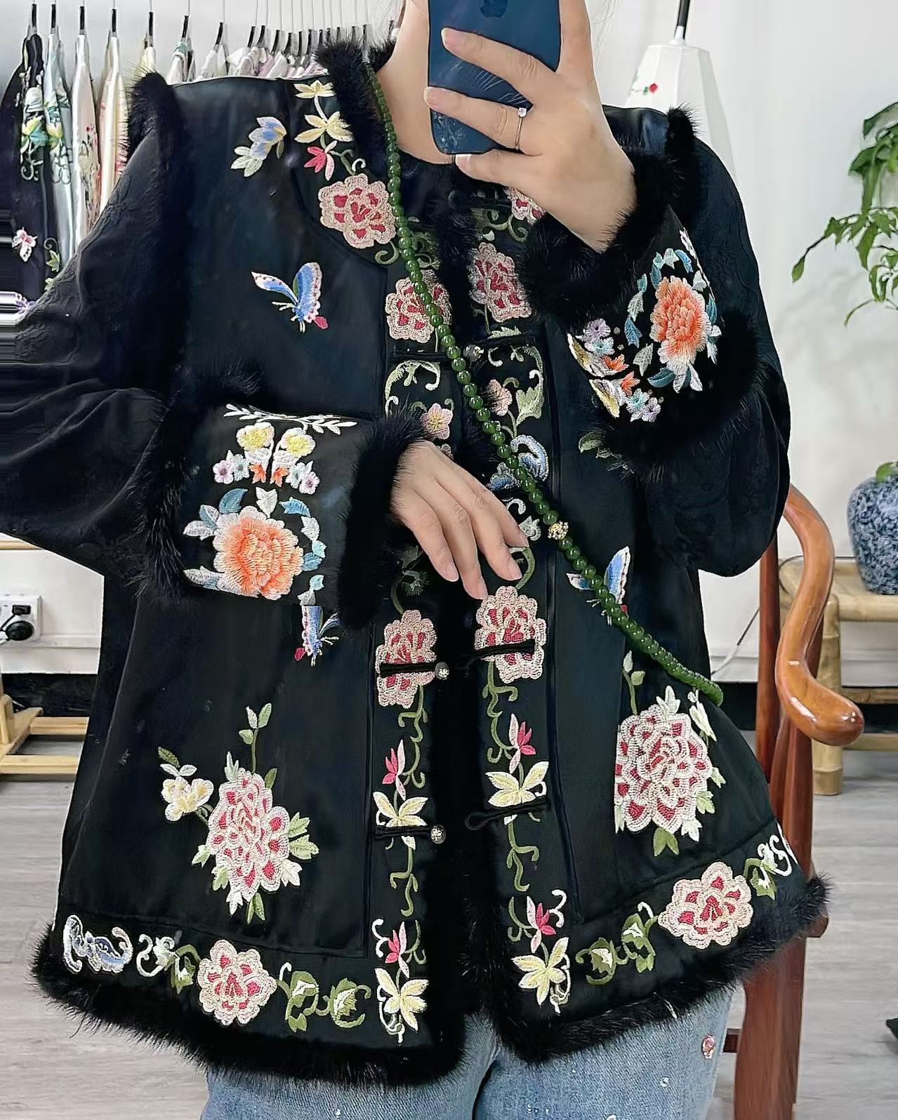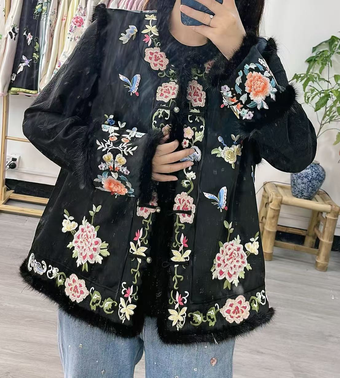 겨울 새로운 Guofeng 버클 바느질 밍크 아세트산 새로운 중국 스타일 빈티지 중공업 자수 조끼 어깨 가운 여성