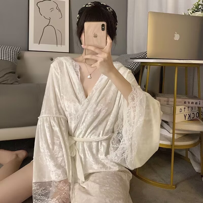 잠옷 여성의 가을과 겨울 잠옷 섹시한 목욕 가운 레이스 순수 궁전 스타일 홈 옷 긴 플러스 사이즈 신부 아침 가운스토어 가기