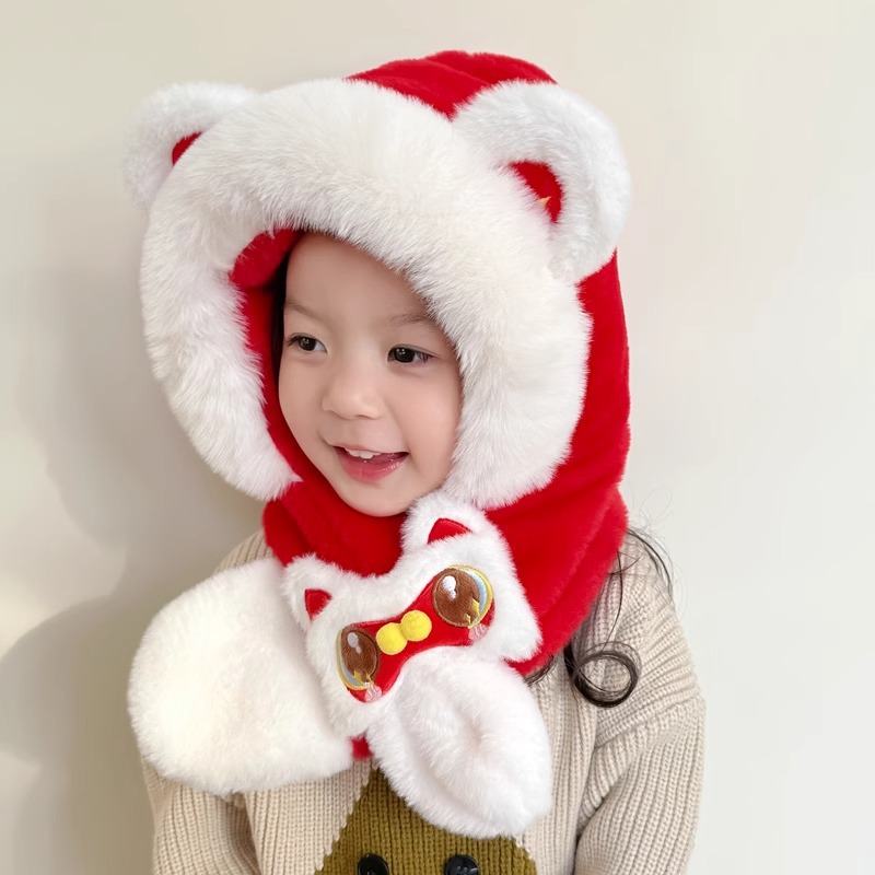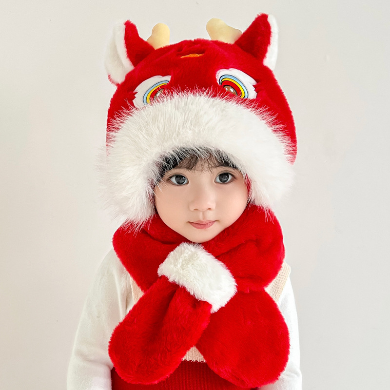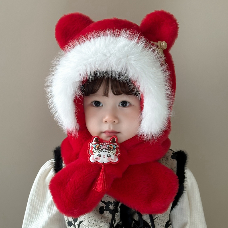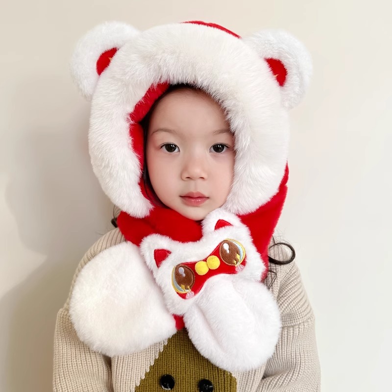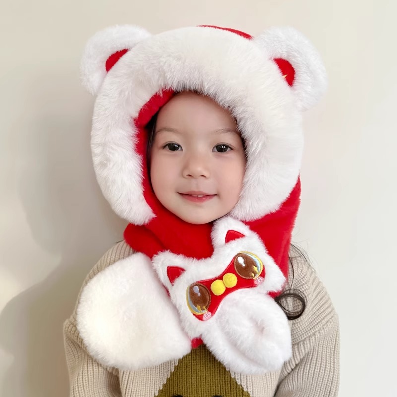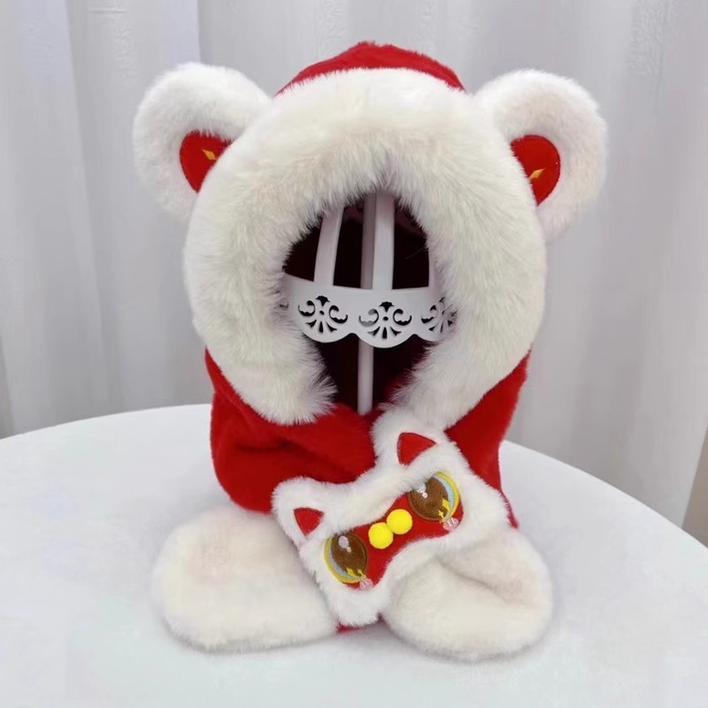 가을과 겨울 아기 모자 귀여운 봉제 스카프 통합 모자 빨간 사자 춤 새해 축제 따뜻한 모자 소년 소녀