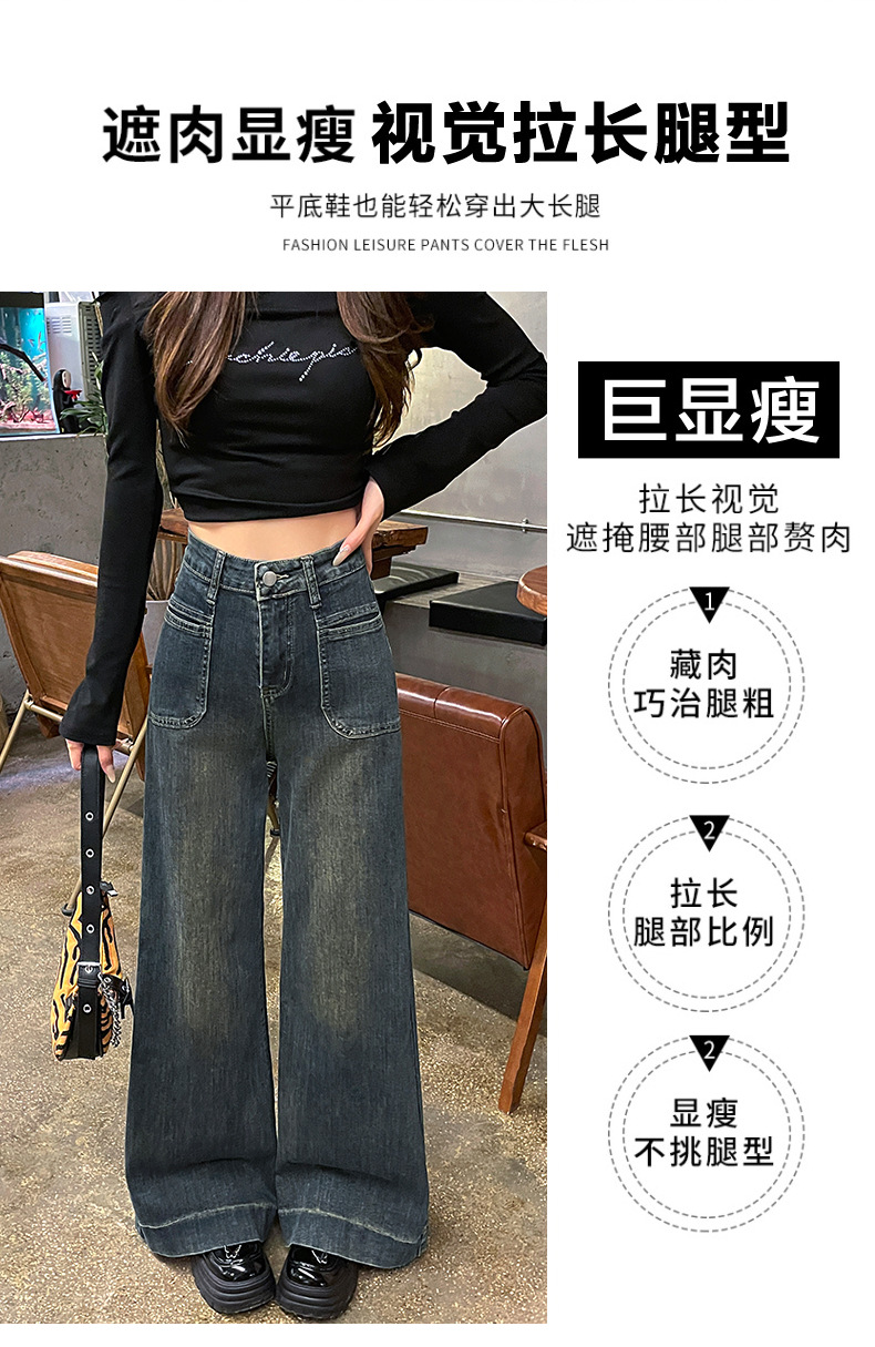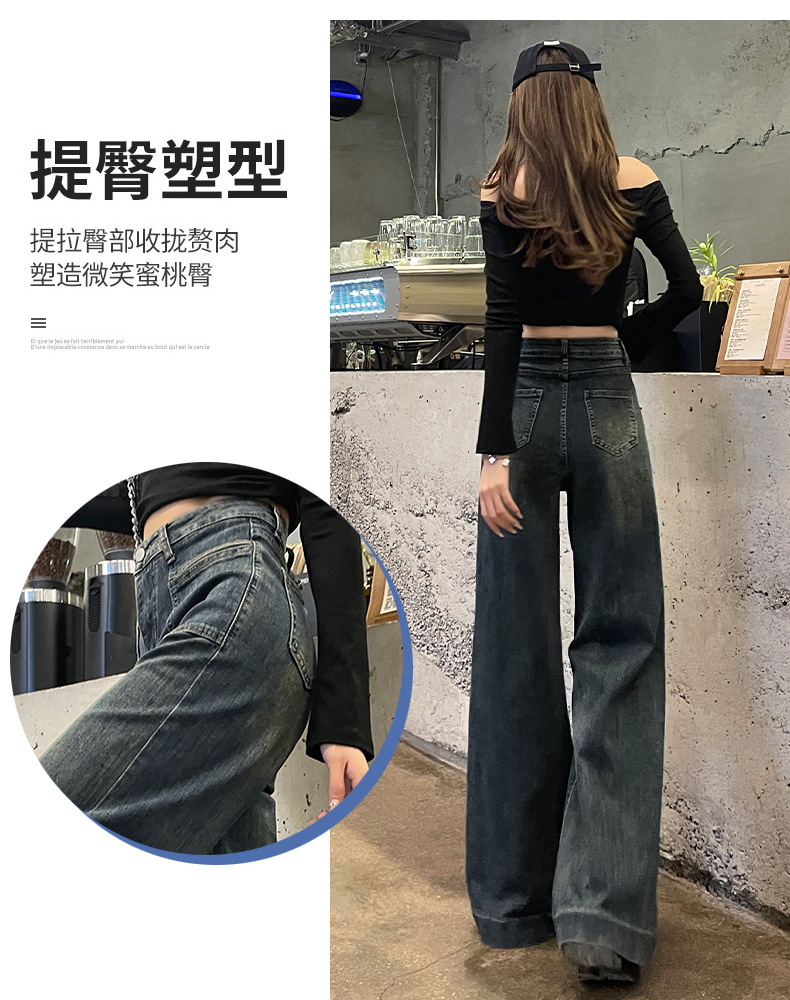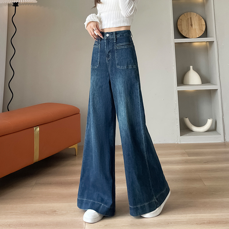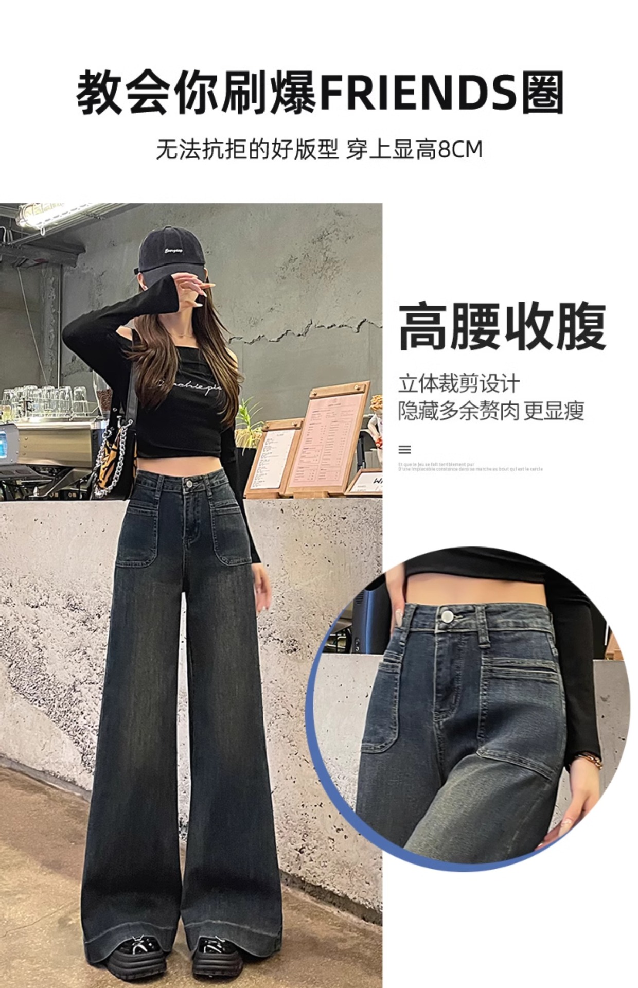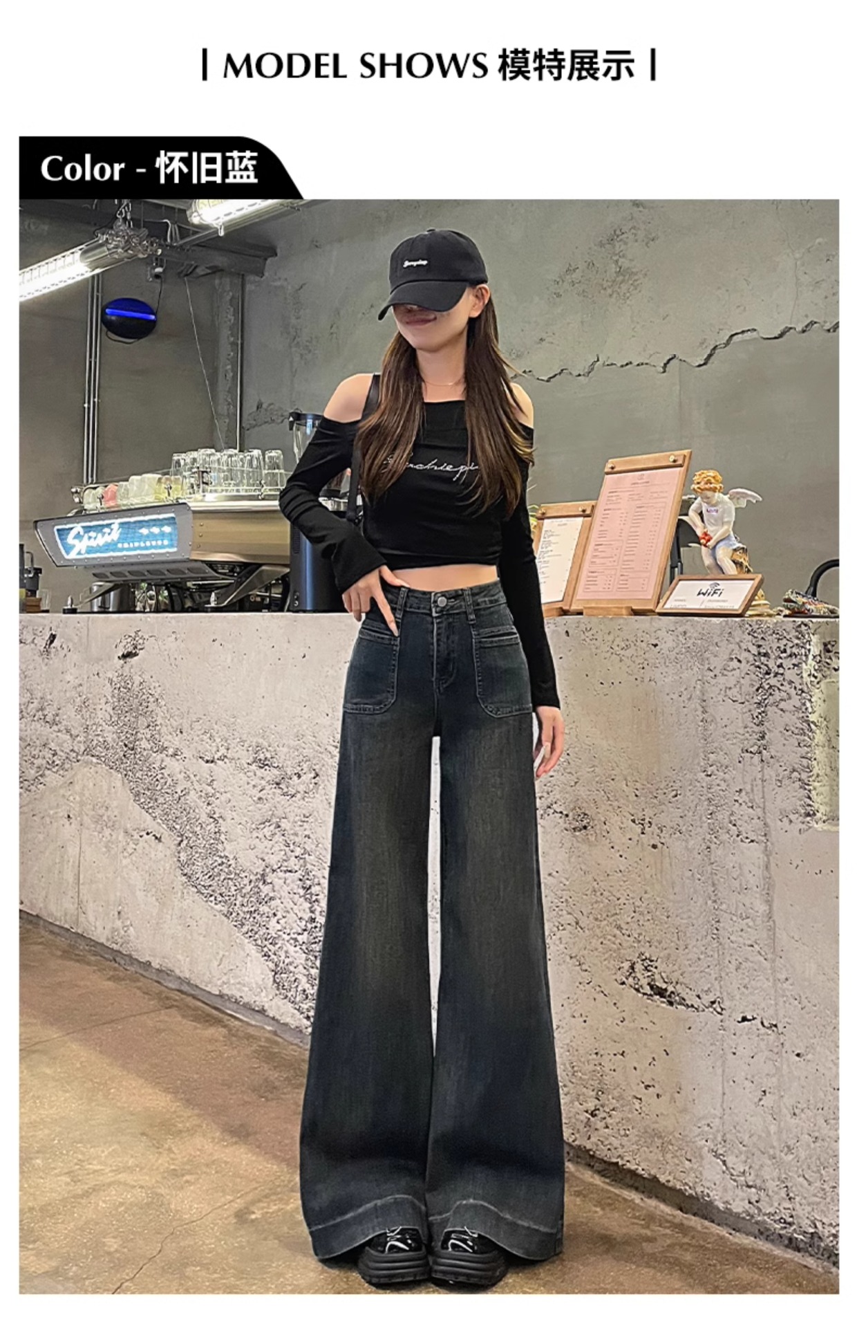향수 블루 높은 허리 넓은 다리 청바지 여성의 가을과 겨울 2024 새로운 느슨한 겨울 뿔 걸레 바지스토어 가기