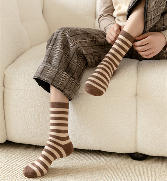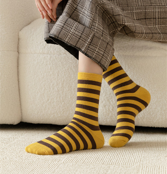 따뜻한 양모 여성 양말 가을과 겨울 새로운 두꺼운 일본 중간 배럴 줄무늬 중간 배럴 양말 봉제 부드러운 밀랍 양말 도매