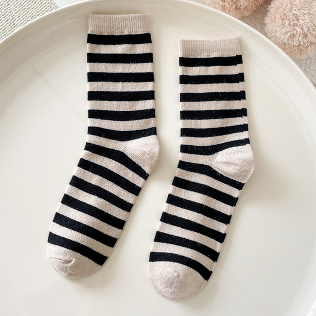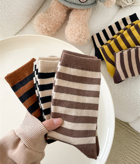 따뜻한 양모 여성 양말 가을과 겨울 새로운 두꺼운 일본 중간 배럴 줄무늬 중간 배럴 양말 봉제 부드러운 밀랍 양말 도매스토어 가기