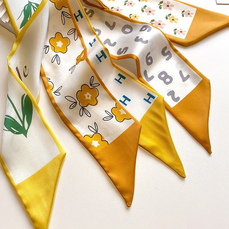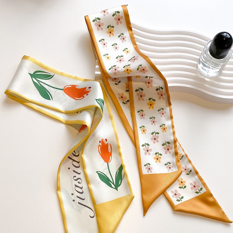 봄과 여름 빈티지 작은 실크 스카프 좁은 긴 스트립 장식 스카프 여성용 헤어 타이 백 양면 리본 인쇄 올매치 리본