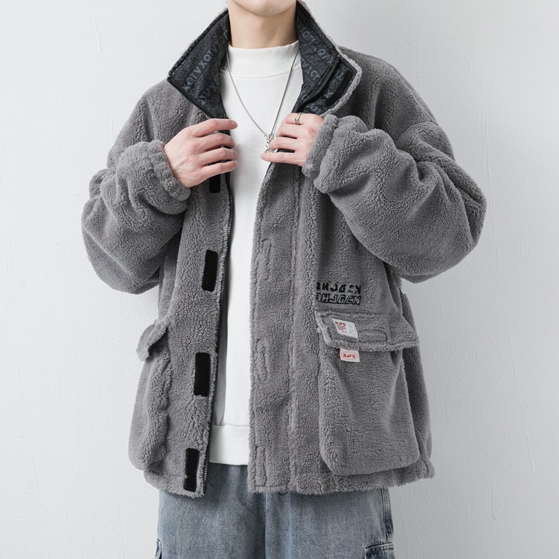 겨울 더블 페이스 착용 양고기 울 재킷 남성 패션 브랜드 2024 새로운 느슨한 두꺼운 코튼 코트 커플의 작업 세트스토어 가기