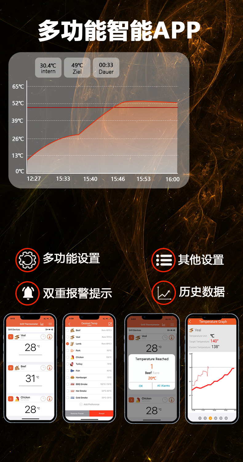 大显示屏和超亮背光:肉类温度计数字无线大液晶屏和大数字可减少视觉疲劳。无需 APP 即可在屏幕上读取丰富的信息:连接信号、电源指示器、当前温度、目标温度、进度指示器等。蓝牙肉类温度计无线背光功能可确保在黑暗或烟雾中清晰显示。