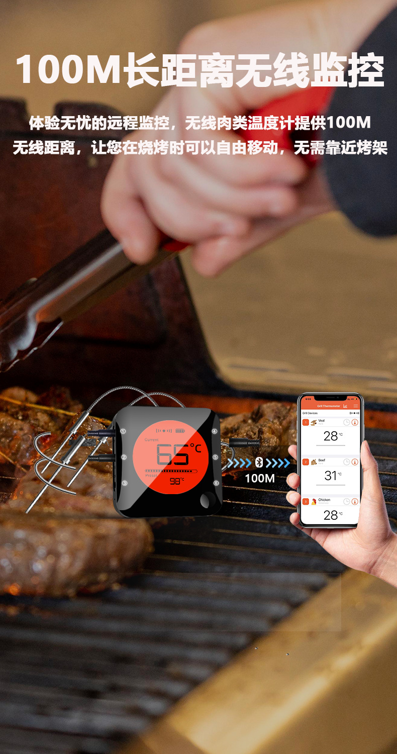 远程监控:蓝牙肉类温度计使用先进的蓝牙 5.2 技术提供稳定可靠的连接。328 英尺的无线范围非常适合您的距离要求,可随时随地在手机上监控食物;这款烟熏温度计非常适合喜欢烧烤、烧烤或熏制肉类并希望提高烹饪水平的任何人。